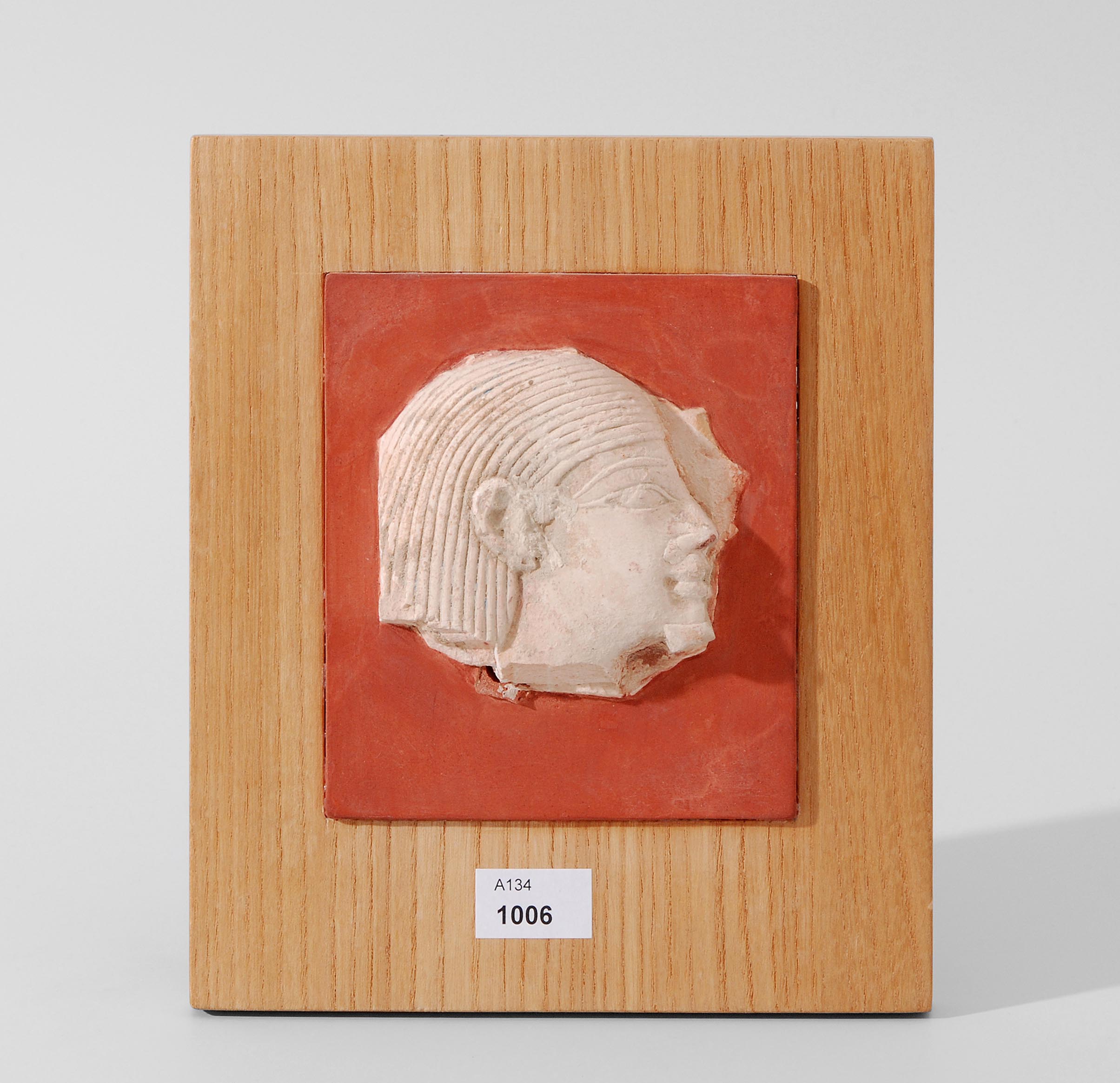 Aegypten, 18. Dynastie, 1402–1364 v. Chr. Kalkstein. Männlicher Kopf mit Strähnenperücke und Kinnbart. Das mandelförmige Auge passt in die Zeit von Amenophis III. L 7, B 7,5 cm. Auf Tonplatte montiert.