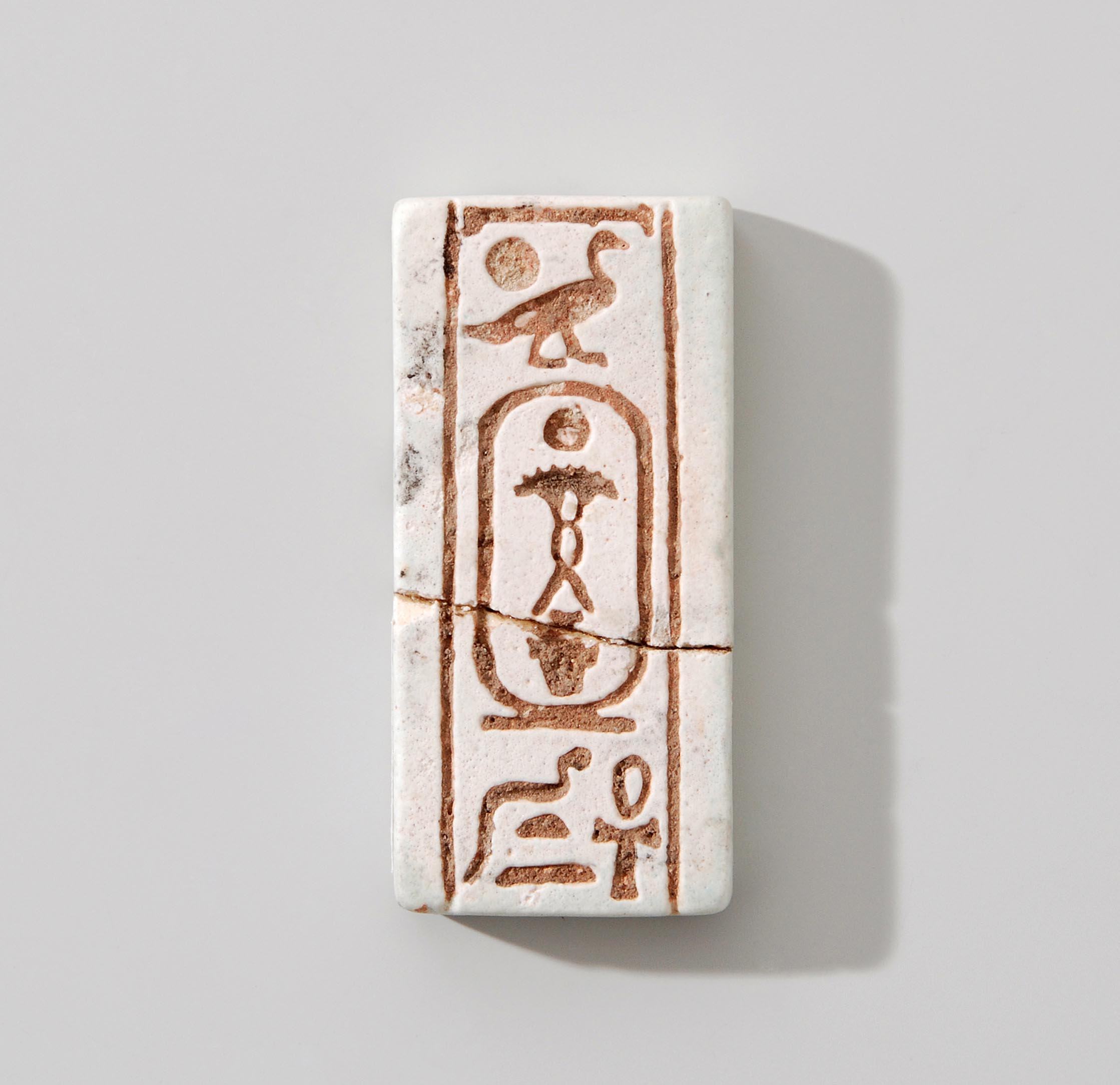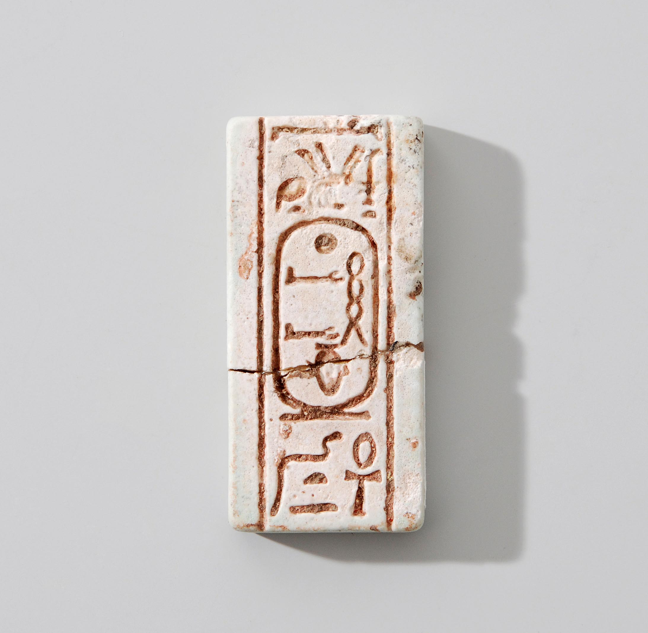 Aegypten, 26.Dynastie, 595–589 v. Chr. Fayence. Kartusche mit dem Namen von Apries, beidseitig beschriftet: "König von Ober- und Unterägypten, Haaibra (Apries), dem ewiges Leben gegeben ist" bzw. "Sohn des Re, Ouahibra (Apries), dem ewiges Leben gegeben ist". Geklebt, berieben, bestossen. 4,8x2,3 cm.