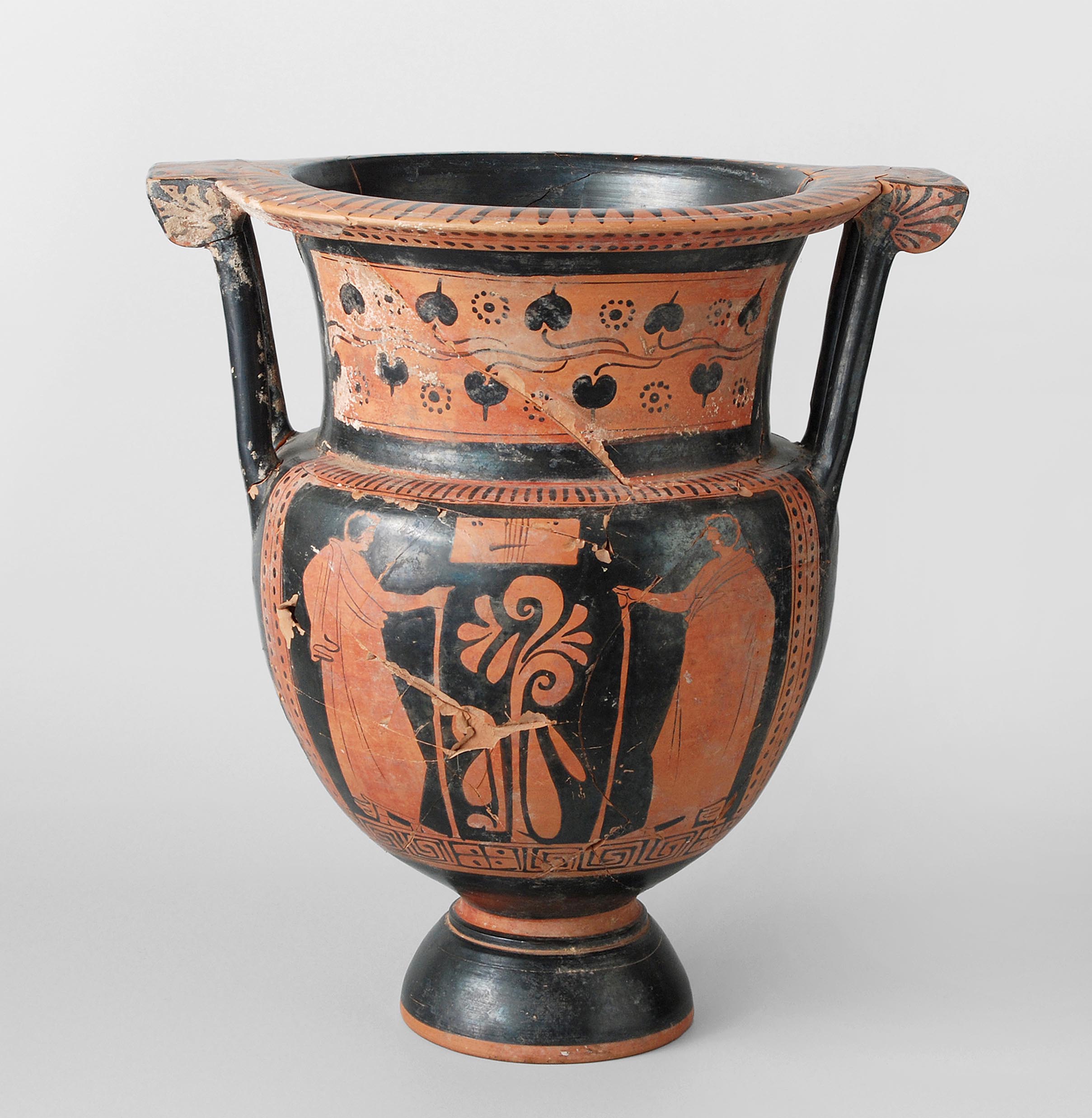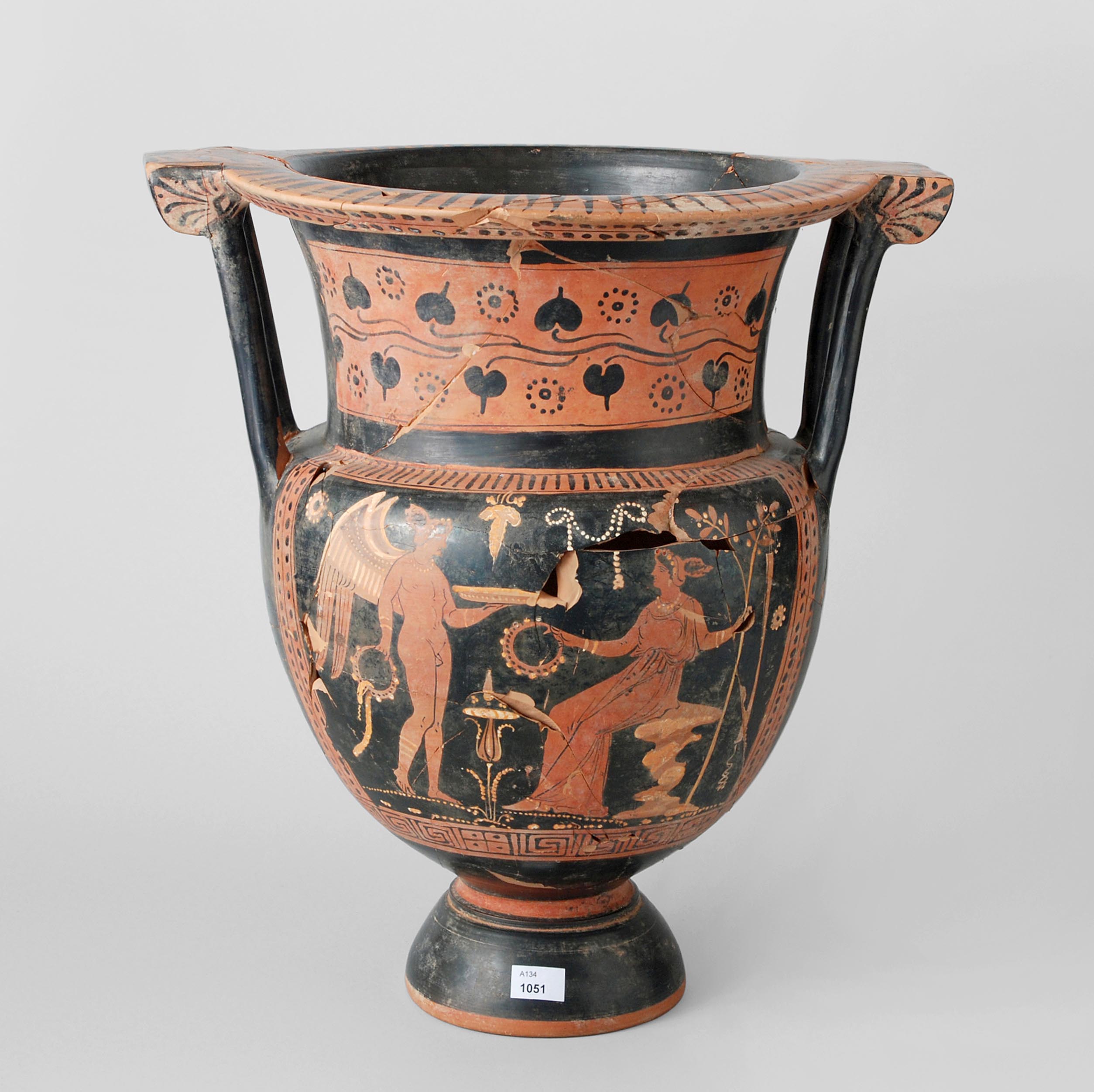 Unteritalien, 4.Jh. v. Chr. Rotfigurig. Stehender, unbekleideter Eros mit Tympanon in der Rechten und Phiale in der Linken. Ihm gegenüber sitzend, junge Frau mit Tympanon in der Rechten. Rückseite: zwei Jünglinge in Chiton mit Stab stehen sich gegenüber. Aus mehreren Teilen wieder zusammengesetzt, Fehlstellen. H 40 cm.