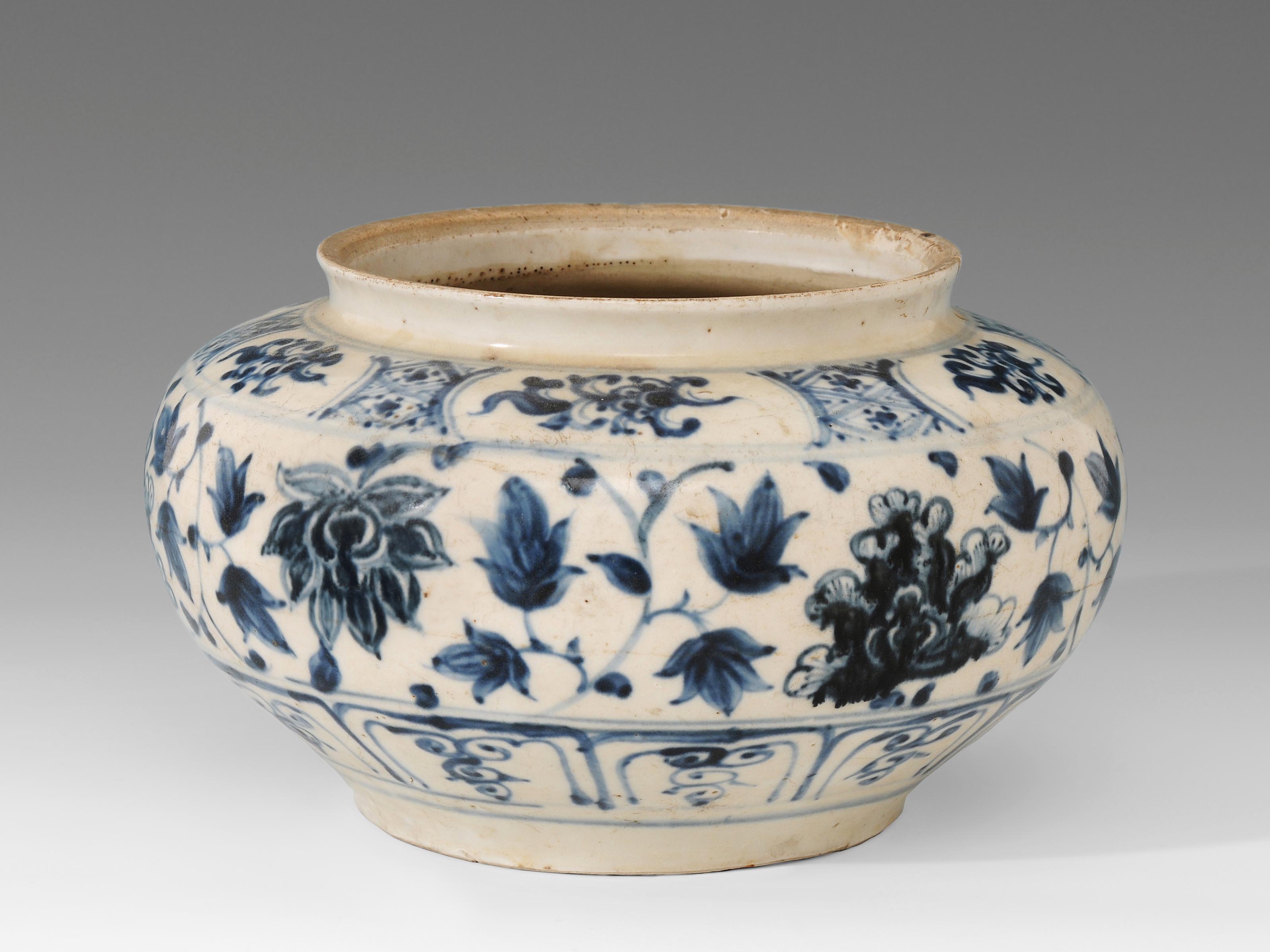 Annam, Vietnam. 15.–17.Jh. Steinzeug. Unterglasurblauer Lotosblumendekor. Am Boden mit rotbrauner Engobe überzogen. Bestossen. H 13,5 cm.