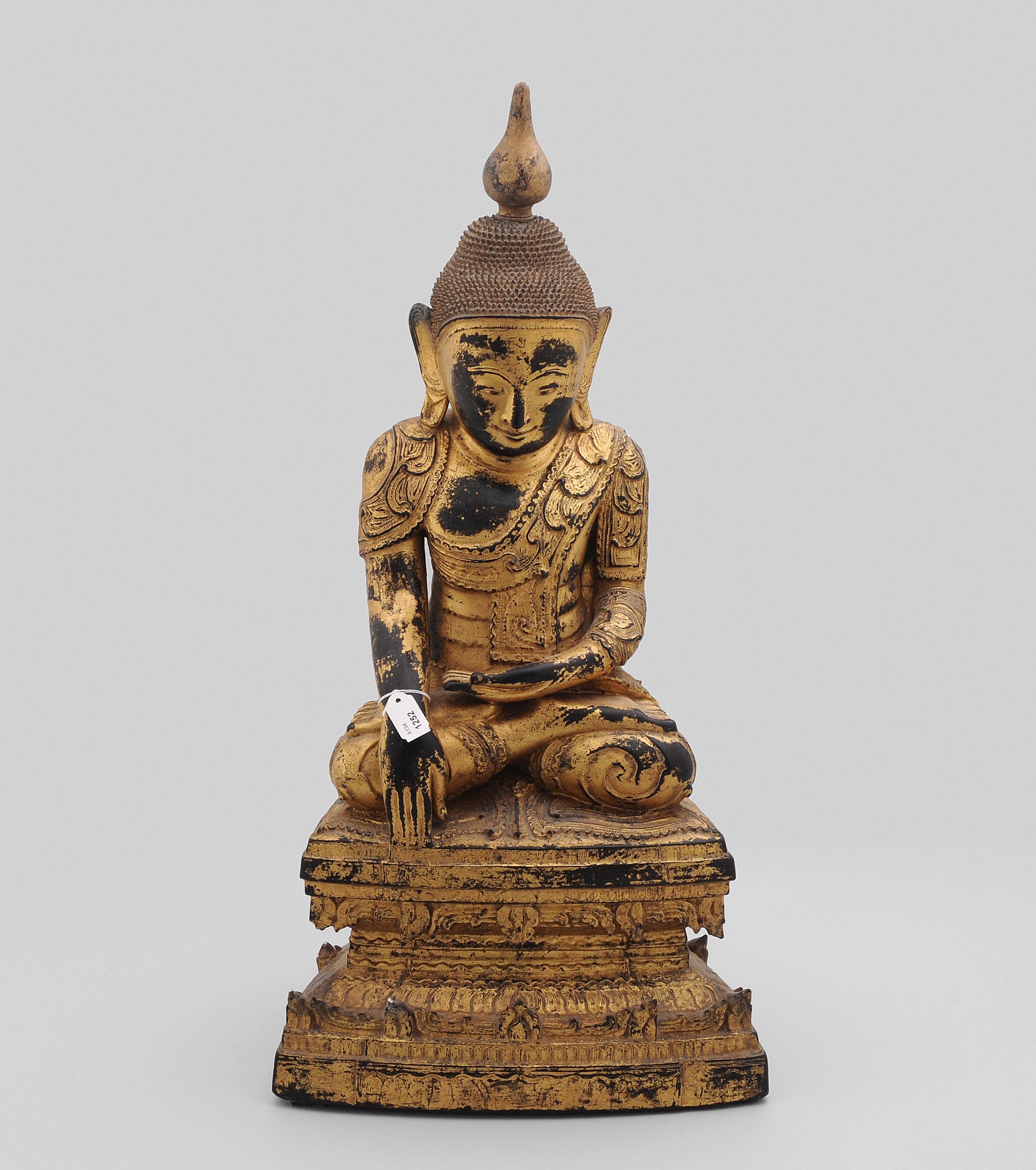 Burma, 19.Jh. Holz, gold lackiert. Shakyamuni sitzt in Maravijaya auf hohem Sockel. Altersspuren. H 59cm.