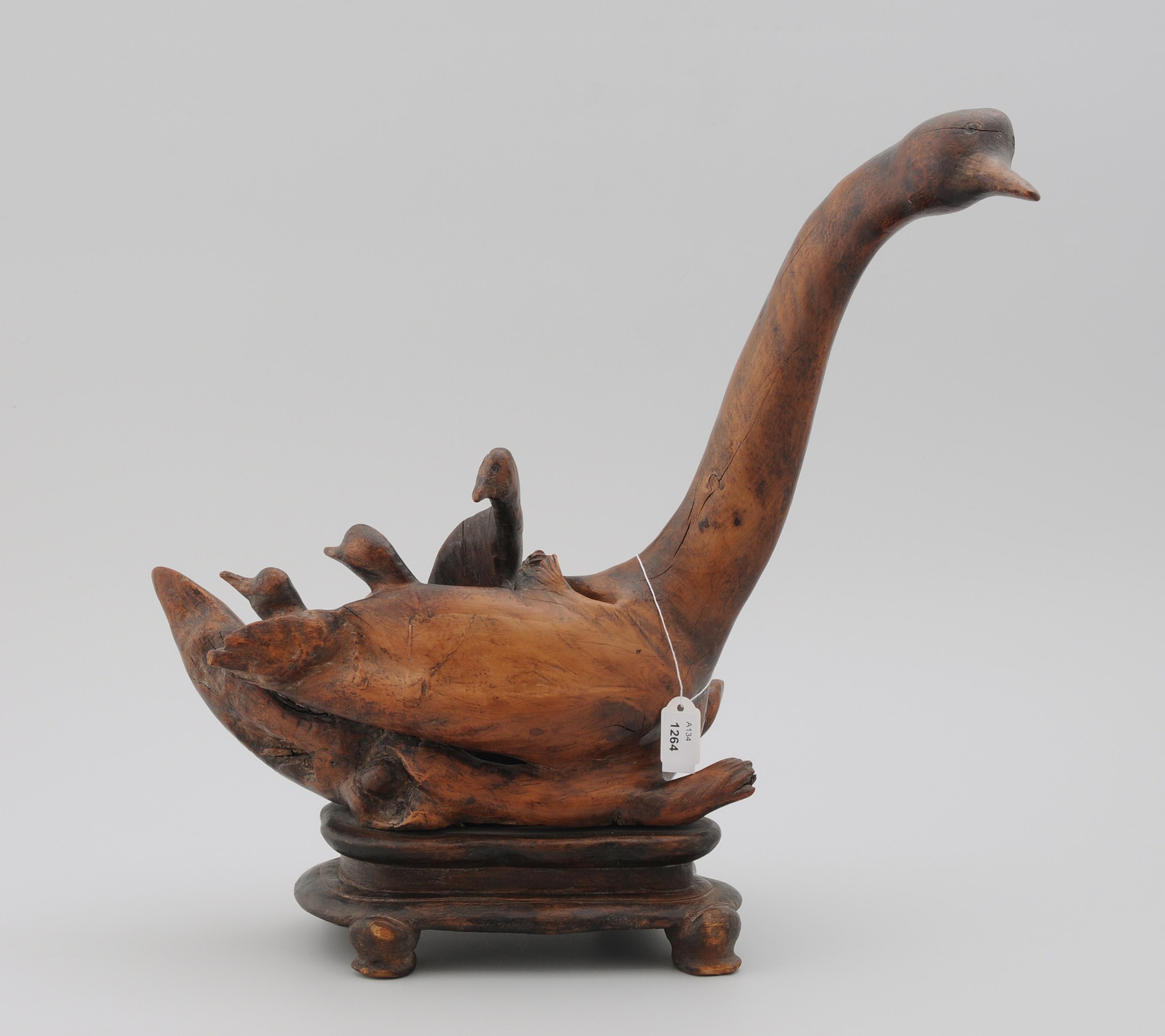 China, 20.Jh. Wurzelholz. Entenvogelfamilien beschnitzt als Gefäss. Auf Holzsockel montiert. Risse. H 36 cm.