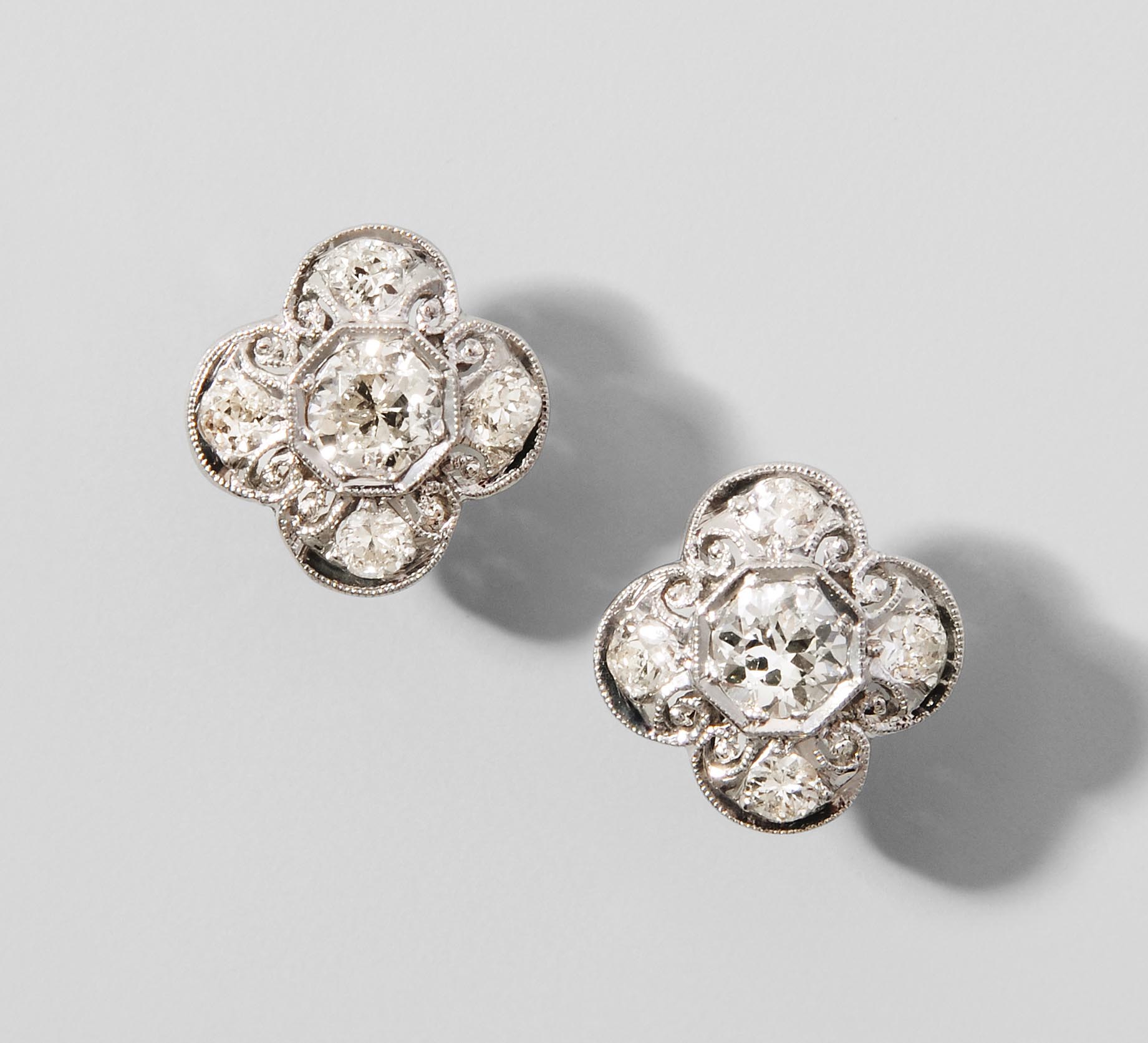 950 Platin/750 Weissgold. Entzückende Ohrstecker in Vierpassmotiv. Im Zentrum je 1 Diamant von zus. ca. 0.70 ct, umgeben von je 4 Diamanten von zus. ca. 0.50 ct, H–I/si. Schraubsystem. 4,2 g.