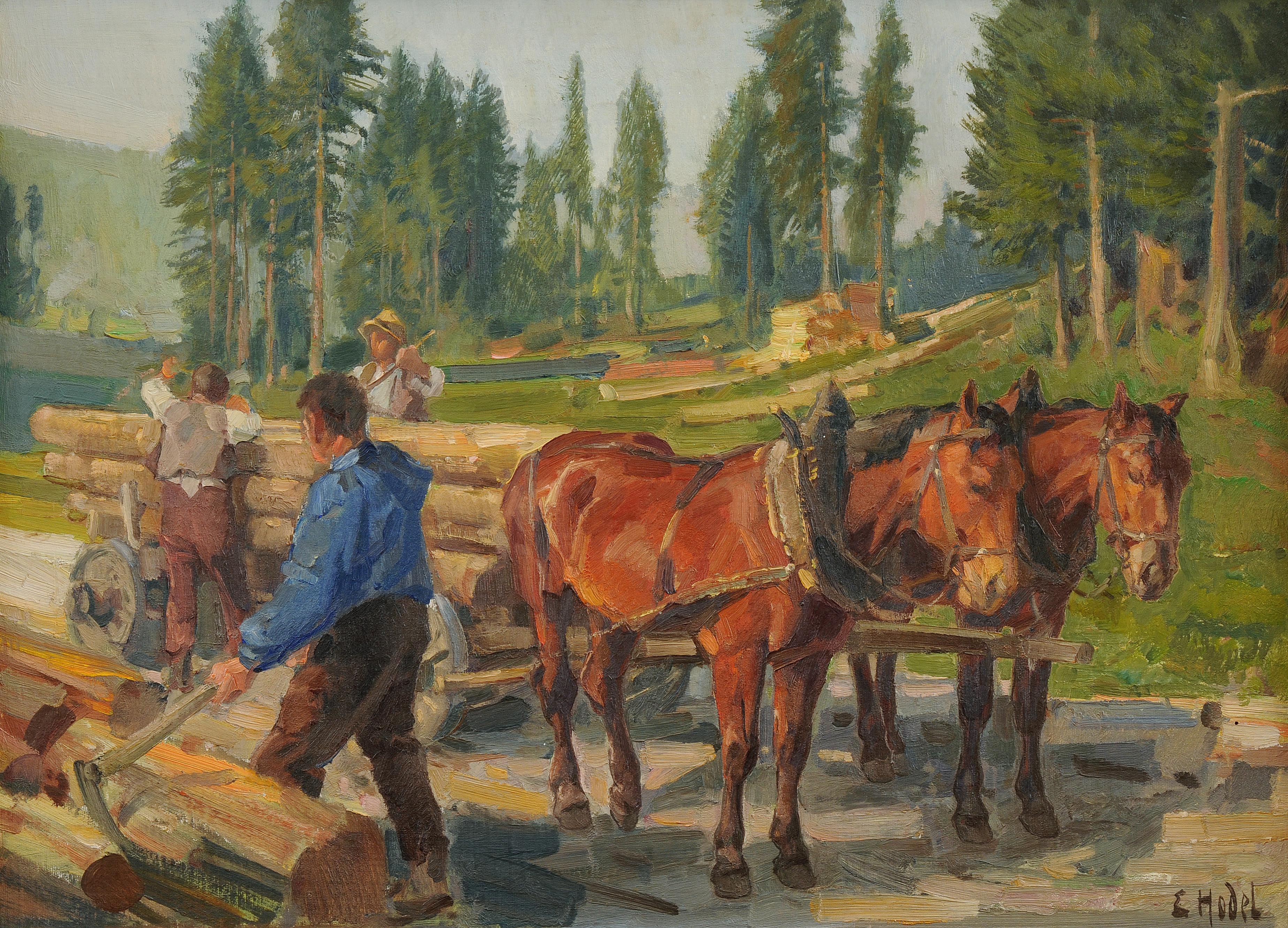 Holzfäller mit Pferdegespann. Öl auf Malplatte. Unten rechts signiert. 50x68 cm.