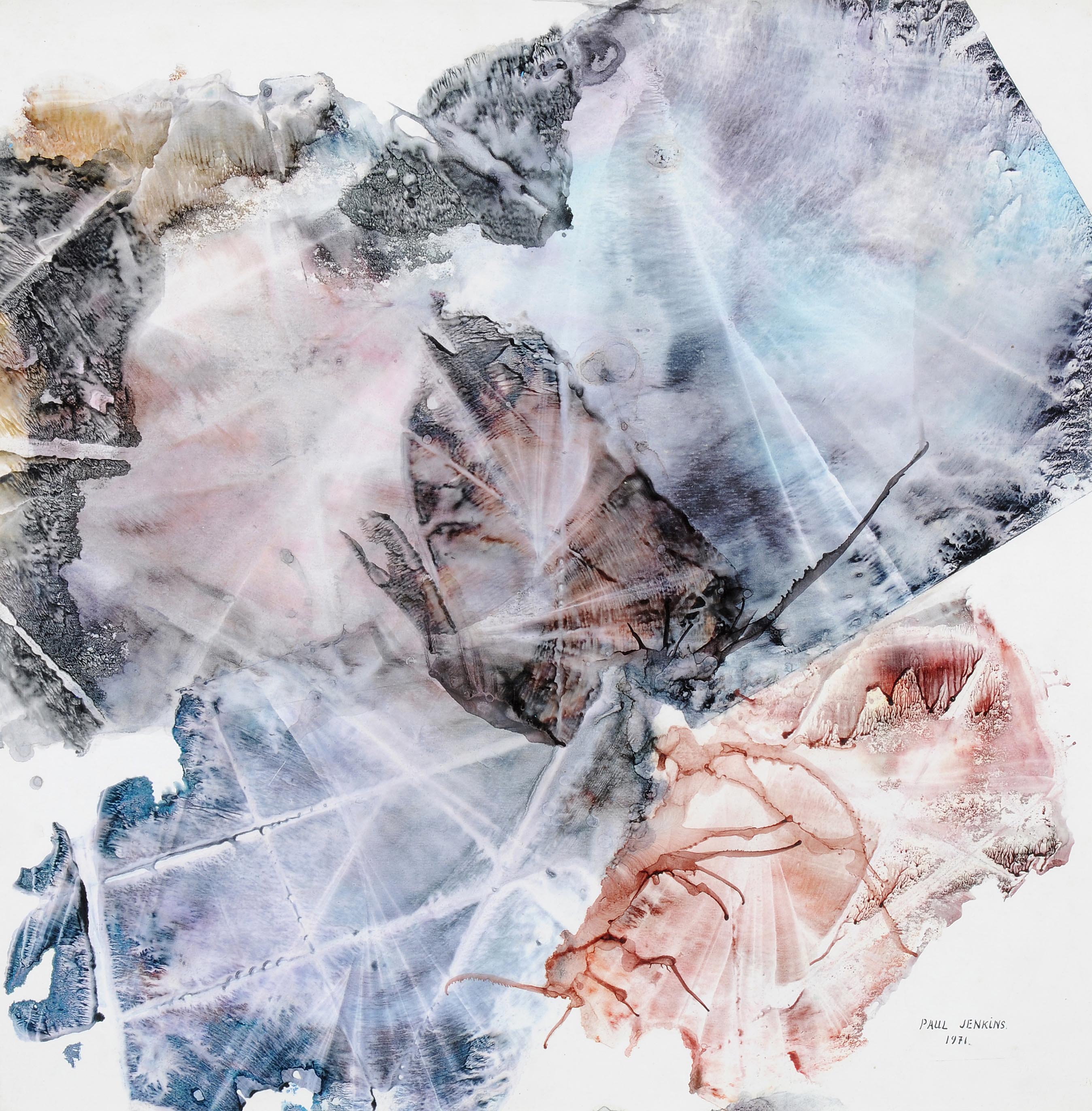 Ohne Titel. 1971. Abklatsch auf Karton. Unten rechts in Tusche signiert und datiert. Kartongrösse 44x44 cm. Gerahmt. -Ränder und Ecken leicht bestossen. Minimster oberflächlicher Abrieb.