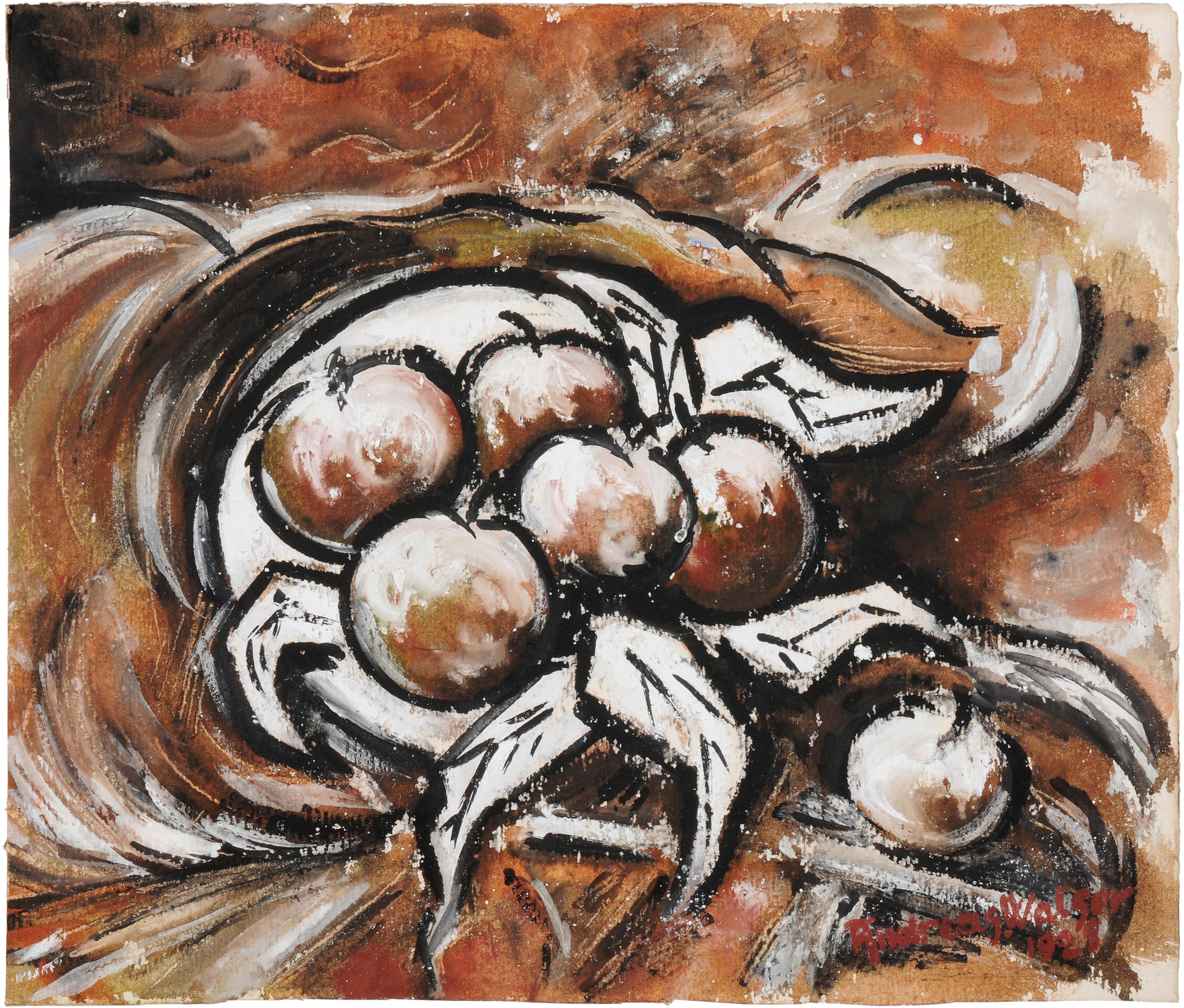Stillleben mit Äpfeln. 1928. Mischtechnik auf Papier. Unten rechts signiert und datiert. Blattgrösse 23,4x27,5 cm. Gerahmt. -Blatt leicht gebräunt. Ränder minimst bestossen. Farbe teils am Absplittern.