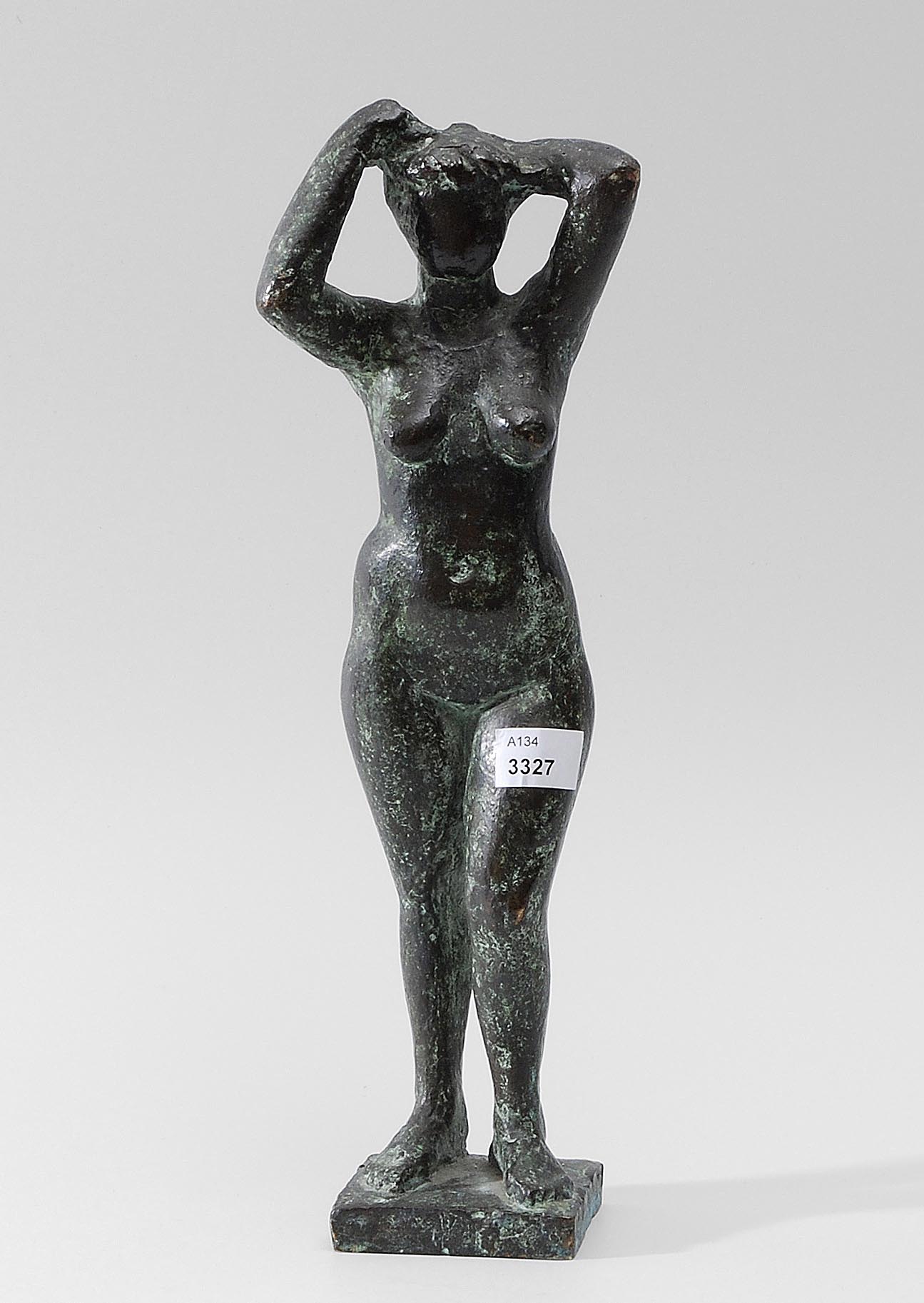 Weiblicher Akt mit Armen über dem Kopf. Bronze. 4/3?. Auf dem Bronzesockel signiert mit unleserlicher Nummerierung. Höhe 30 cm. -Patina.