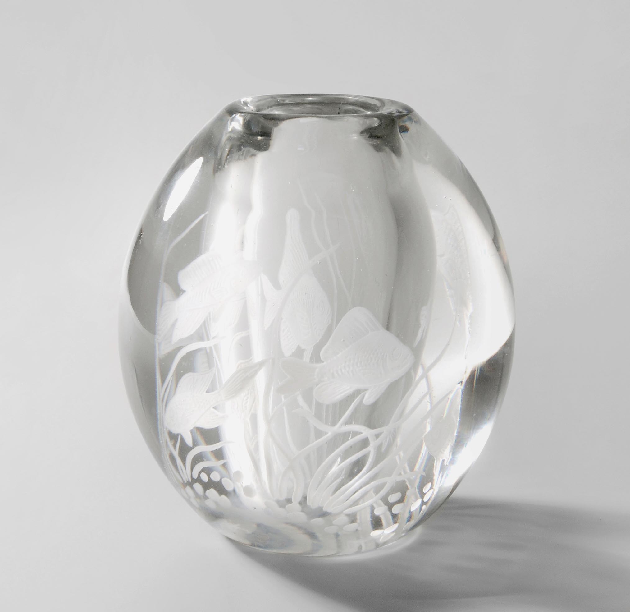 Entwurf: Edward Hald um 1948. Farbloses Überfangglas mit Fischdekor in Mattschnitt. Bezeichnet: Orrefors Sweden, Graal, Nr. 1429B, Edward Hald. H 11 cm.