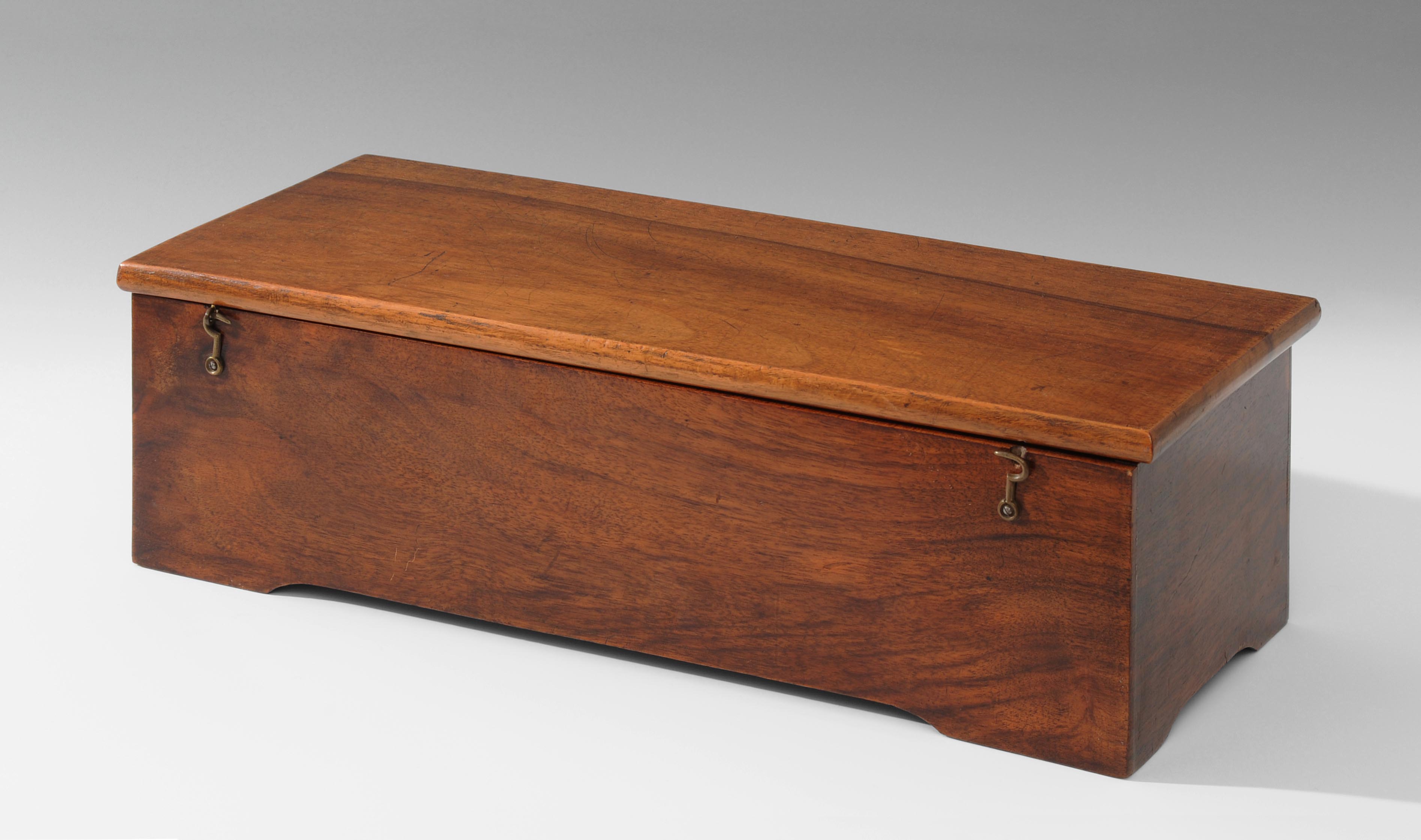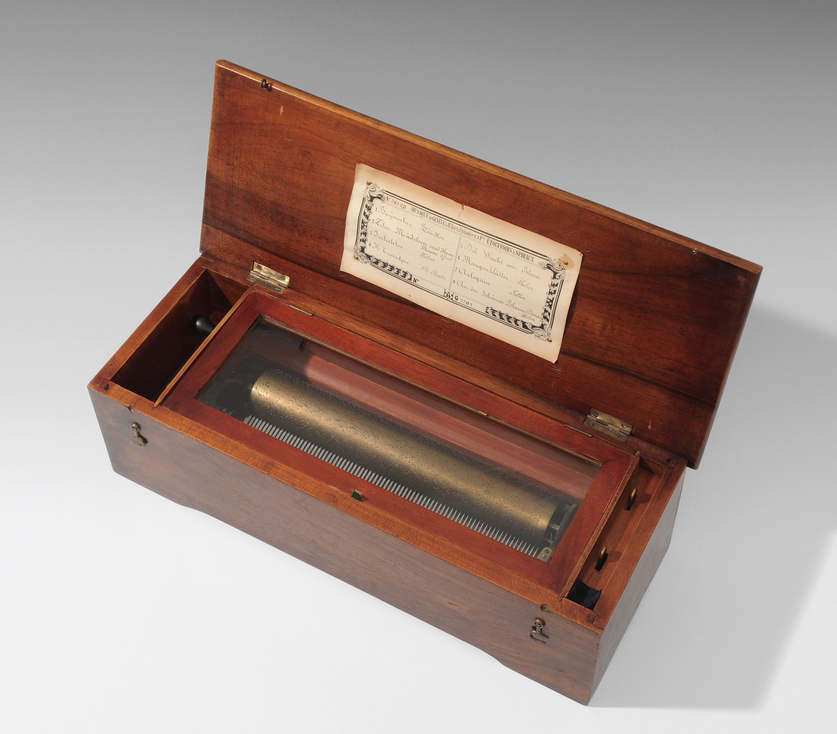 Westschweiz, Genf, Mitte 19.Jh. Werk-Nr. 34598. Holzgehäuse mit Nussbaum-Furnier. Unter Glasdeckel Messingzylinder von 30 cm Länge. Mit 1 Kamm und Rätschenaufzug. Spielt 8 Melodien. Handgeschriebener Melodienzettel im Deckelinnern. 51,5x19,5x15 cm.