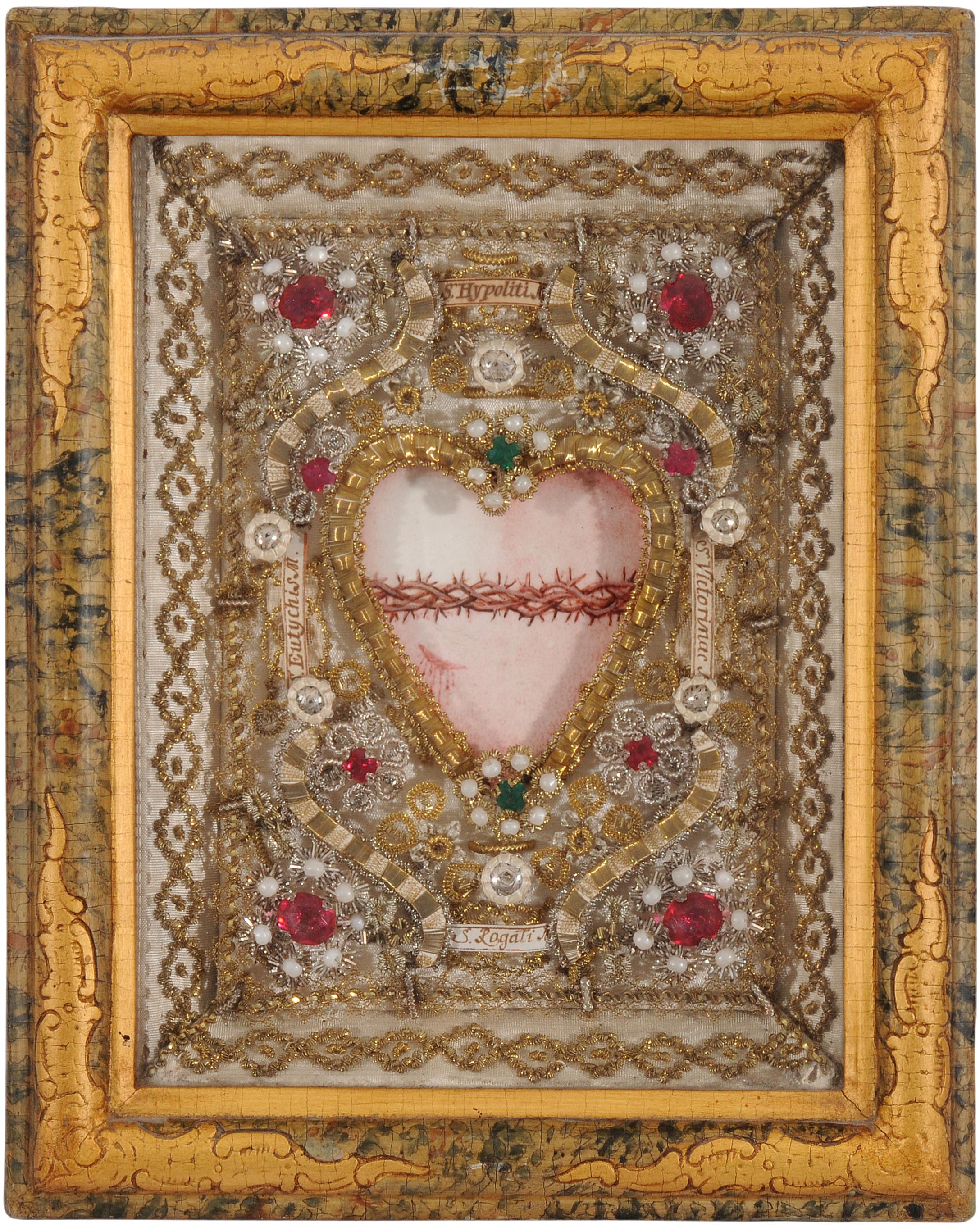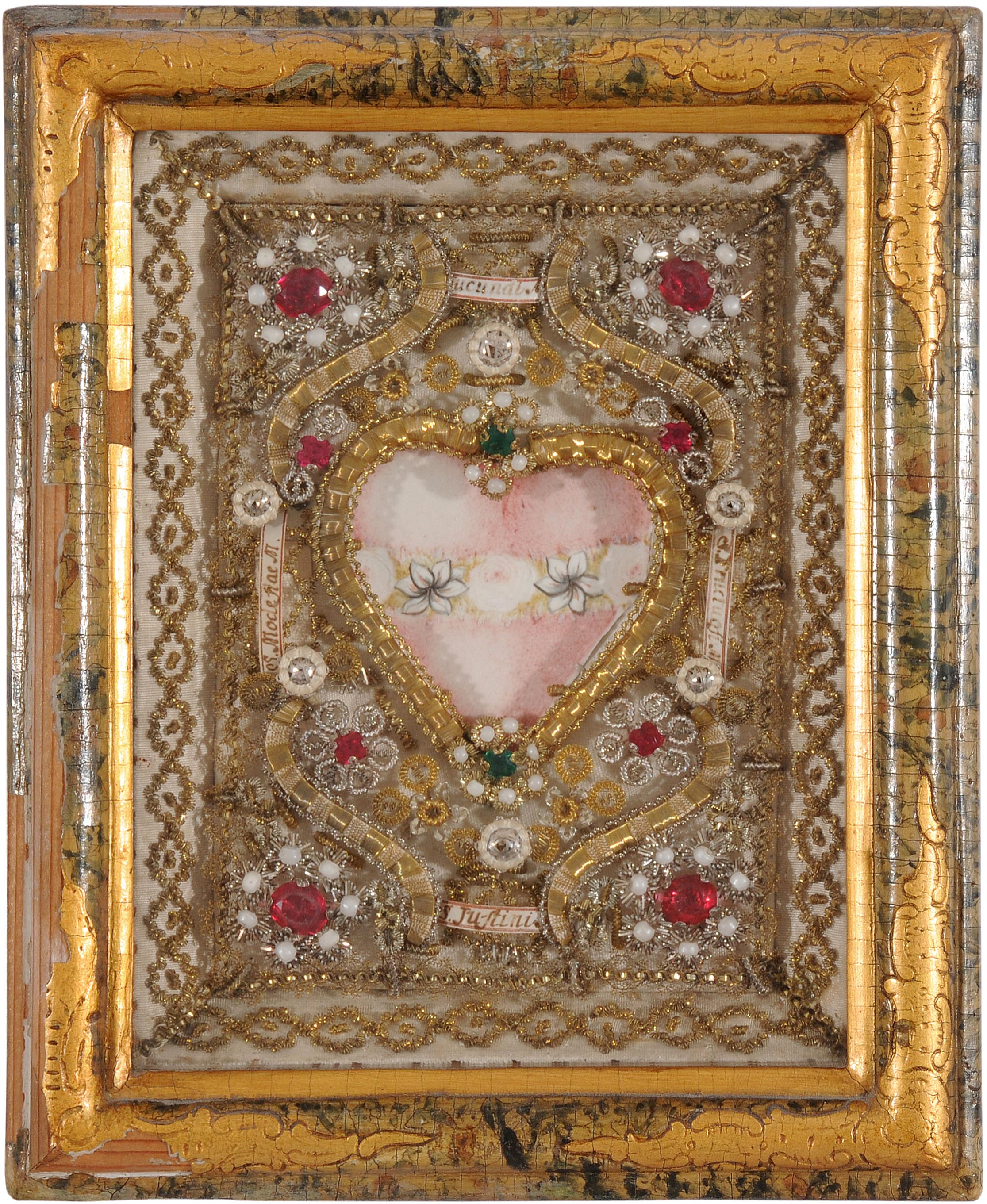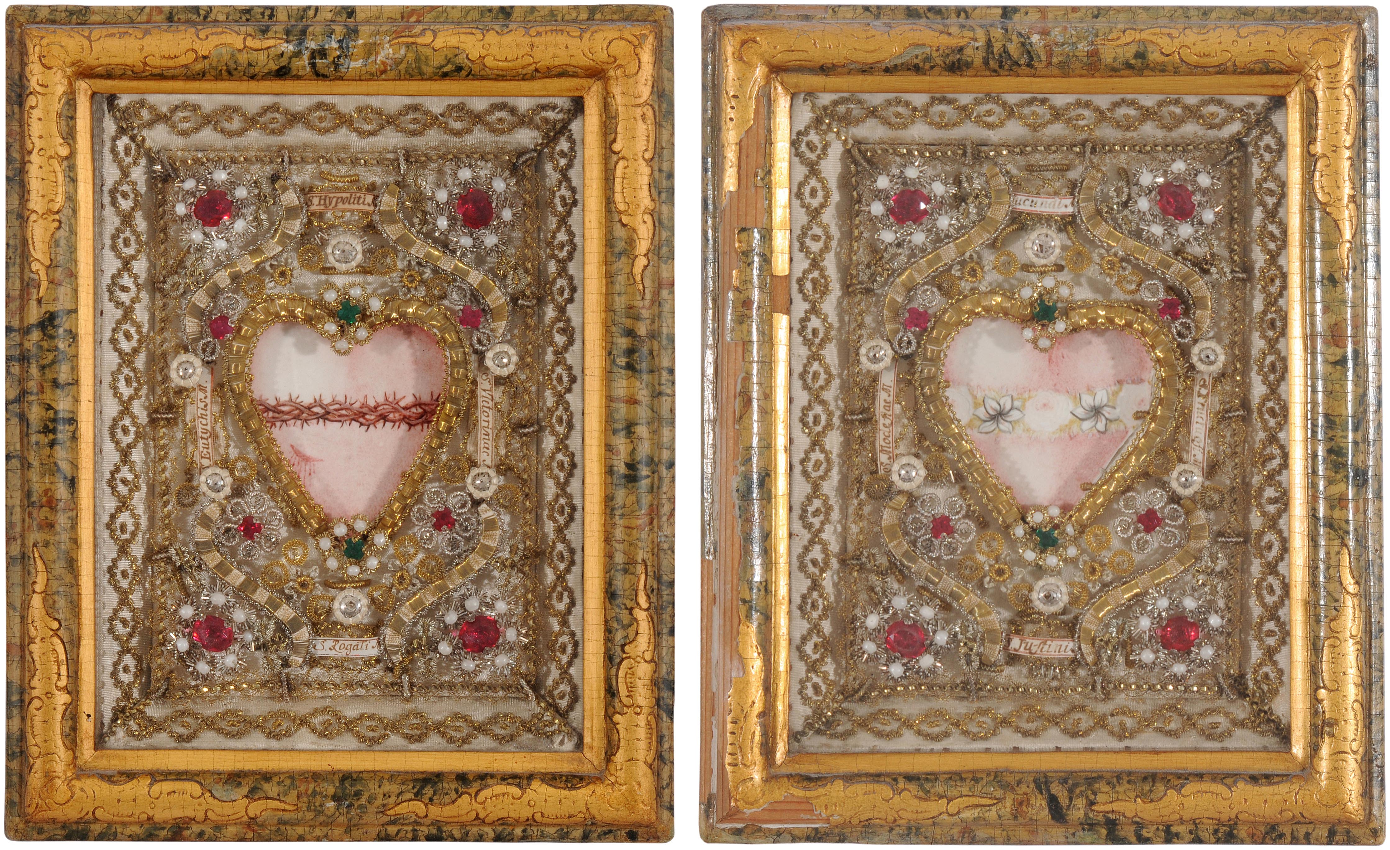 Alpenländisch, 19.Jh. Im Zentrum je eine Pergament-Miniatur, das Herz Mariae bzw. Herz Jesu darstellend. Eingefasst von aufwändiger Drahtarbeit, geschmückt mit Imitationsperlen und farbigen Glassteinen. 4 Reliquienpartikel mit handschriftlich bezeichneten Cedulae. Gerahmt. 24x19,5 cm.