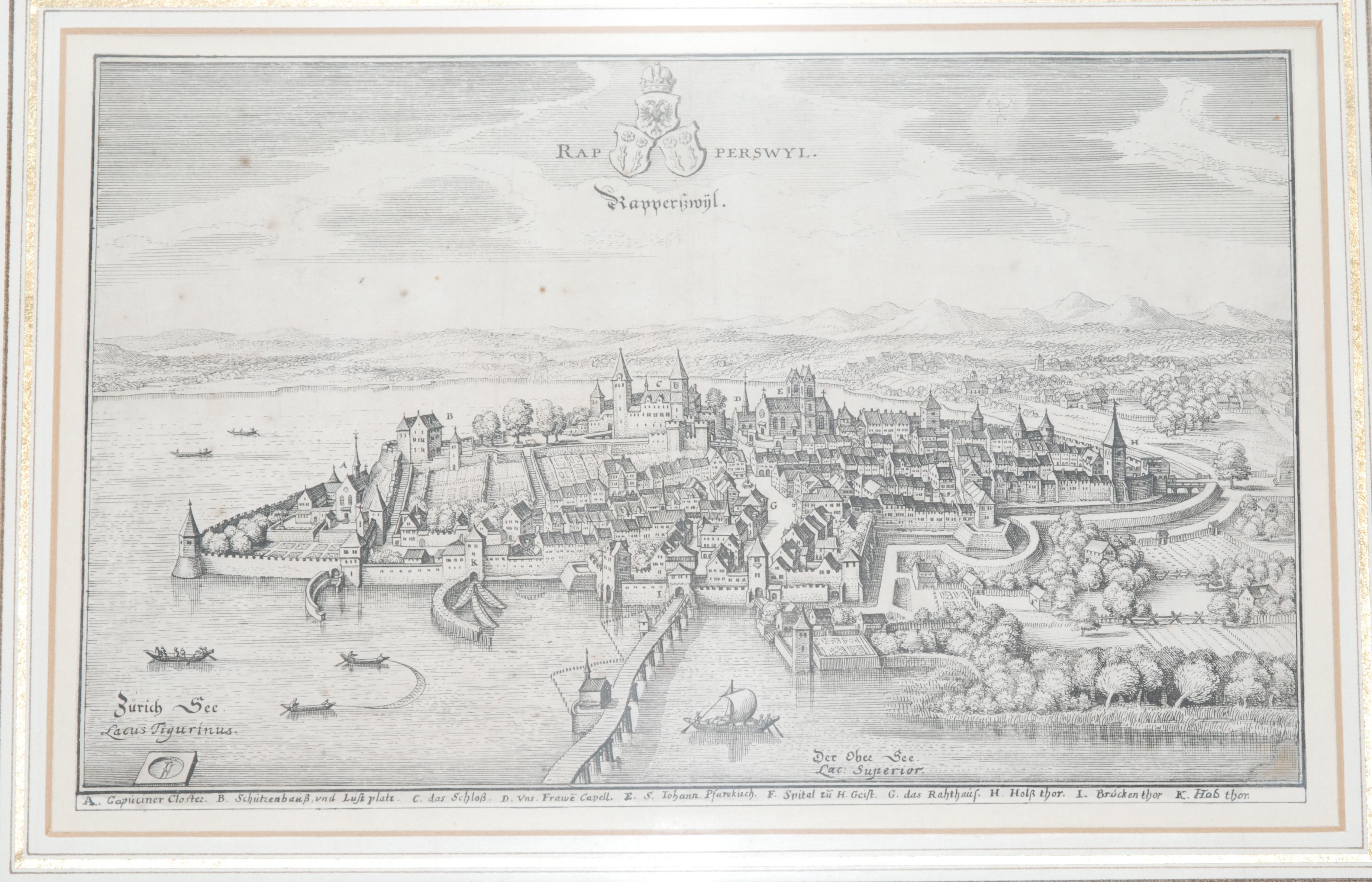Rapperswyl. Rapperschwyl. Radierung von Matth. Merian, 1655. 20x32 cm. Gerahmt.