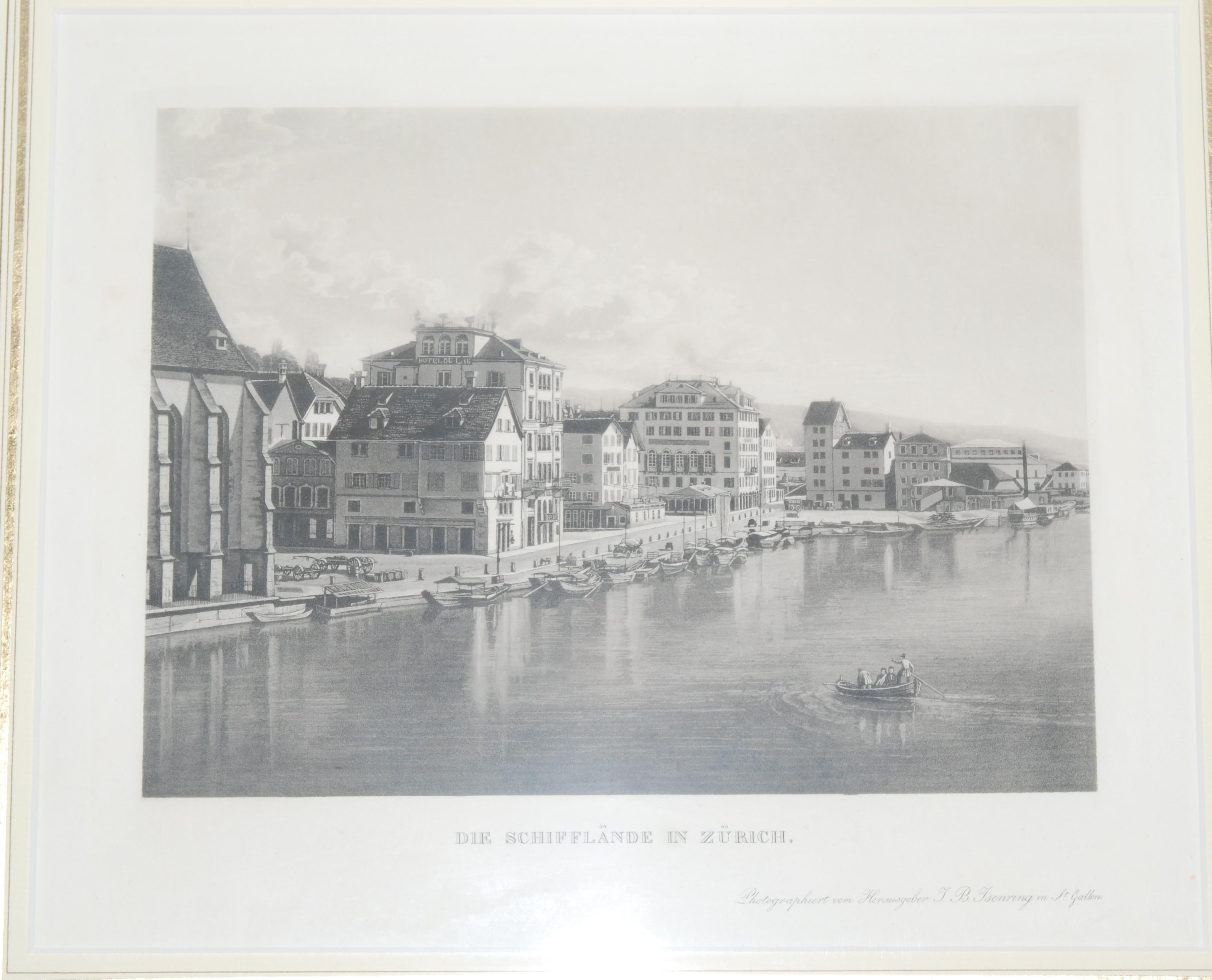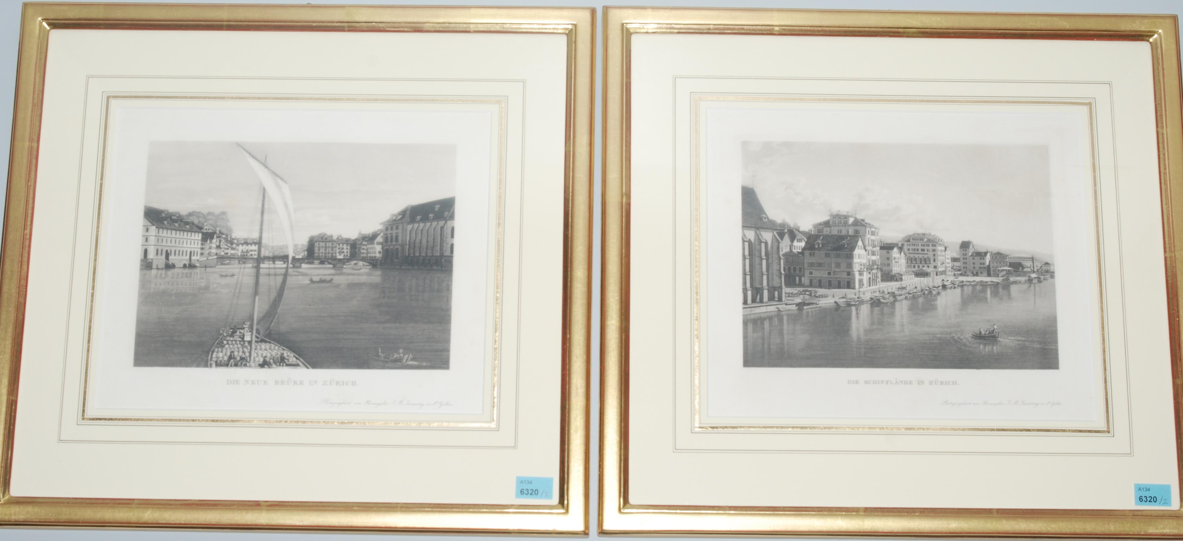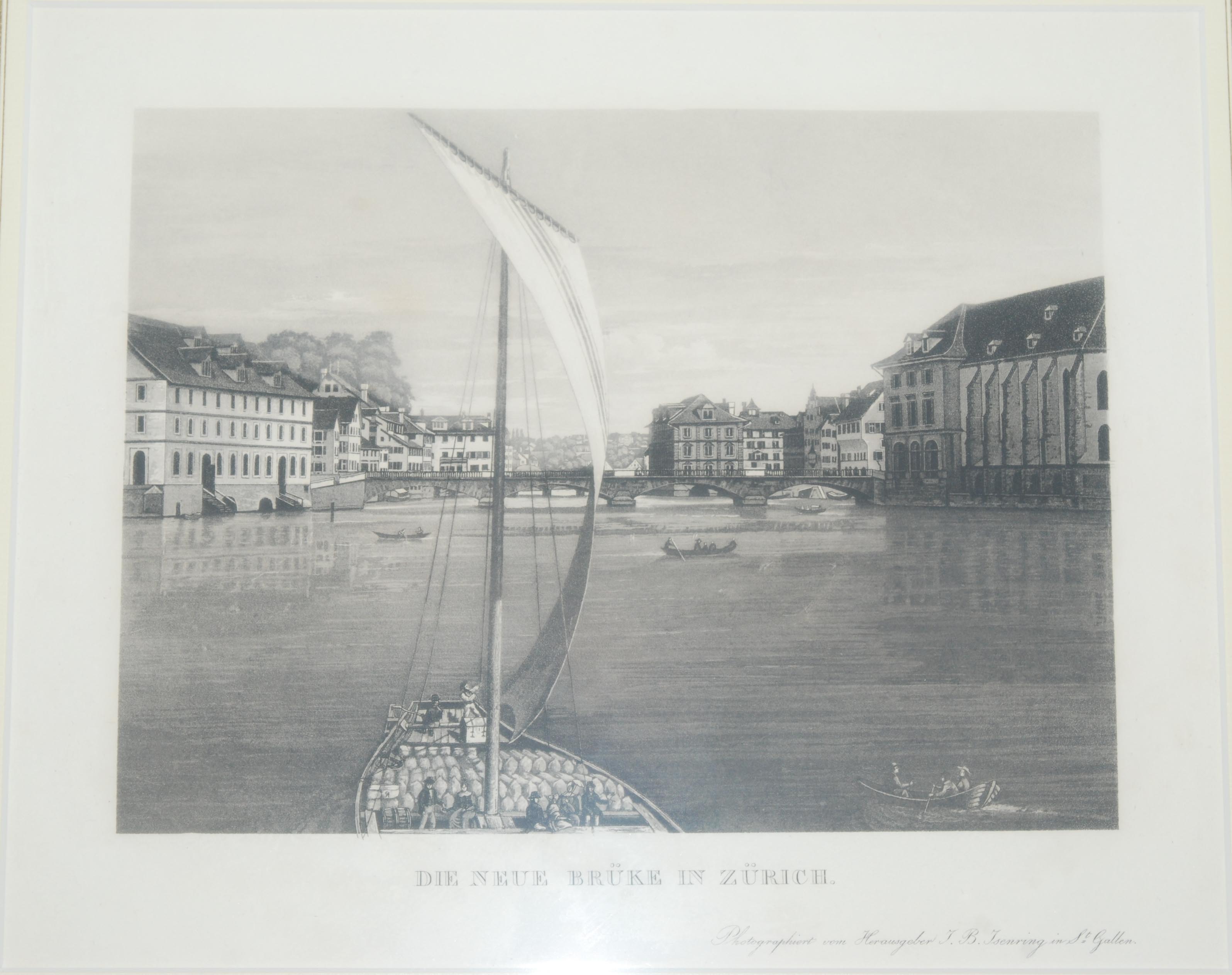 Gegenstücke. Die Schifflände in Zürich. / -Die neue Brücke in Zürich. 2 Aquatintas von J.B. Isenring nach eigenen Daguerreotypien, 1841. Je ca. 16,2x21,7 cm. Gerahmt. -J.B. Isenring hat (neben einem Portrait seines Sohnes) insgesamt vier Blätter, mit Ansichten von Zürich, in Aquatintamanier nach eigenen Daguerreotypien gefertigt.