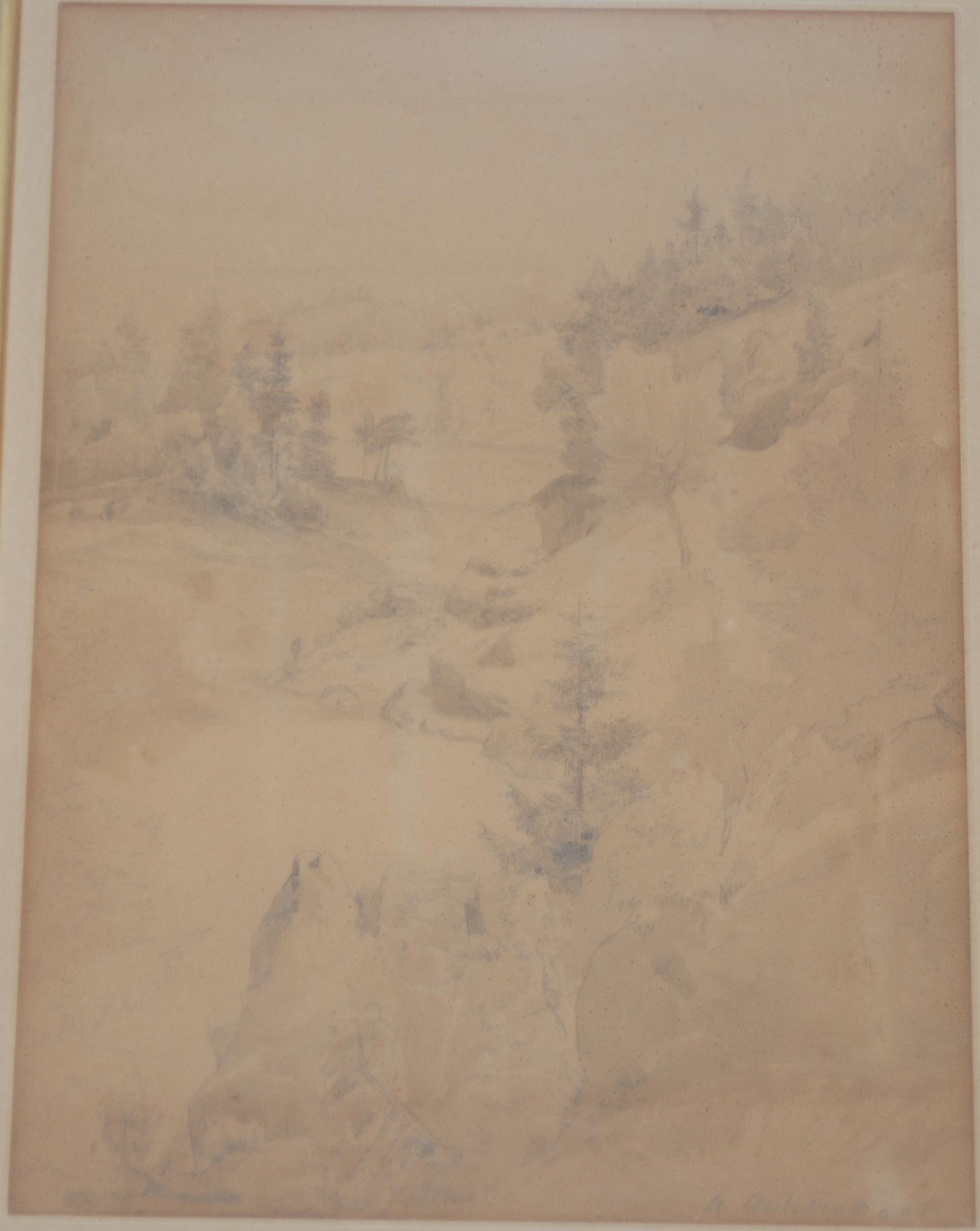 Fels- und Baumstudie bei den Trollhättanwasserfällen in Schweden. Bleistift, laviert. Unten rechts signiert. 33,4x24,7 cm. Gerahmt.