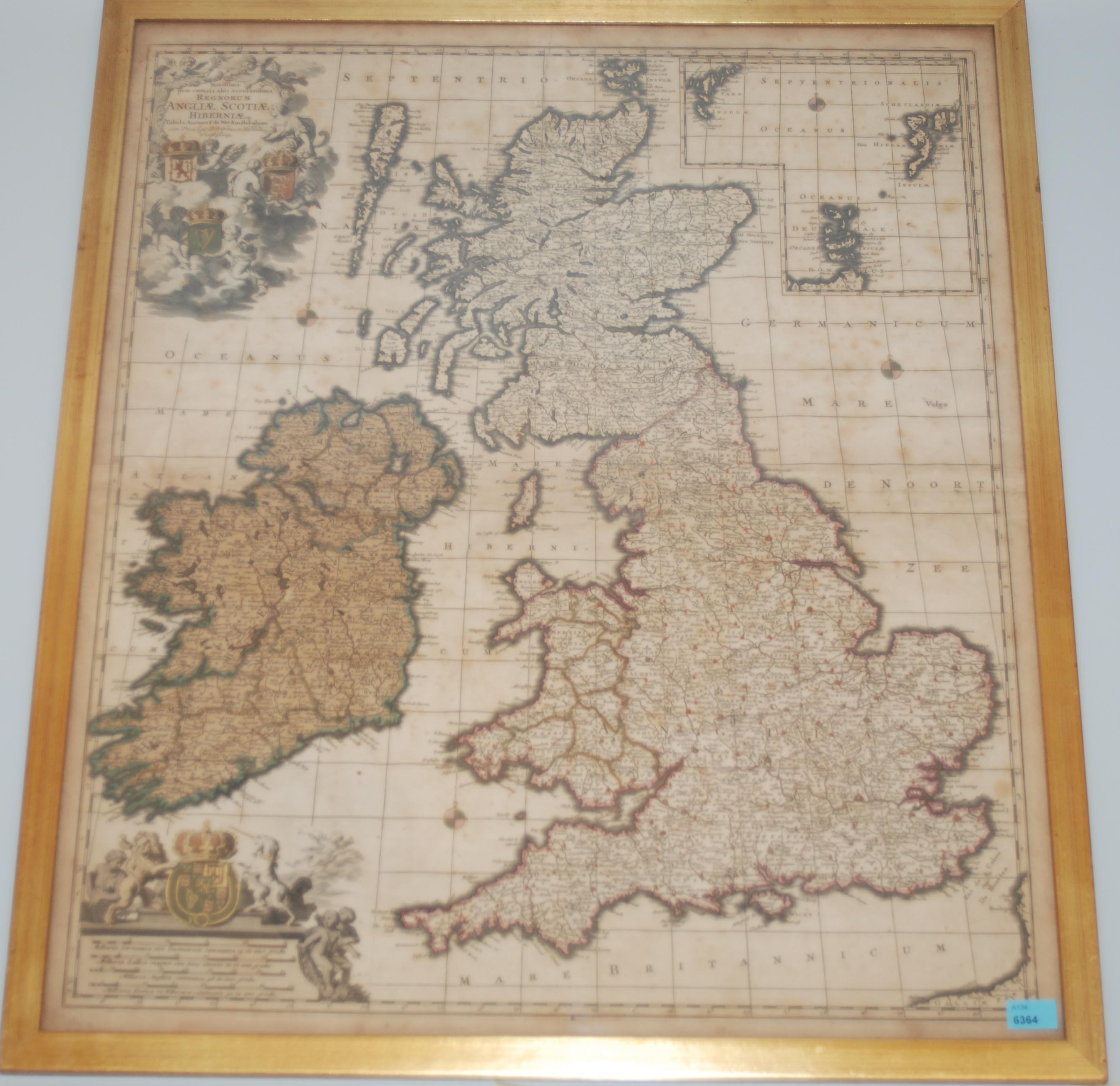 Regnorum Angliae, Scotiae Hiberniae. Kol. Kupferstichkarte, mit kol., goldgehöhten Wappenkartuschen, von F. de Wit, um 1680. 59x49,5 cm. Gerahmt.