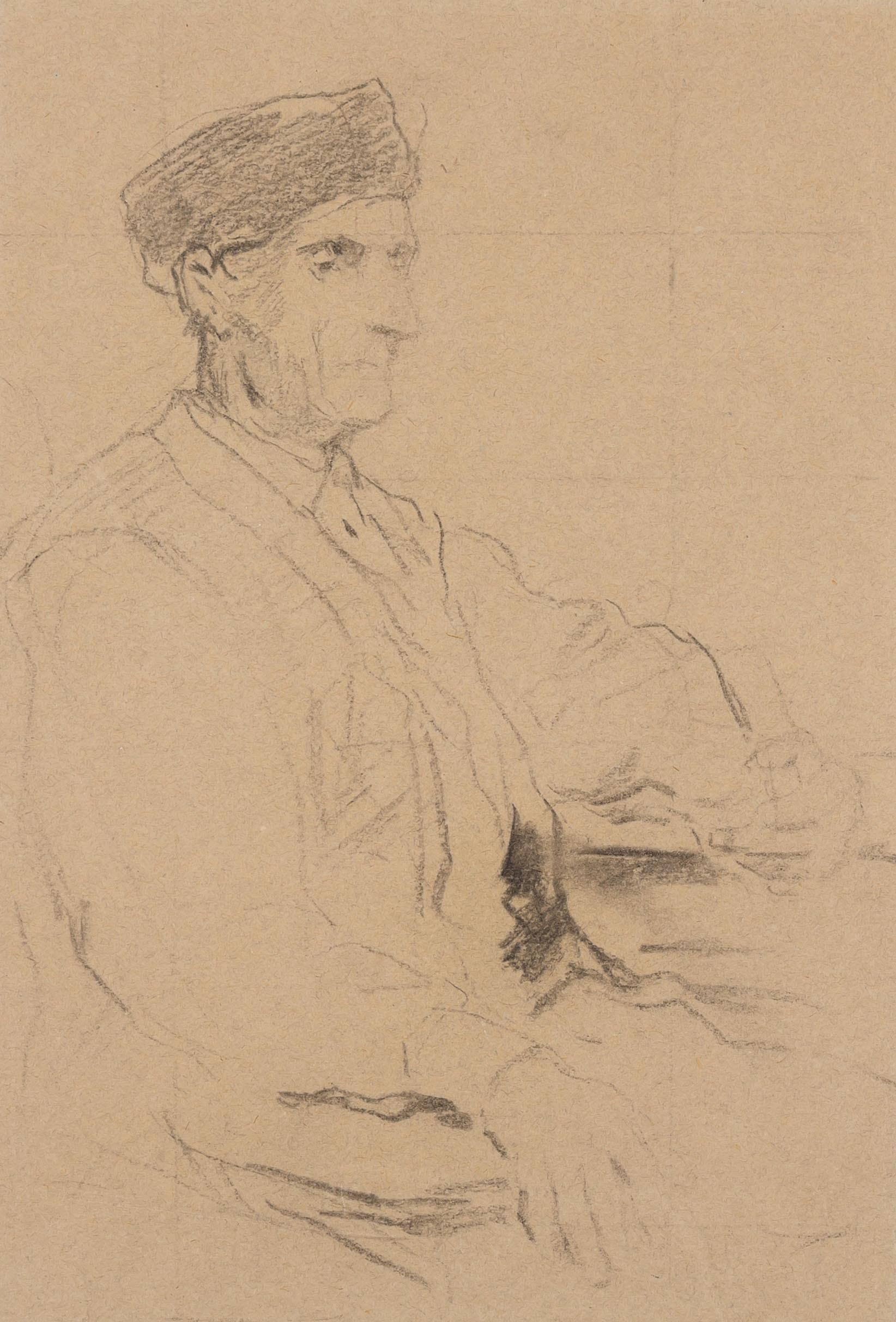 Am Tisch sitzender, Pfeife rauchender alter Mann (recto) / Am Tisch sitzender alter Mann (verso). Kohlestiftzeichnungen, die rückseitige quadriert. Ca. 33x22,5 cm. Beidseitig verglast gerahmt. – Lichtrand.