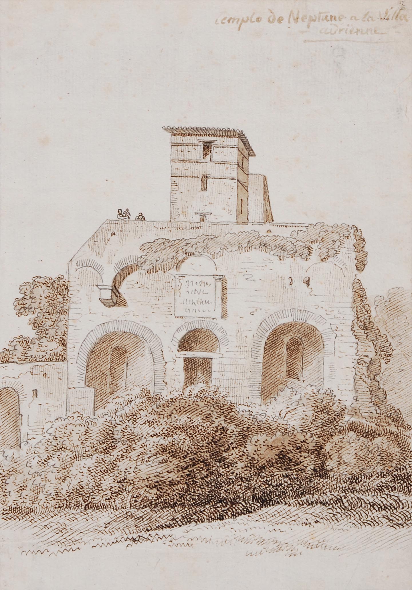 Neptuntempel bei der Hadriansvilla bei Tivoli. Lavierte Federzeichnung, bezeichnet oben rechts "temple de Neptune a la villa adrienne". 19x12,6 cm.