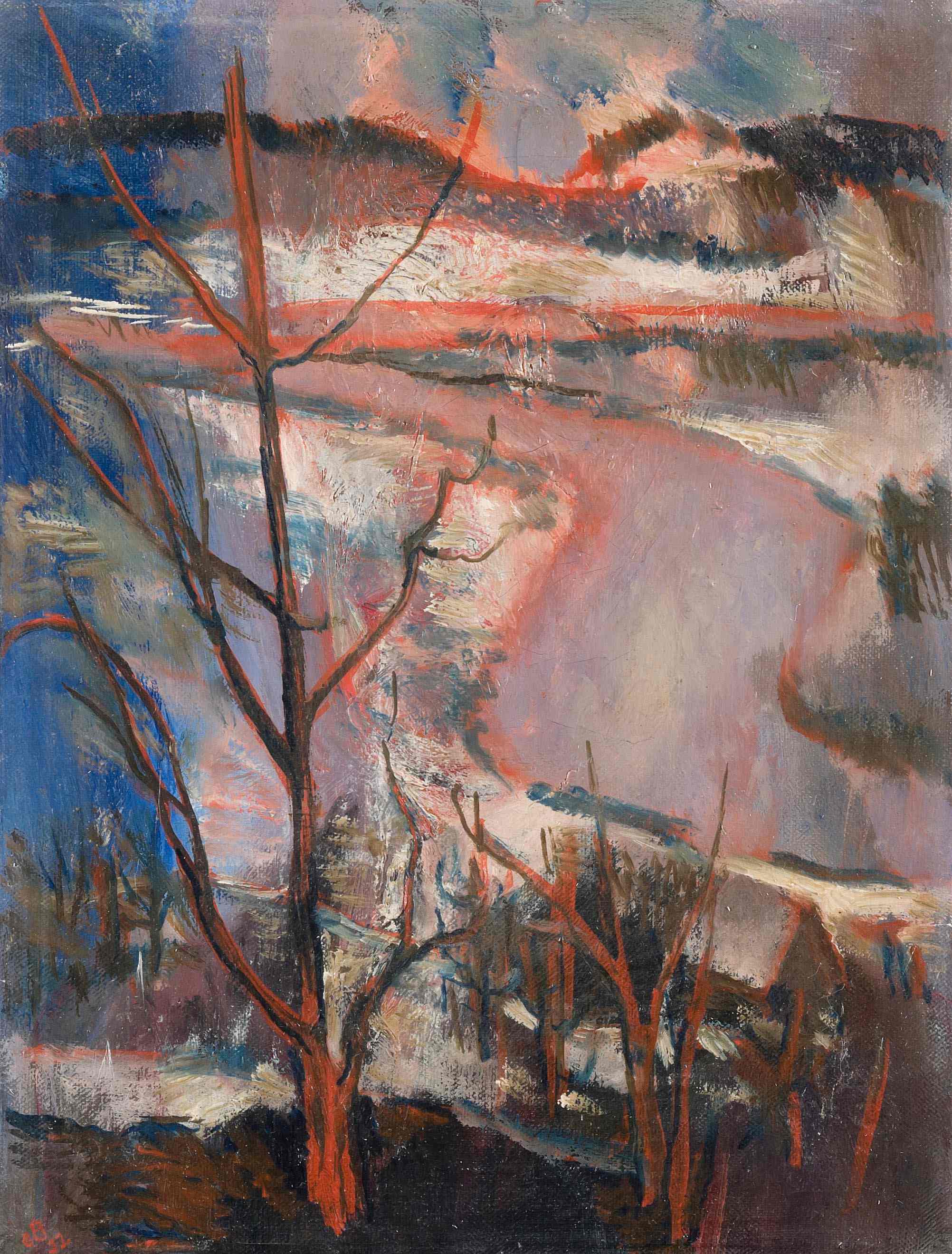 "Winter im Limmattal", 1932. Öl auf Leinwand. Unten links monogrammiert, verso auf Keilrahmen bezeichnet. 35,5x27 cm.