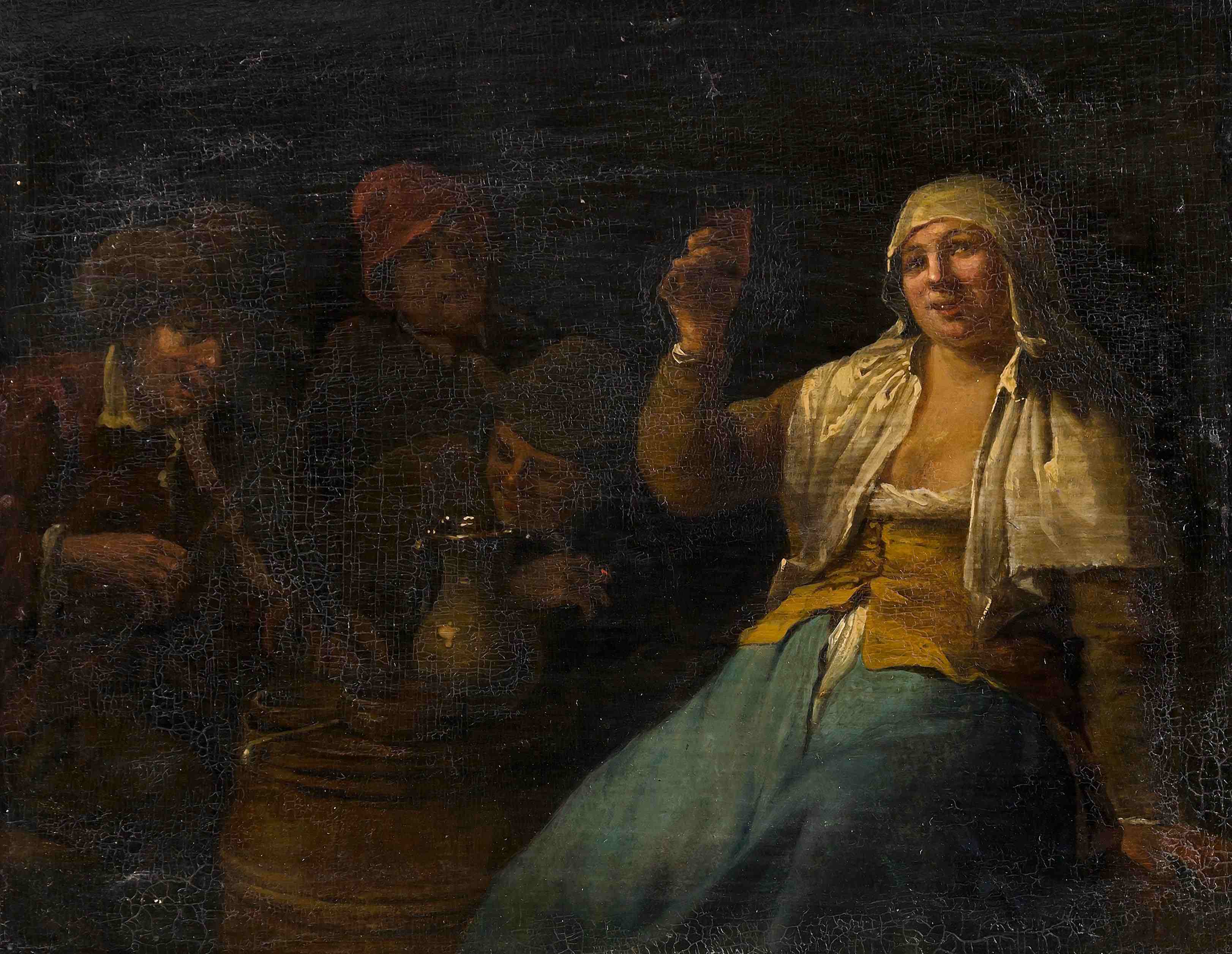 Wirtshausszene. Öl auf Holz. Verso grosses Siegelwappen. 18,2x23,7 cm.