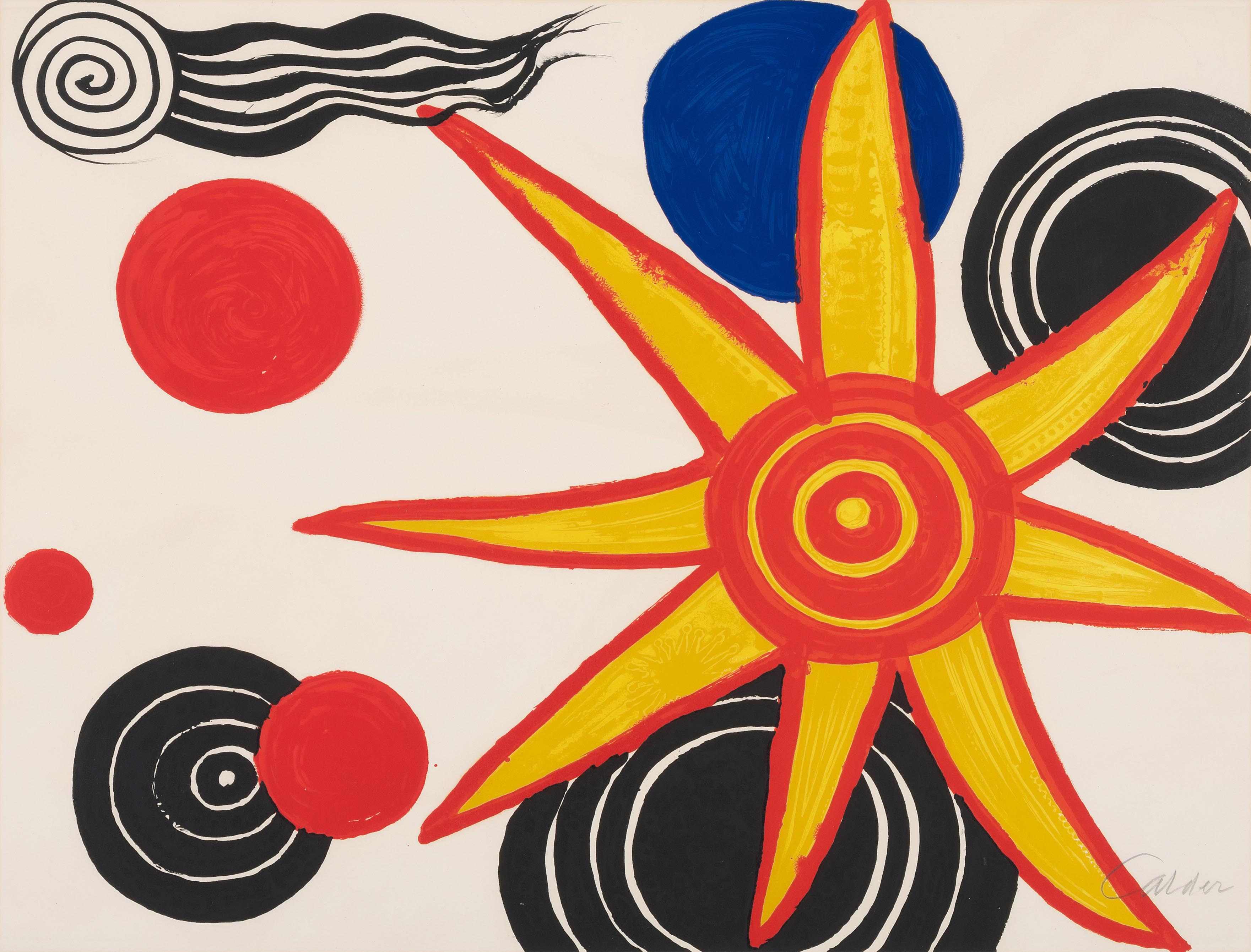 Ohne Titel. Kreise und Stern. Farblithographie. Unten rechts in Bleistift signiert. Blattgrösse 50x64,8 cm. Gerahmt. -Blatt gebräunt (verso stärker gebräunt). Lichtrand. Verso an allen Ecken an Passepartout montiert.