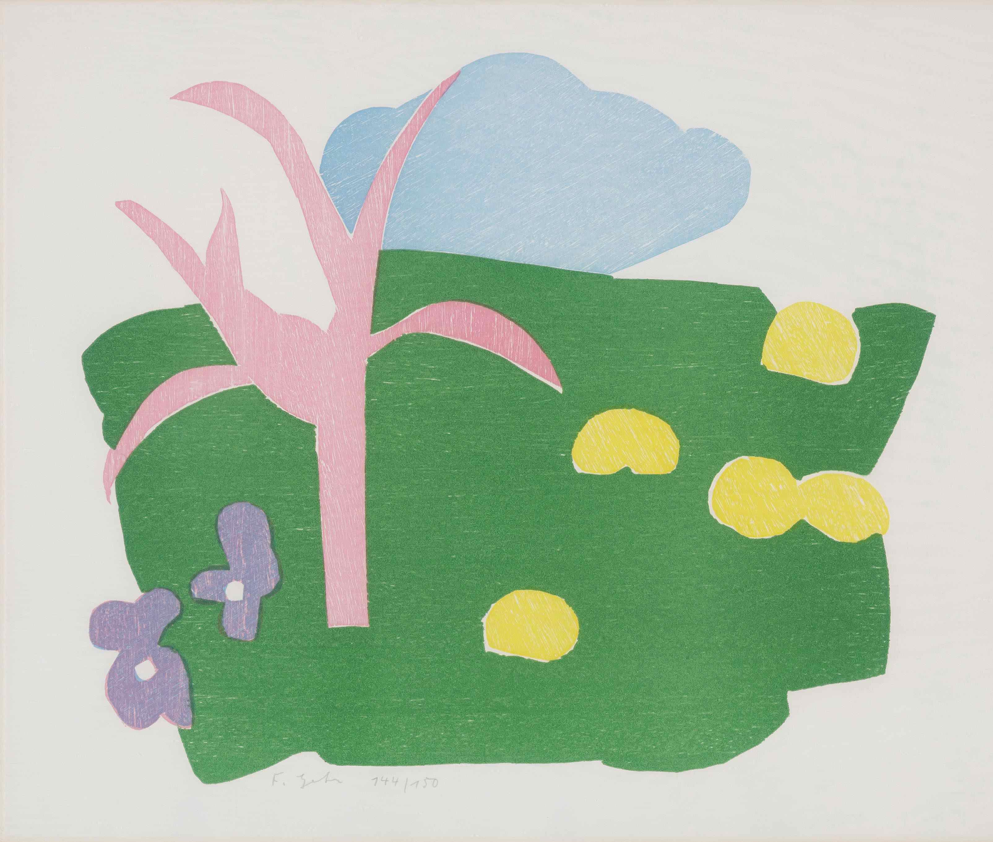 "Landschaft". 1971. Holzschnitt. 144/150. Unten links in Bleistift signiert. Lichtmass 44,5x53,5 cm. Gerahmt. -Dieses Blatt wurde nicht ausgerahmt.