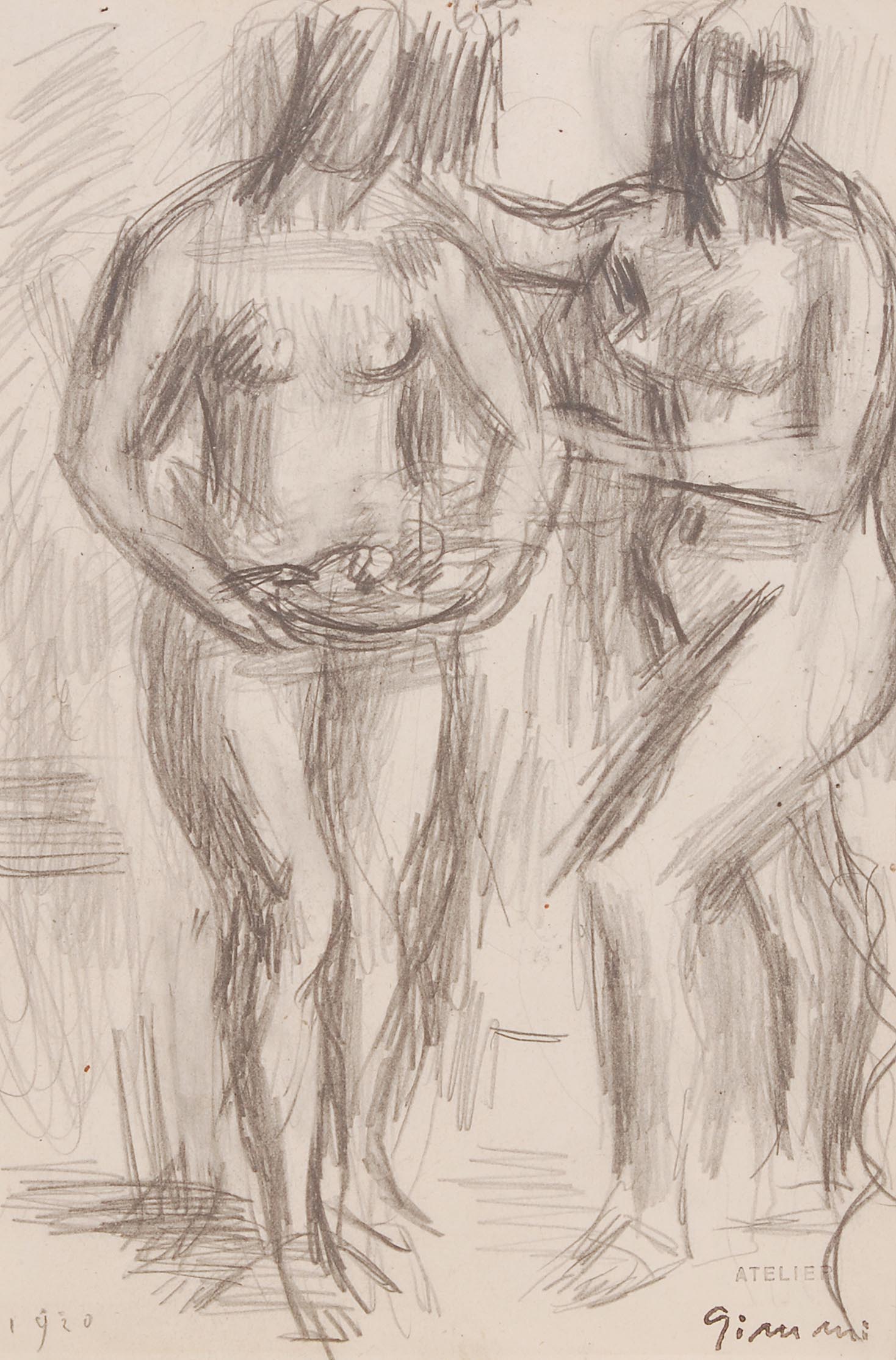 Zwei Akte. 1920. Bleistift auf Papier. Unten rechts mit Stempel: "Atelier Gimmi". Unten links in Bleistift datiert. Blattgrösse 22x15 cm. Gerahmt. -Blatt leicht gebräunt. Minimster Lichtrand. Am linken Rand Abrissspuren eines Skizzenhefts. Verso am oberen Rand an Rückblatt montiert.