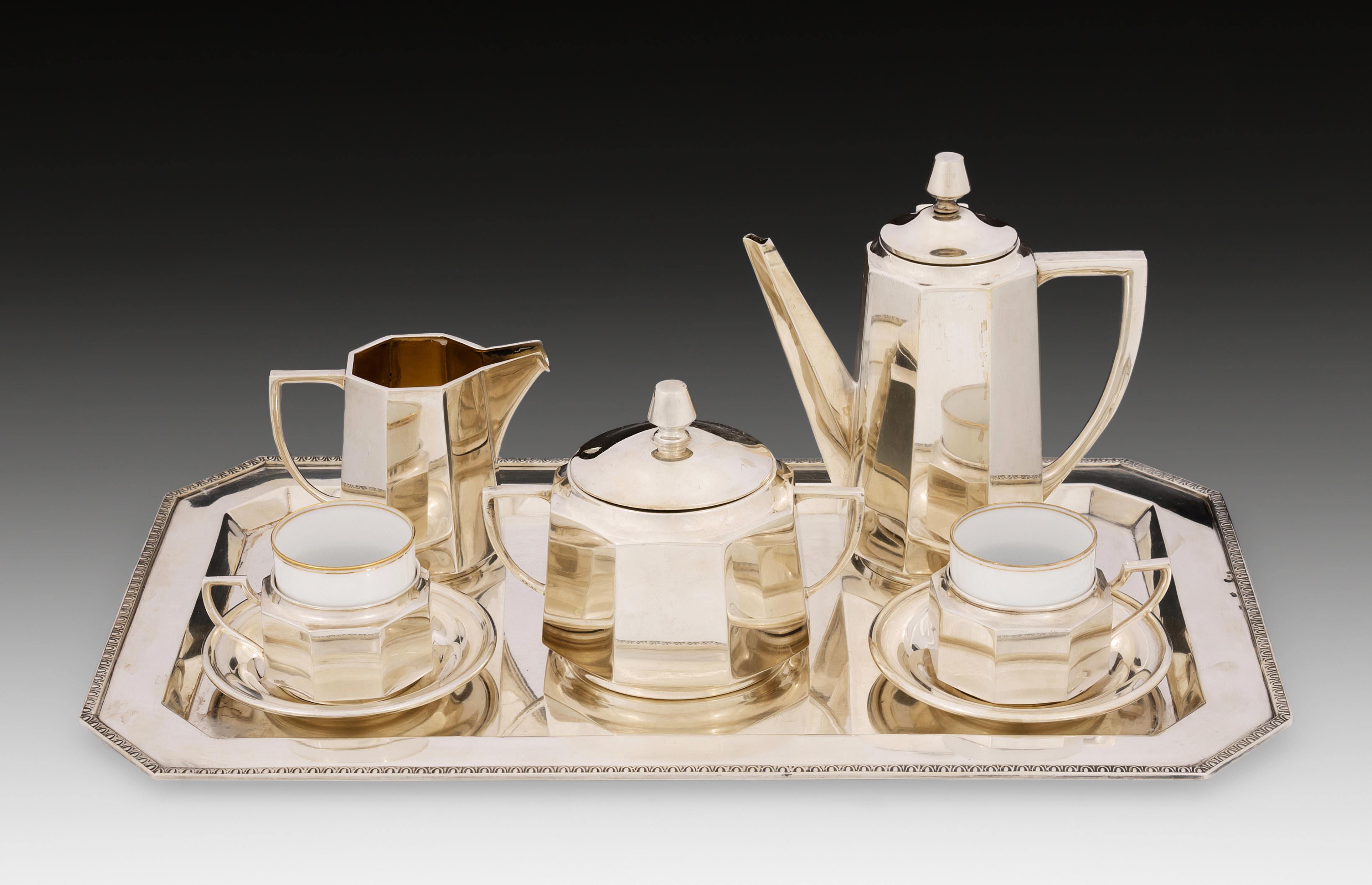 Um 1910. Meistermarke Ludwig Moser. Silber. 6-teilig. Rundform mit facettierter Wandung, Röhrenausguss und J-förmiger Henkel. Bestand: Mokkakanne, Cremier, Sucrier, 2 Tassen mit Untertassen und rechteckiges Tablett. Tassen mit Porzellaneinsätzen. H MK 15, Tablett 38x22 cm. zus. ca. 1540 g. Dianakopfpunze, Meistermarke, tschechische Importmarke von 1922.