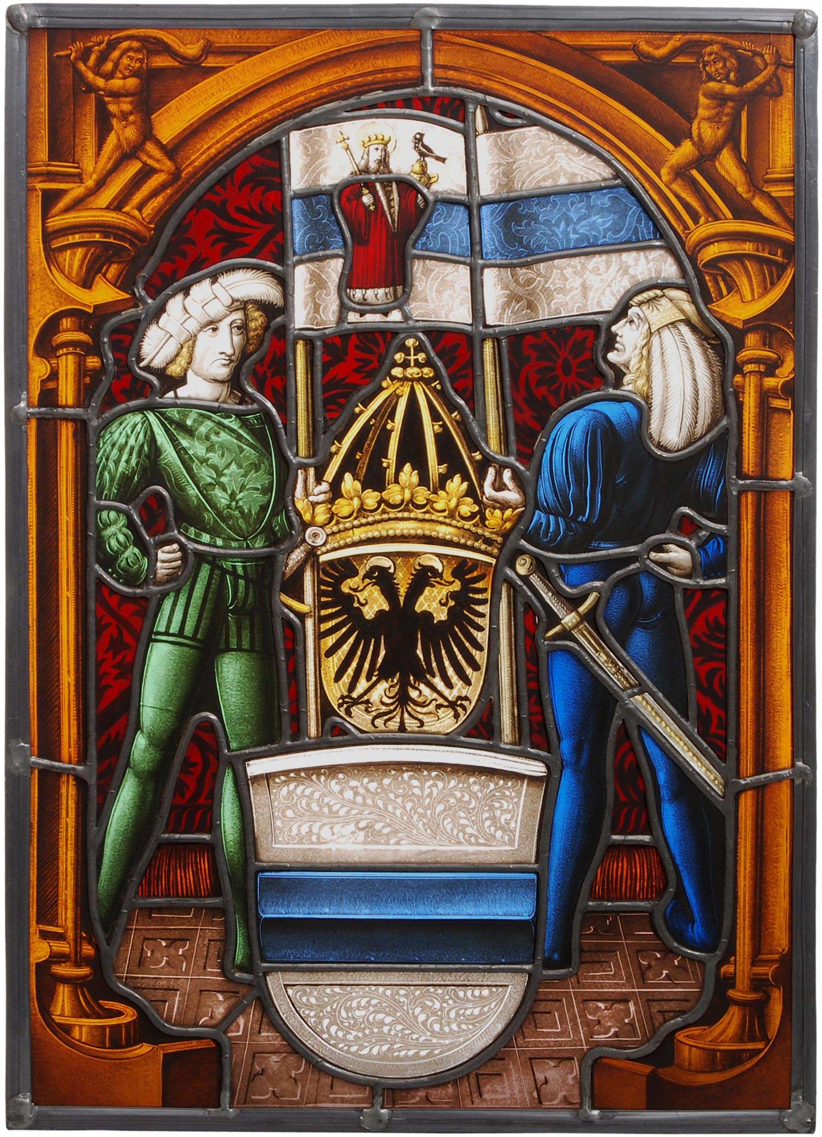 Schweiz, 20.Jh. Nach der Vorlage von Lukas Zeiner (tätig um 1500). Glas geätzt und polychrom bemalt. In Bleifassung. Mittelbild: Vor rotem Damasthintergrund Zuger Wappenpyramide. Flankiert von 2 Eidgenossen mit Bannern. Rahmende Bogenarchitektur mit wilden Männern im Oberlicht. 41x29,5 cm.