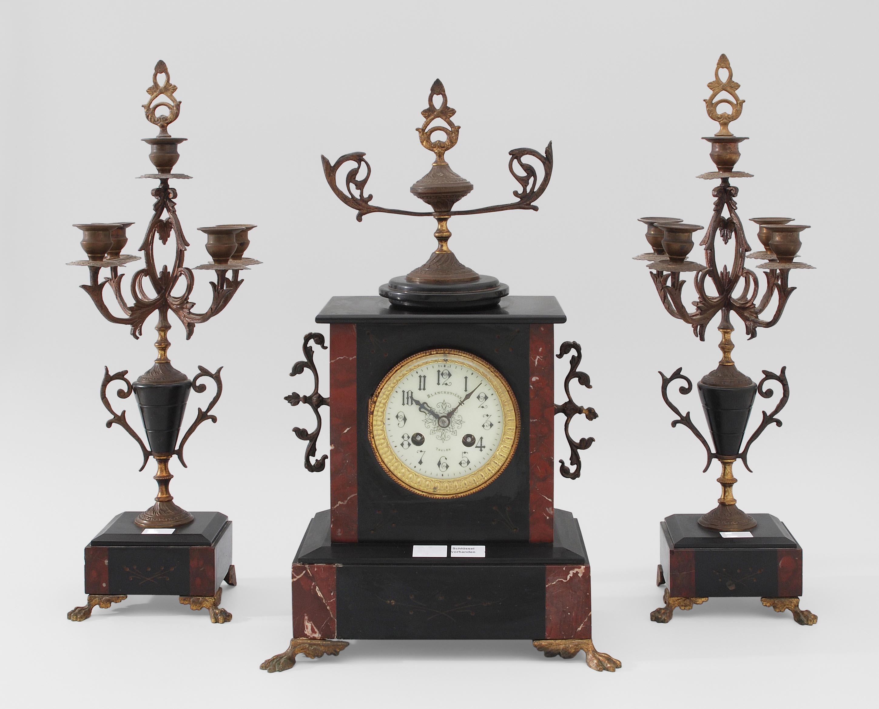 Frankreich, Napoleon lll. Onyxgehäuse mit rötlichen Marmoreinlagen an den Frontseiten. Seitlich und auf dem Uhrenoberteil sind Zinkgussverzierungen angebracht. Zinkgussfüsse auf der Vorderseite in Form von Pfoten. Verglastes Ziffertürchen in ziselierter Messingfassung. Emailzifferblatt mit arabischen Stundenzahlen und Signatur "Blancetière Toulon". Ankerwochenwerk Nr. 25912 mit Hinterpendel an Federaufhängung. Halbstunden- und Stundenschlag auf Glocke. Zu revidieren. 44x22 cm.