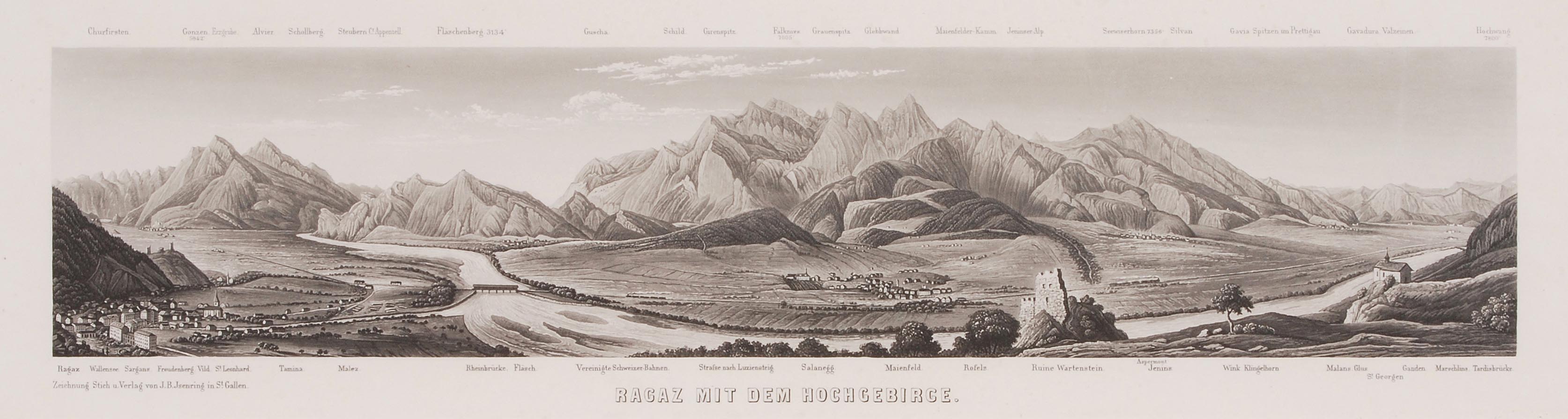 "Ragaz mit dem Hochgebirge." Aquatinta, 1859. 9,5x45,2 cm. Gerahmt. - Panoramenansicht des Rheintales vom Walensee bis zur Tardisbrücke mit Bad Ragaz im Vordergrund und der Alpenkette von den Churfirsten bis zum Hochwang am Horizont.
