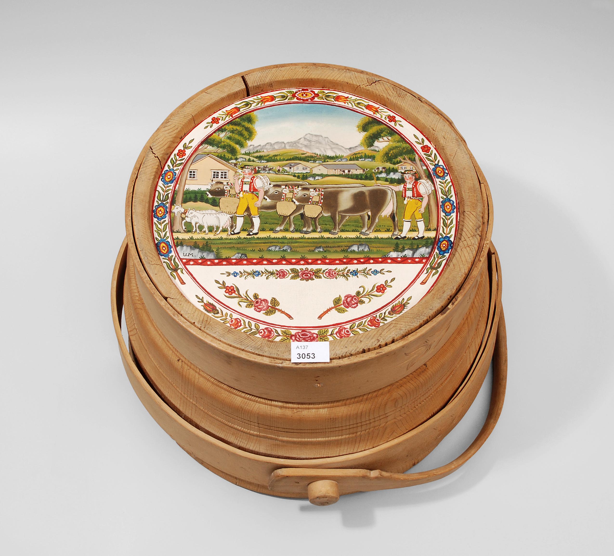 Fahreimer mit bemaltem Bödeli "Alpfahrt" von U. Martinelli. Ohne Namenkartusche und Datierung. Tempera auf Holz. Unten rechts monogrammiert. Rund. DM 22 cm. Fahreimer H 21 cm; DM 31 cm.