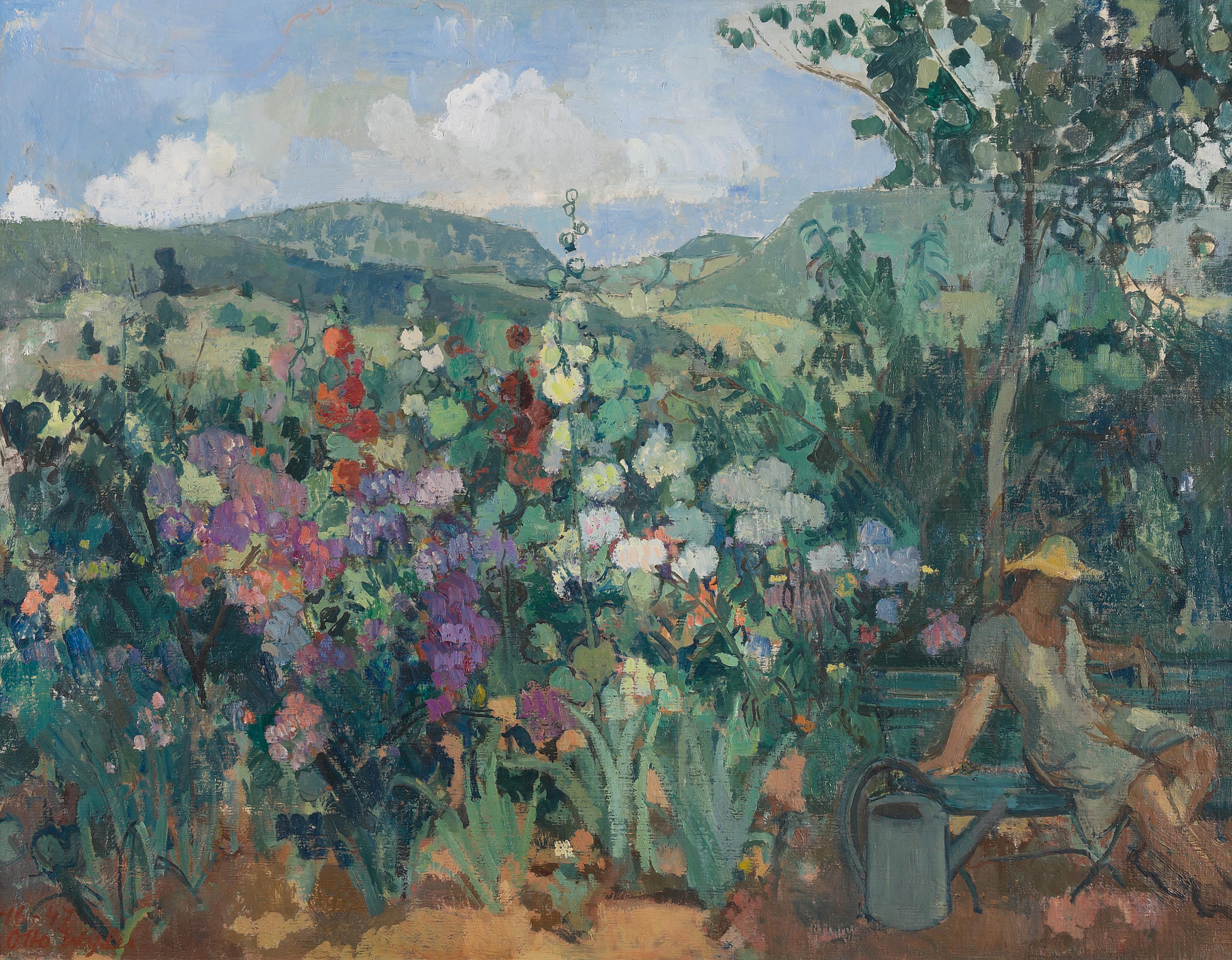 "Sommerlicher Garten", 1946/47. Öl auf Leinwand. Unten links signiert und datiert, verso auf Etikett bezeichnet. 97x130 cm.