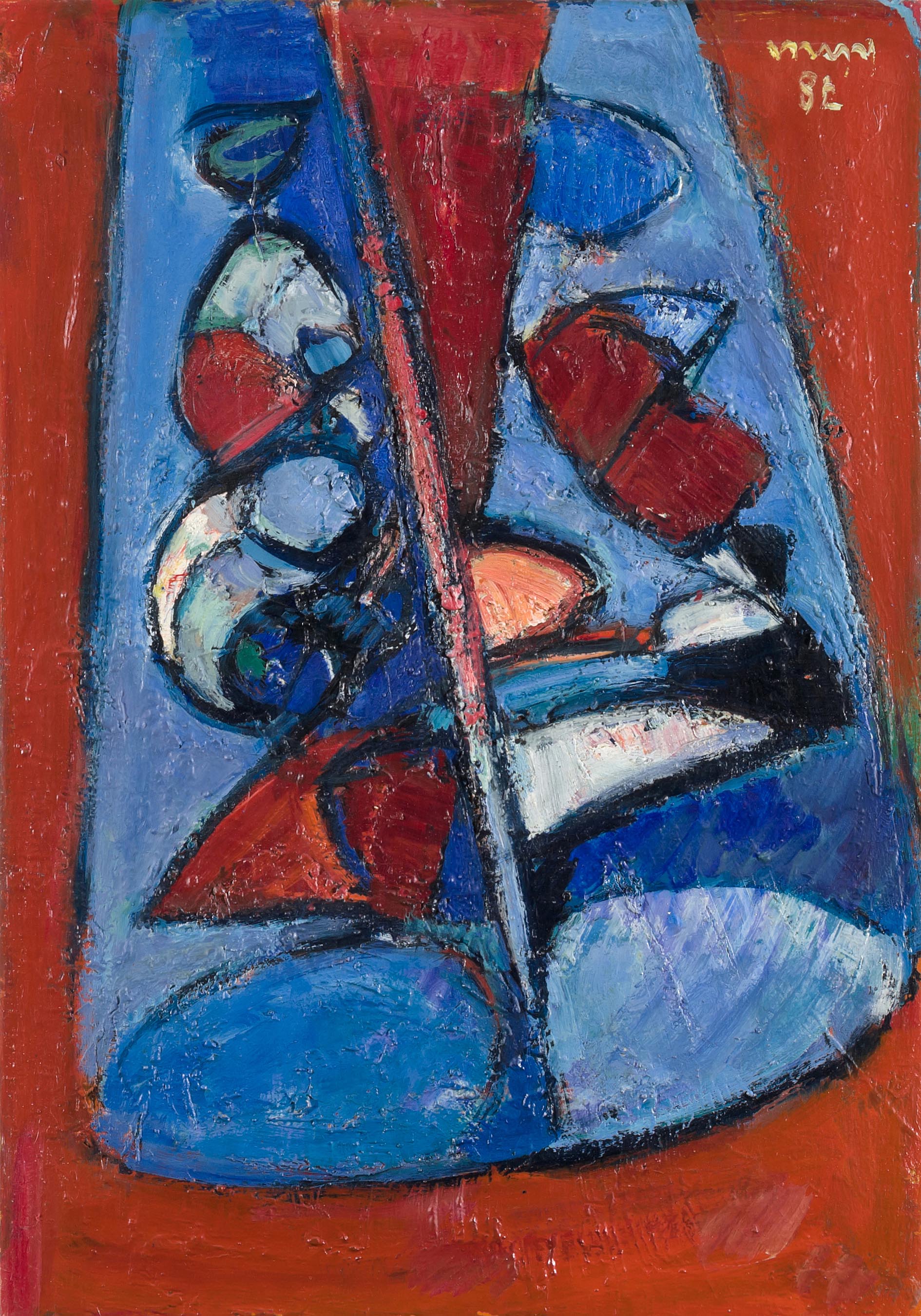 "Komposition rot/blau", 1978. Öl auf Hartfaserplatte. Unten links signiert und datiert, verso auf Etikett bezeichnet. 91x50 cm.