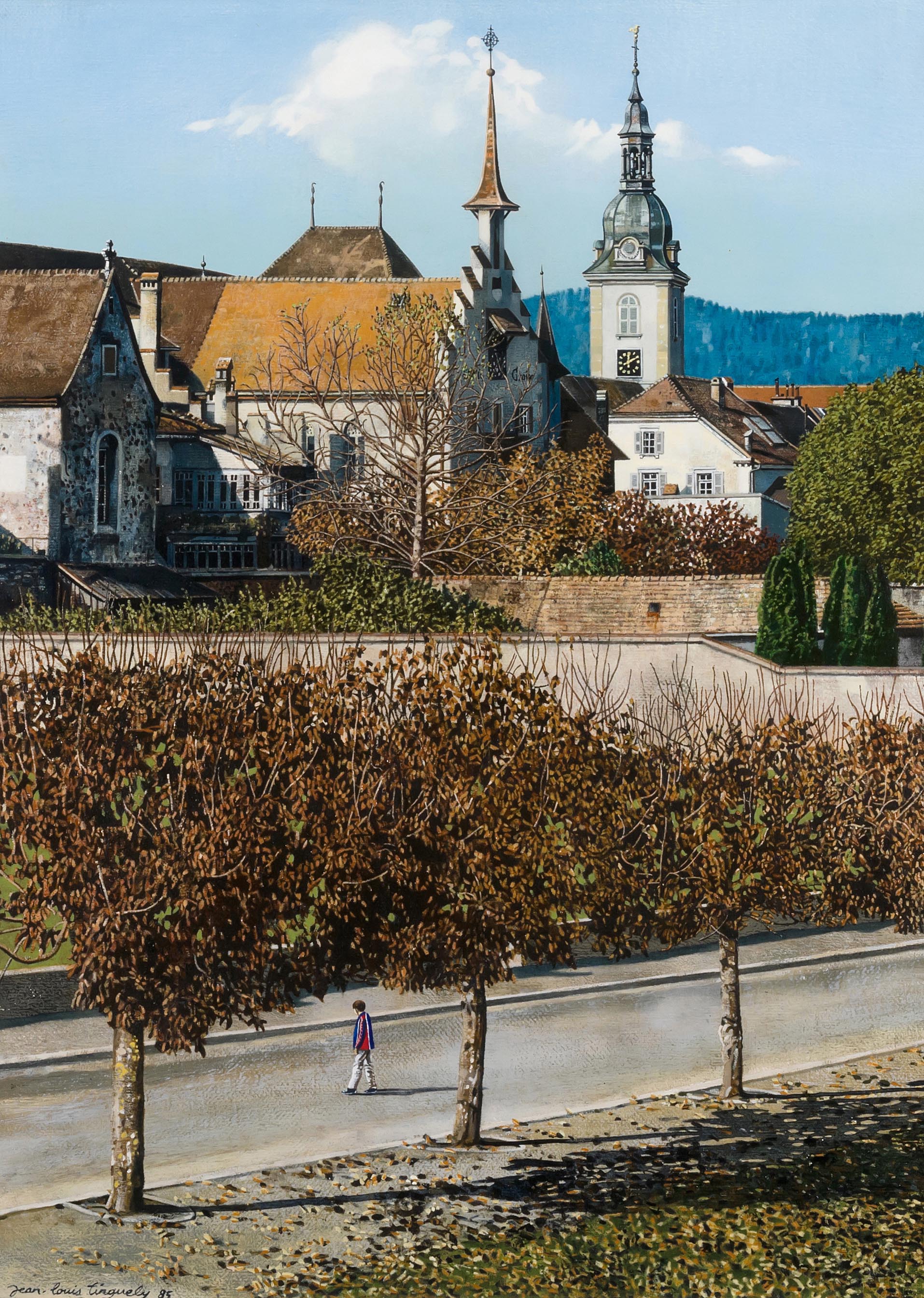 "Bulle, Ste-Croix et l'église", 1985. Öl auf Leinwand. Unten links signiert und datiert, verso auf Etikett bezeichnet. 72x53 cm.
