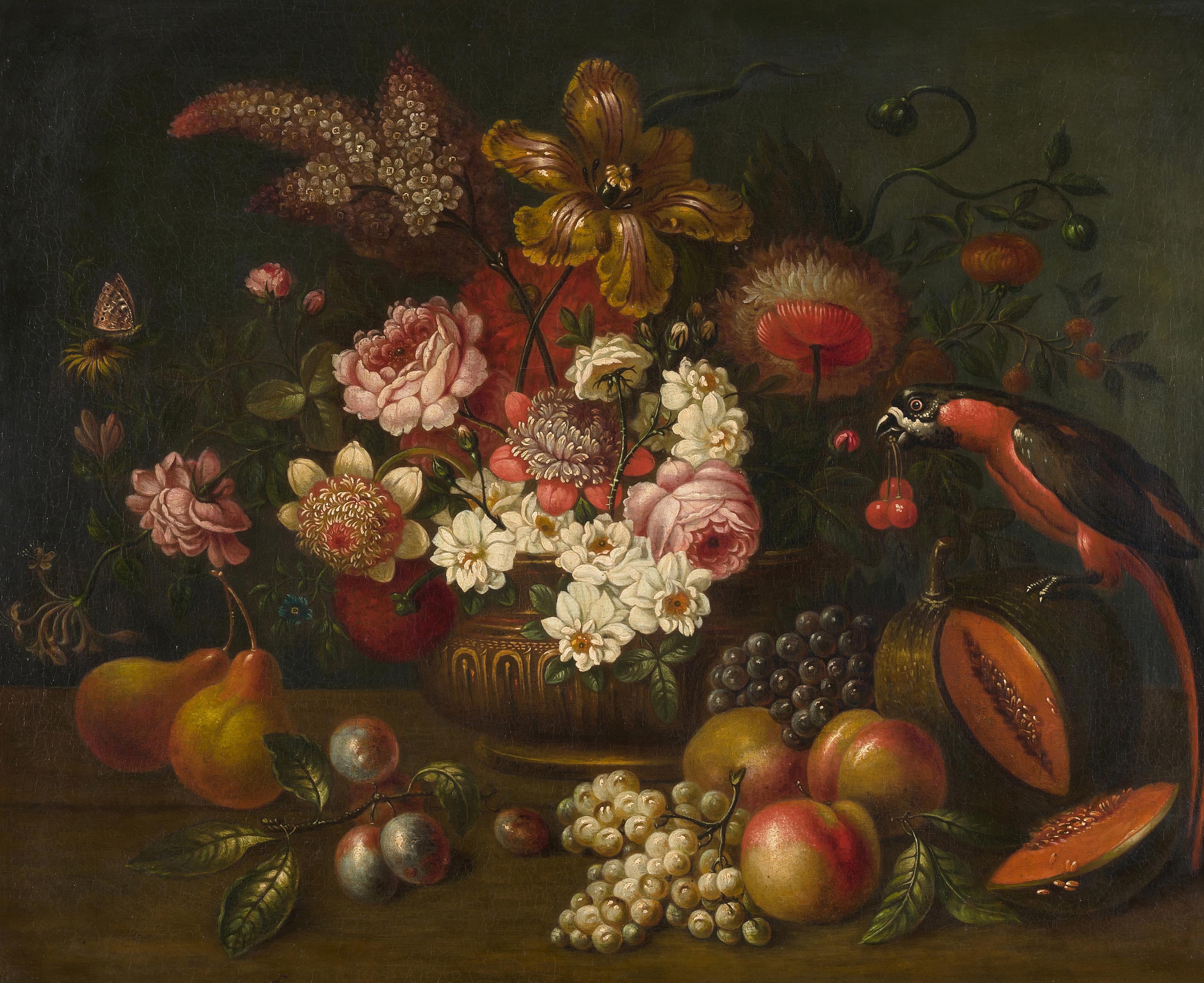 Blumenstilleben mit Papagei. Öl auf Leinwand. Auf der Vase bezeichnet Justus van Huysum. 72x90 cm.