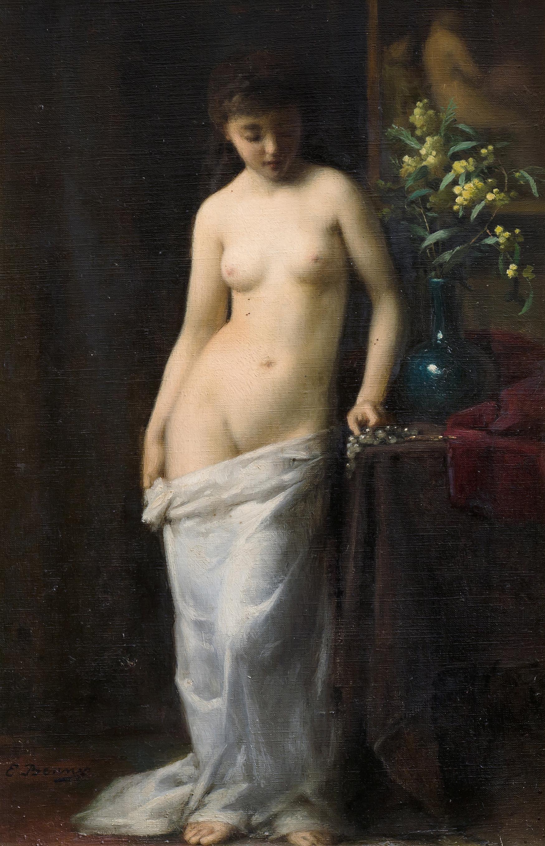 Stehender weiblicher Akt. Öl auf Leinwand. Unten links bezeichnet E. Benner. 41,5x27,3 cm.