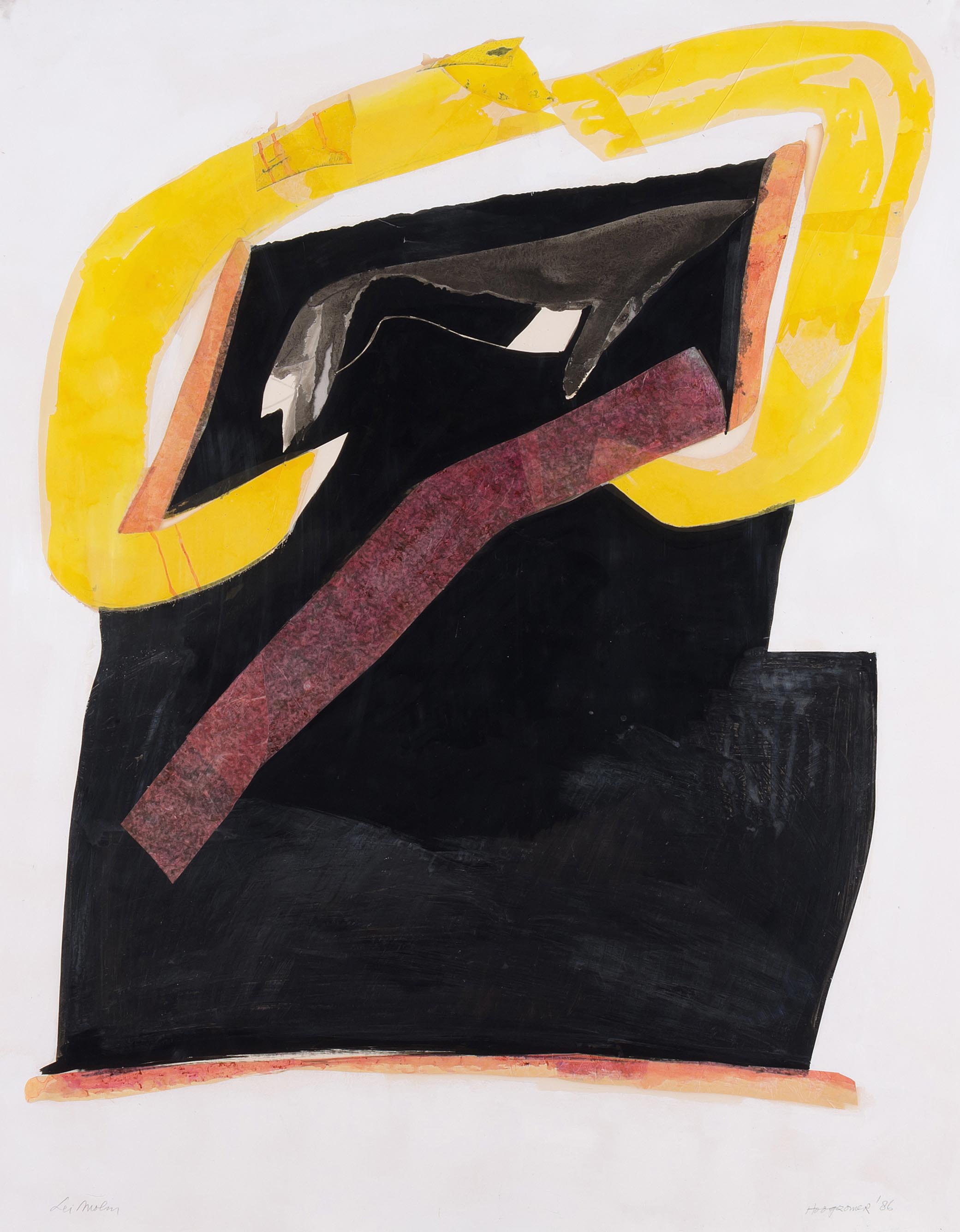 "Hoogzomer". 1986. Collage und Mischtechnik auf Papier. Unten links in Bleistift signiert. Unten rechts in Bleistift betitelt und datiert. Lichtmass 147x119,5 cm. Gerahmt. -Dieses Werk wurde nicht ausgerahmt. Kratzer auf der Plexiglasscheibe.