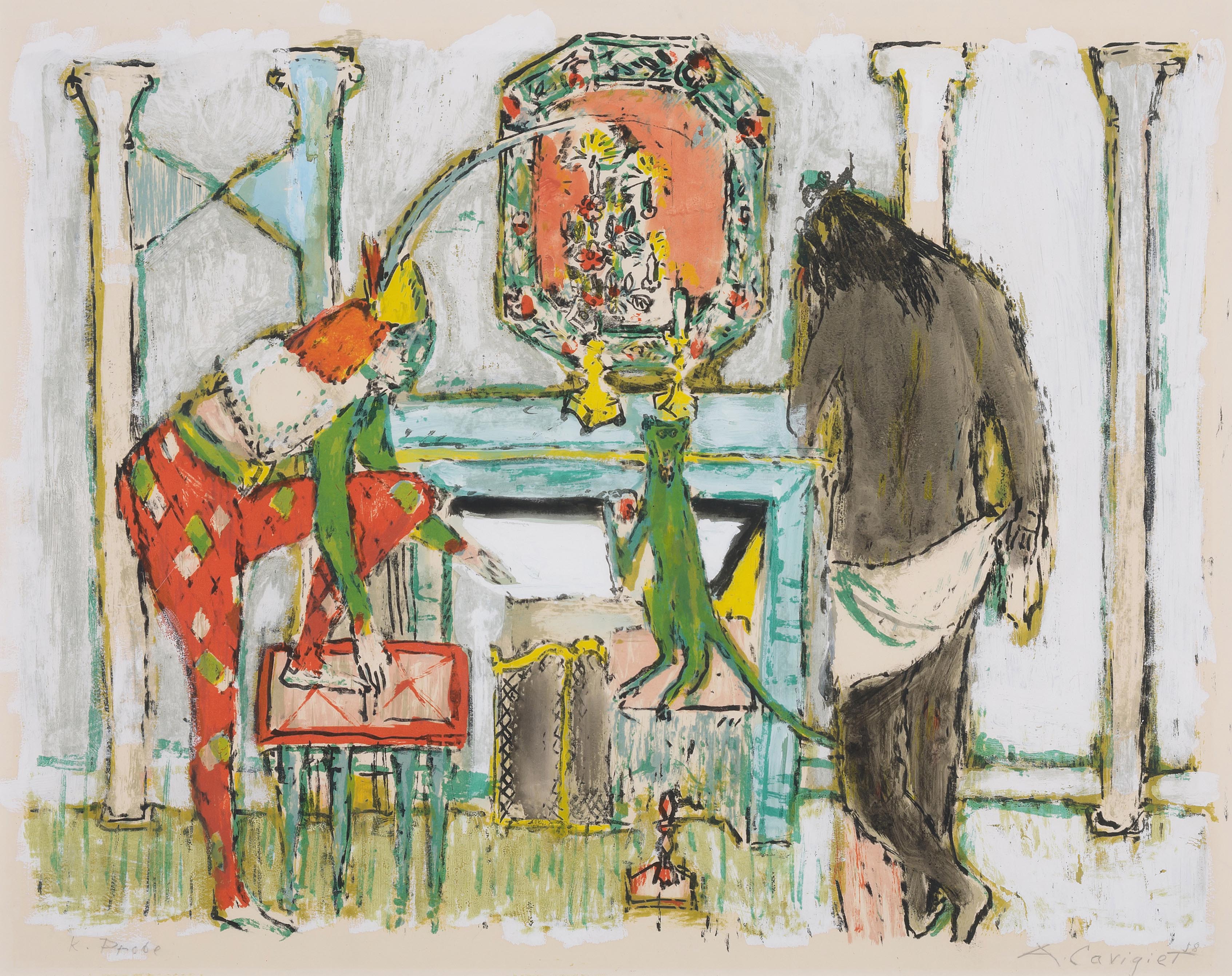 In der Garderobe. 1958. Farblithographie. Künstlerprobe. Unten rechts in Bleistift signiert und datiert. Blattgrösse 63x76,4 cm. Gerahmt. -Blatt gebräunt. Lichtrand. Knitter und Bestossungen. Am oberen Rand leichter Einriss von ca. 1 cm. Verso am oberen Rand an Passepartout montiert. Verso mit Klebspurresten.