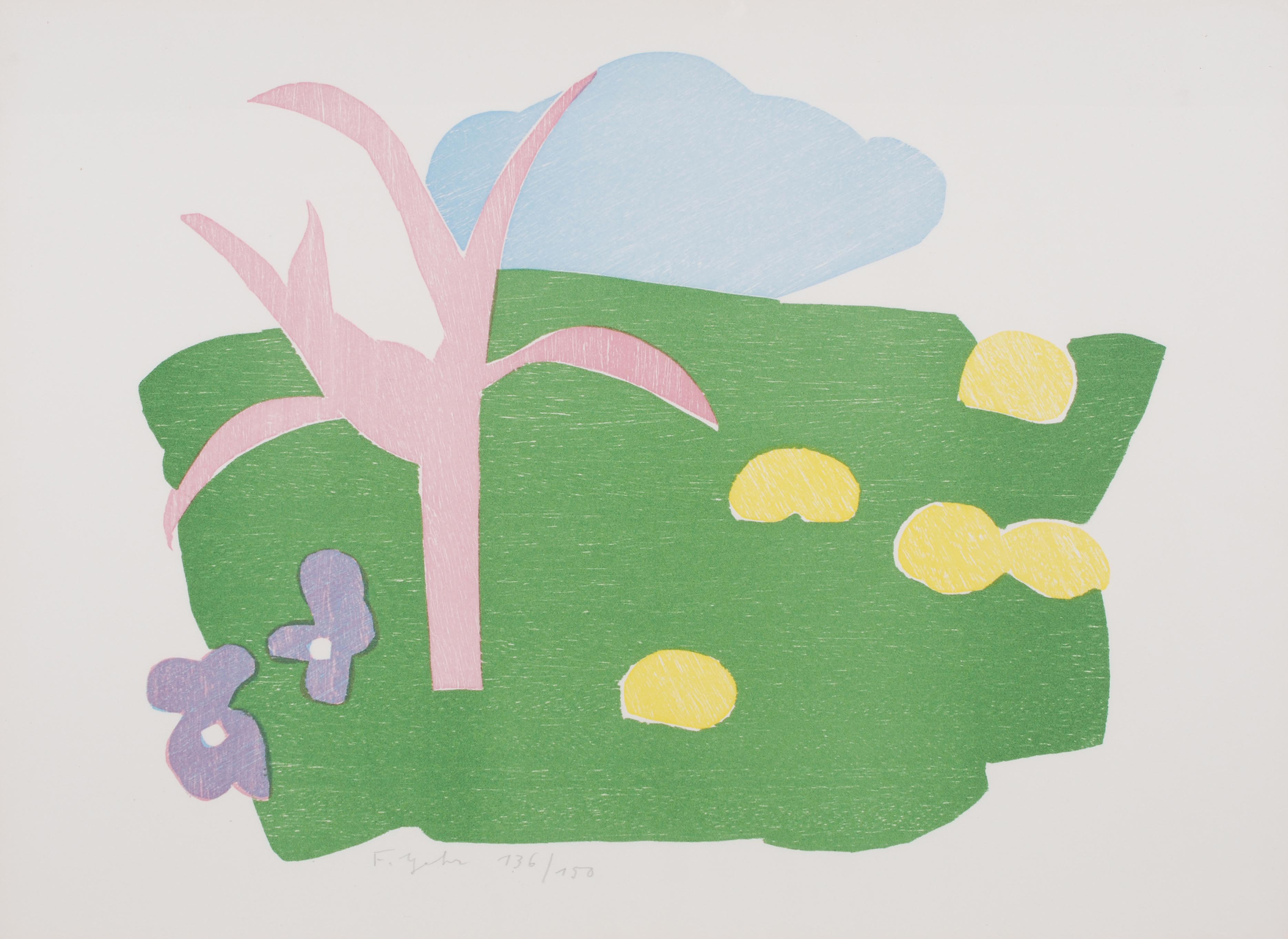 Landschaft. Holzschnitt. 136/150. Unten links in Bleistift signiert. Blattgrösse 48x59,5 cm. Gerahmt. -Blatt leicht gebräunt. Leichter Lichtrand. Wenige Knitter. Blatt leicht gewellt.