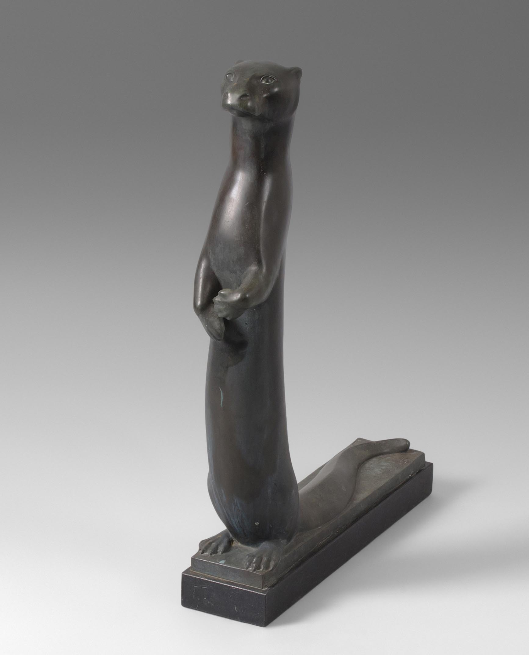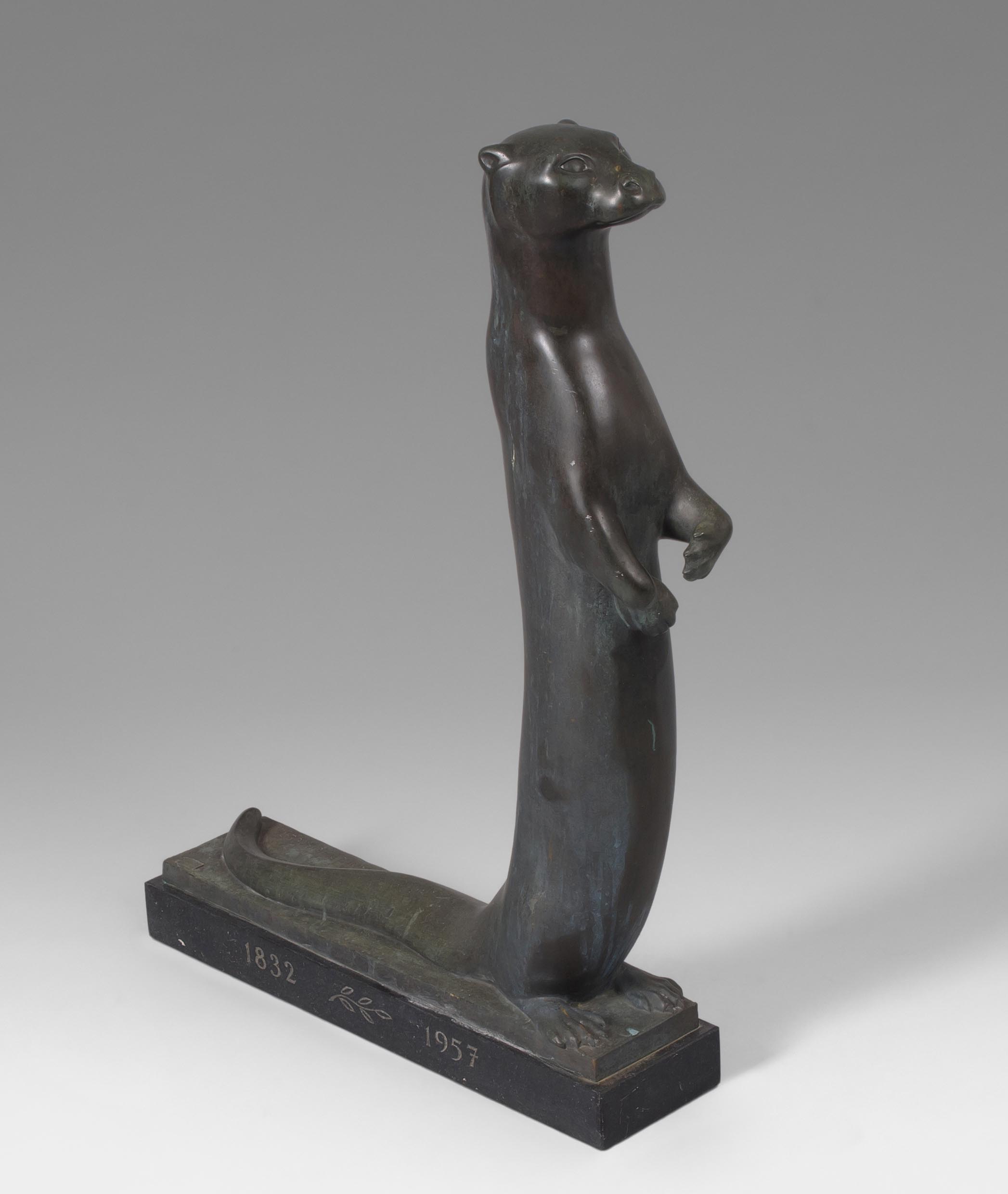 Fischotter. Bronze. Auf dem Bronzesockel signiert und mit Giessermarke: "Cire Perdue Bisceglia Paris". Auf dem Marmorsockel datiert: 1832 / 1957. Höhe 71,5 auf Marmorsockel 77 cm. -Patina. Wenig Abrieb. Wenige Kratzer.