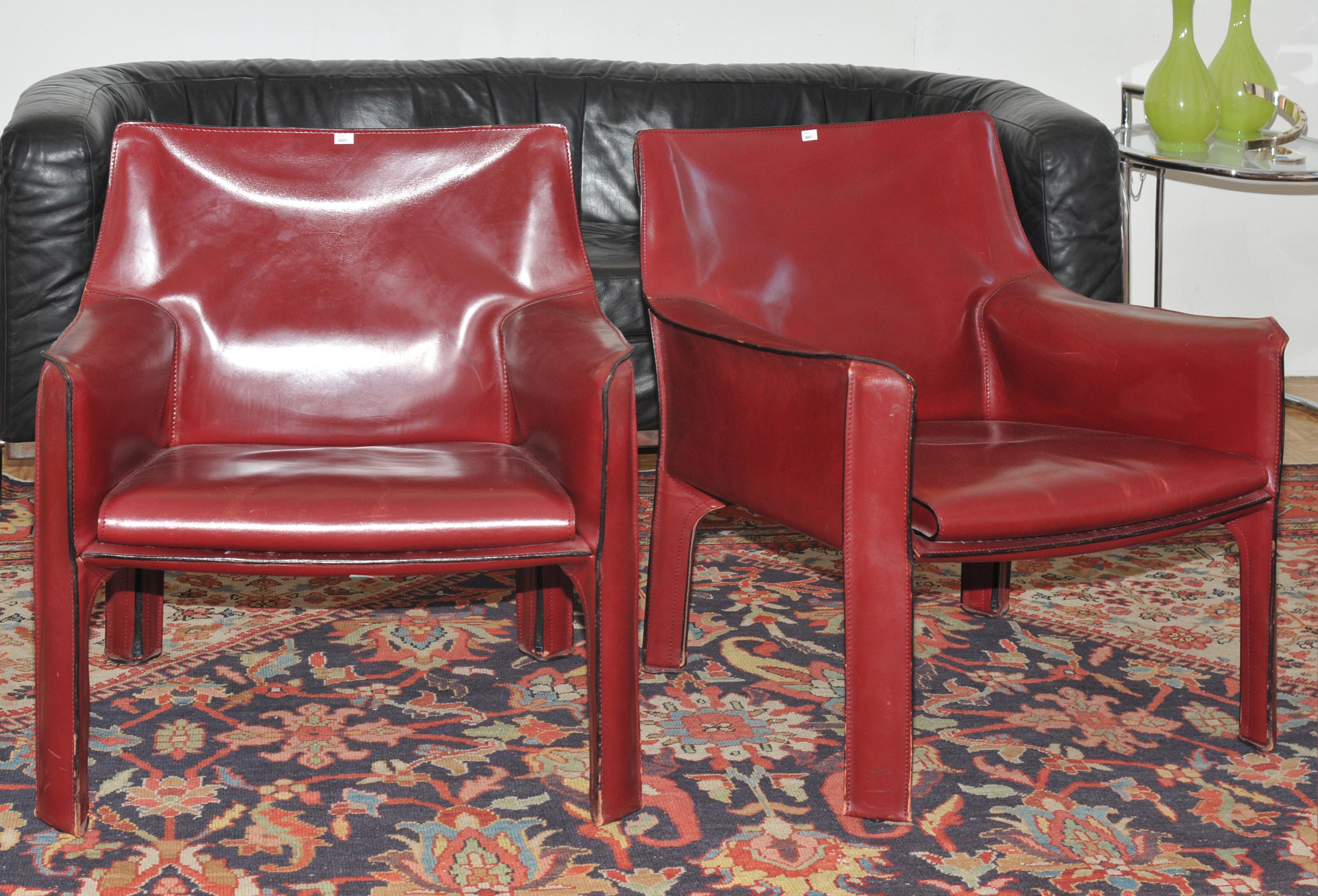 Ein Paar Sessel Cab, 1977. Hersteller Cassina, Italien. Konstruktion aus Stahlrahmen und Lederbezug mit Reissverschluss, Farbe bordeaux-rot. Gebrauchsspuren. Guter Zustand. 78x66x60 cm. Sitzhöhe 40 cm.
