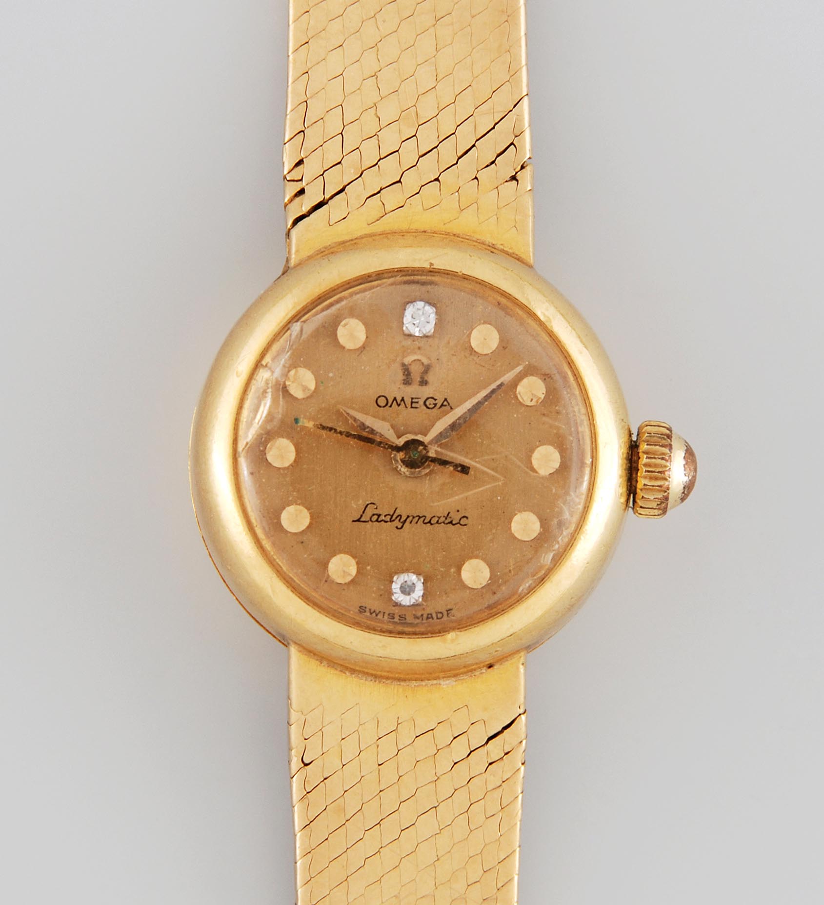 Runde, automatische Damenarmbanduhr in 750 Gelbgoldgehäuse mit Armband ca 20 g. Boden gedrückt, Kaliber 455, Werknummer 17832513, Referenznummer SC29944, D 18 mm. Goldfarbenes Zifferblatt mit goldfarbenen Stundenpunktindizes und 2 Brillanten bei 12 und 6 Uhr. Goldfarbene Dauphine-Zeiger, zentraler Sekundenzeiger. Feines Milanaisearmband im Verlauf mit Leiterverschluss, Umfang 15 cm. Gebrauchsspuren, Glas defekt.