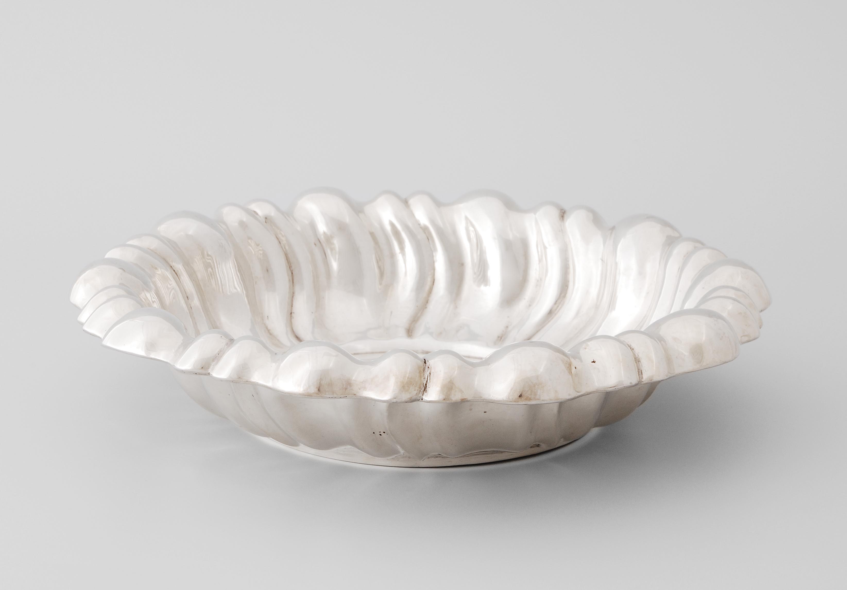Pest, nach 1900. Silber. Rundform, Wandung mit Buckeldekor. Dianakopf, Feingehalt 800. D 29 cm/ ca. 460 g.