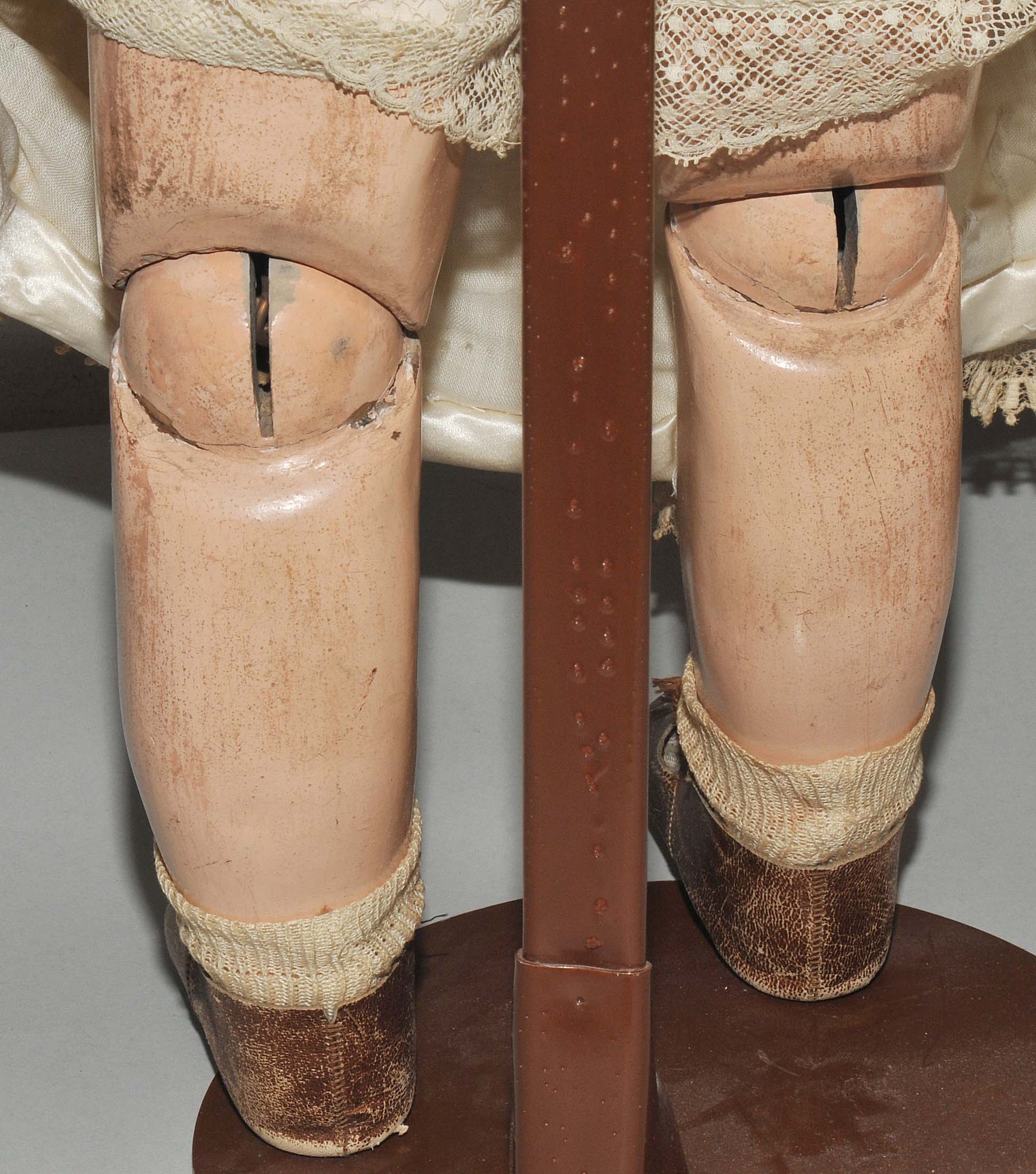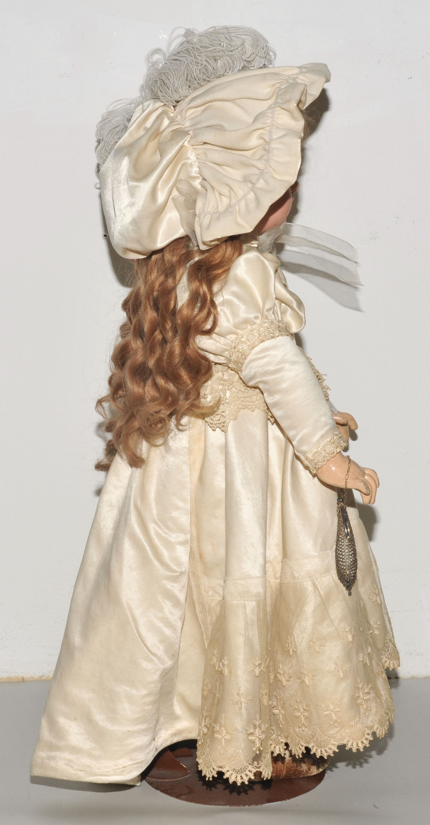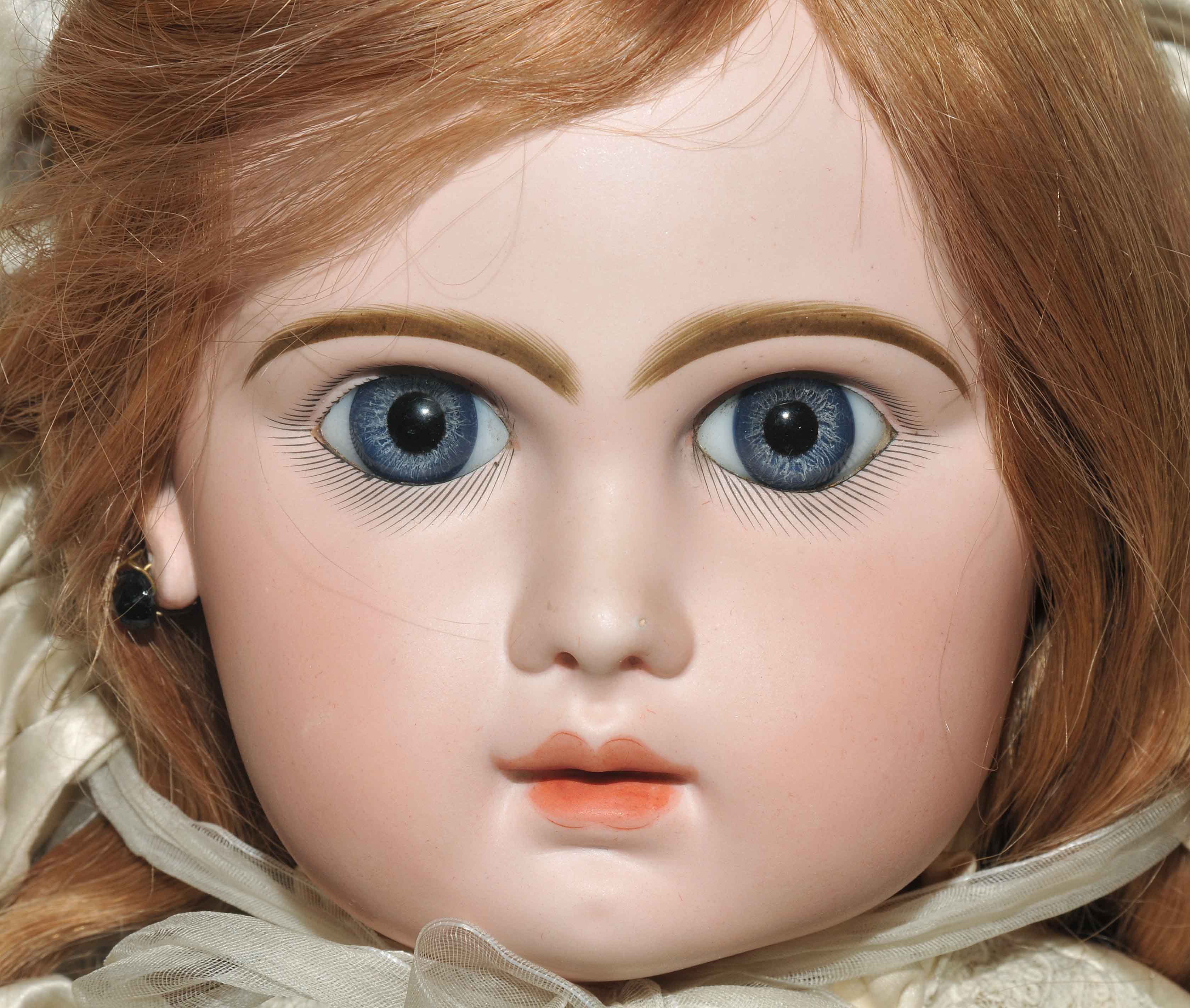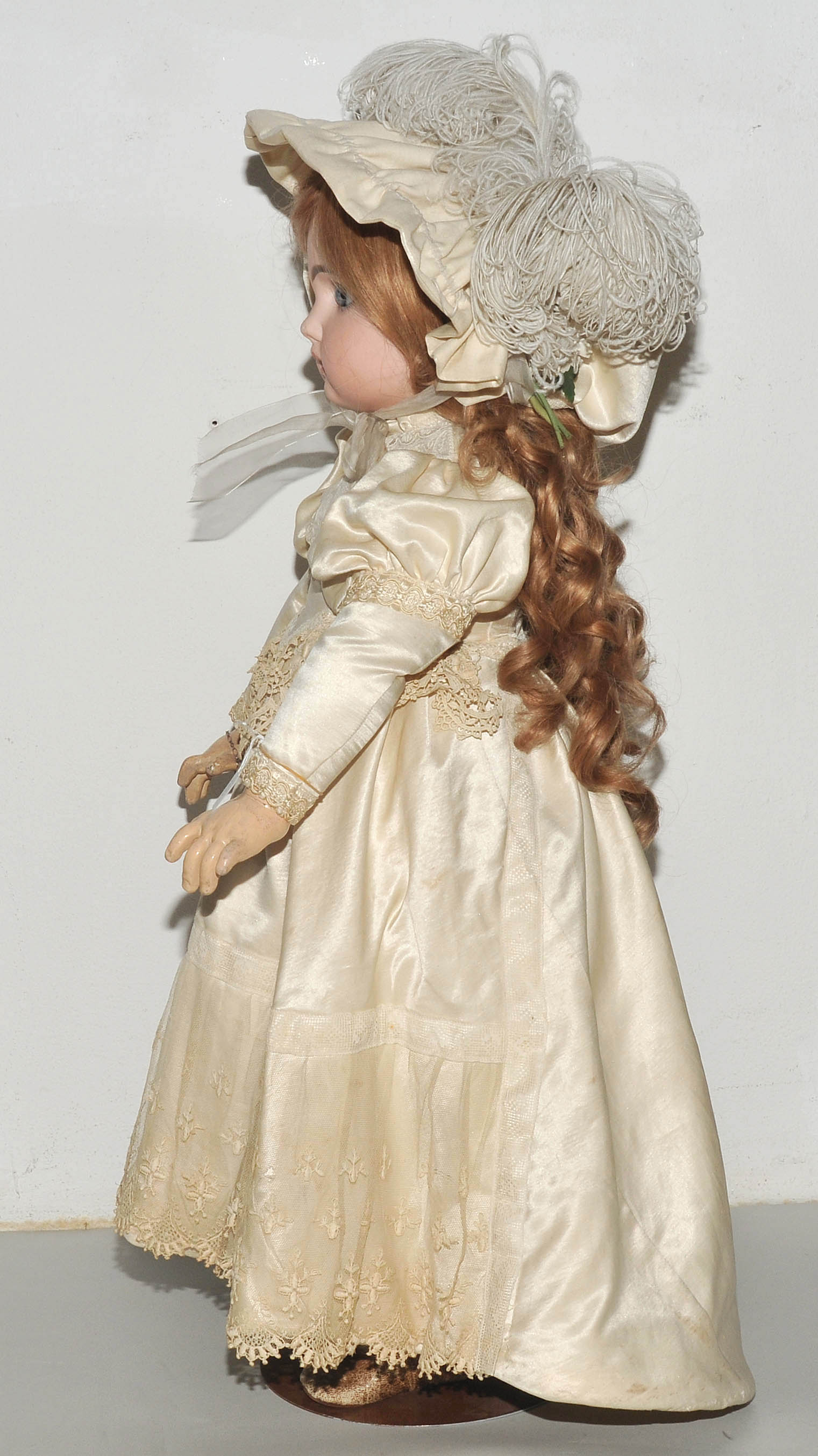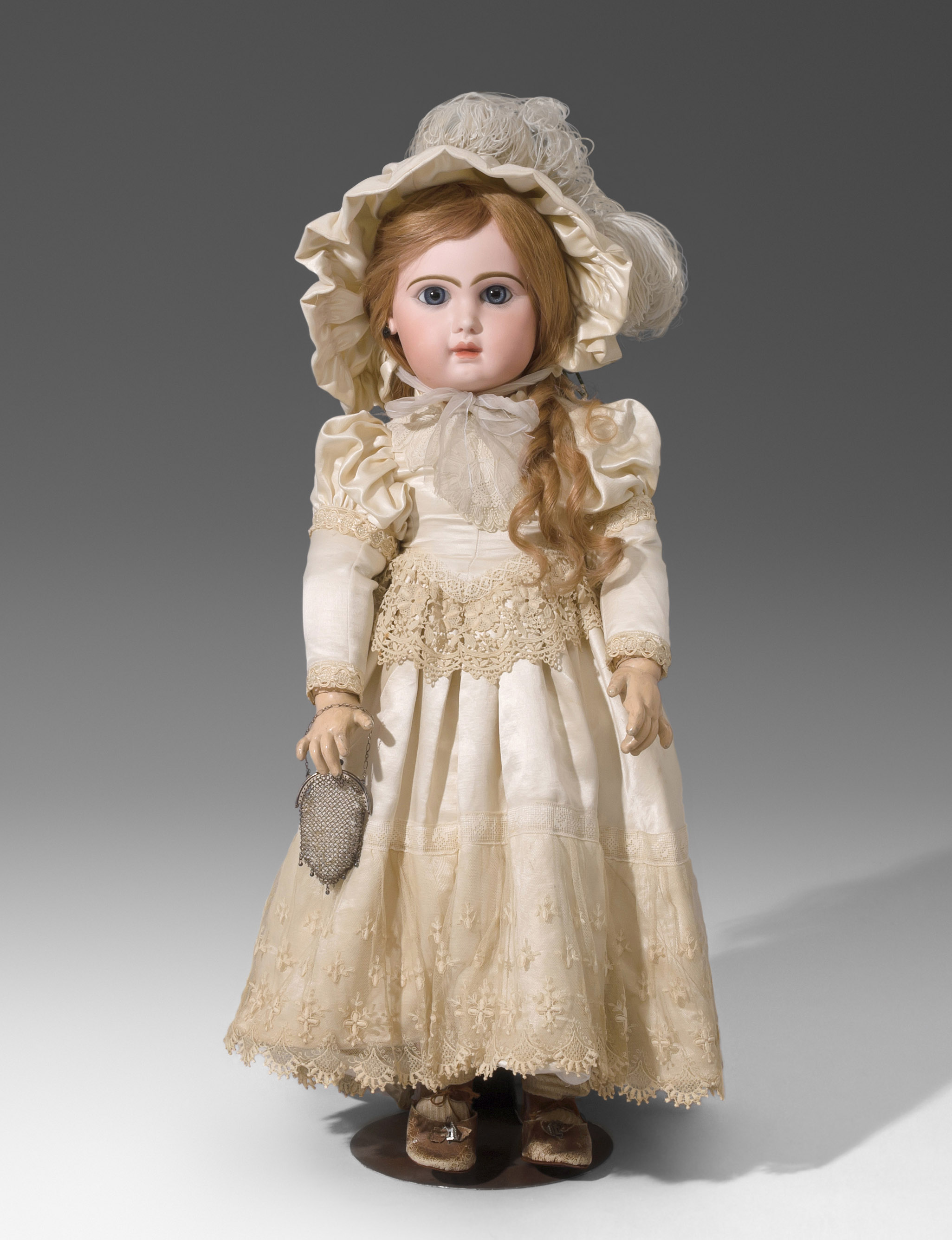 Frankreich, um 1880/90. Kurbelkopf mit blauen Paperweight-Augen und geschlossenem Mund aus Biscuit-Porzellan. Halsmarke: "DÉPOSÉ TÊTE JUMEAU 13" sowie Handzeichen des Malers. Gelenkkörper aus Masse. Grüne Stempelmarke: "BÉBÉ JUMEAU". Blonde Echthaarperücke mit Zapfenlocken ergänzt. Bekleidung im alten Stil. H 72 cm.