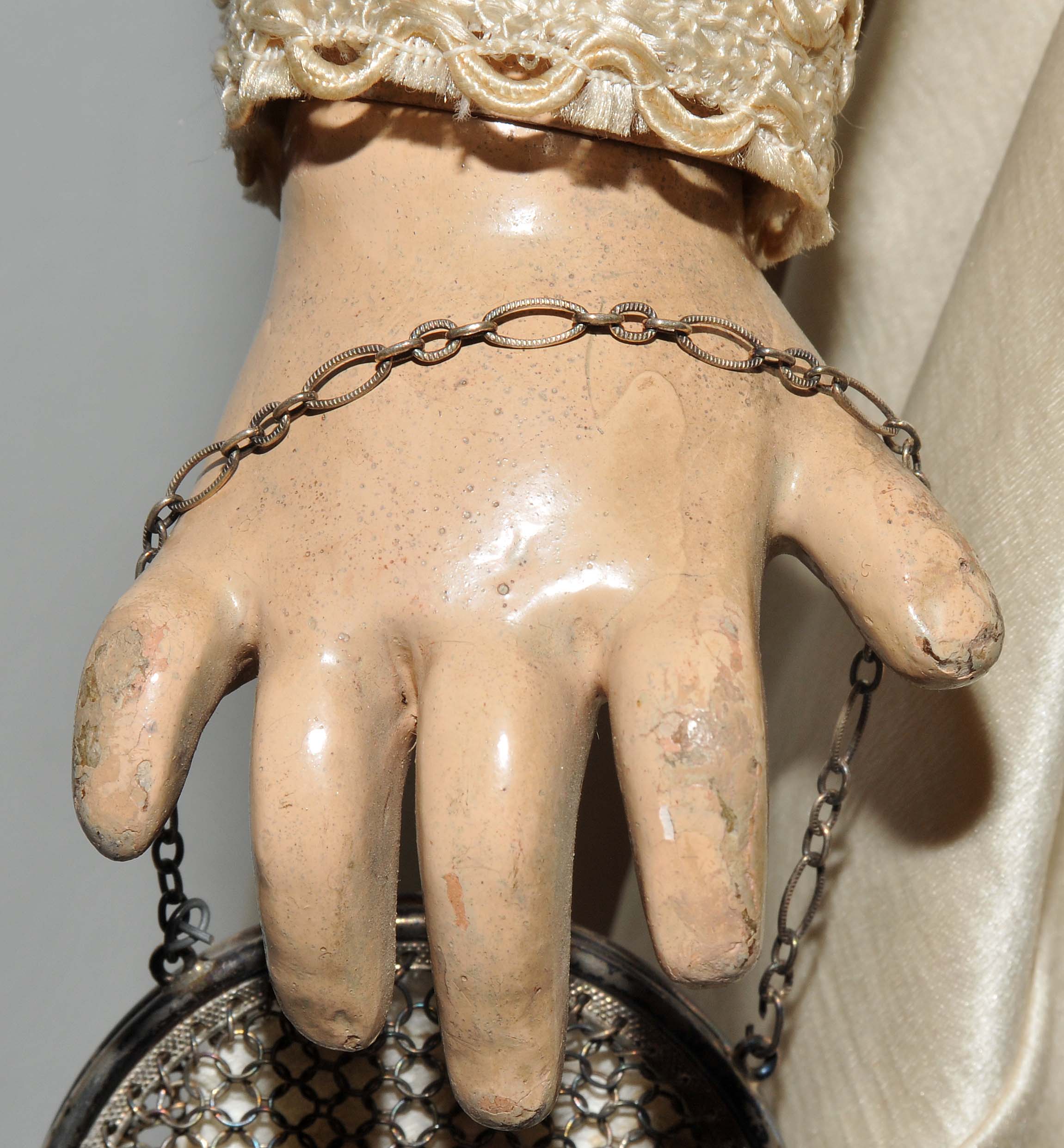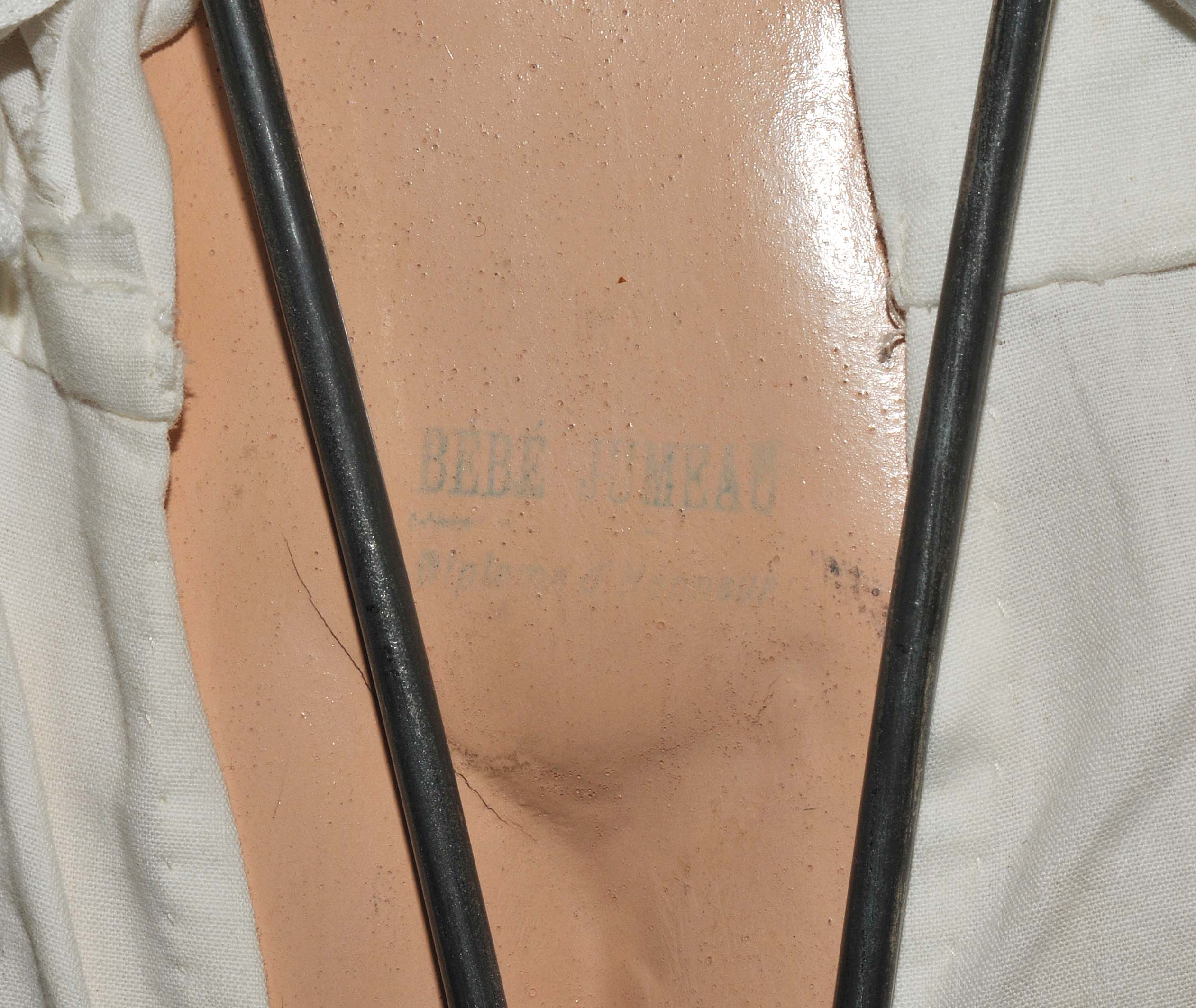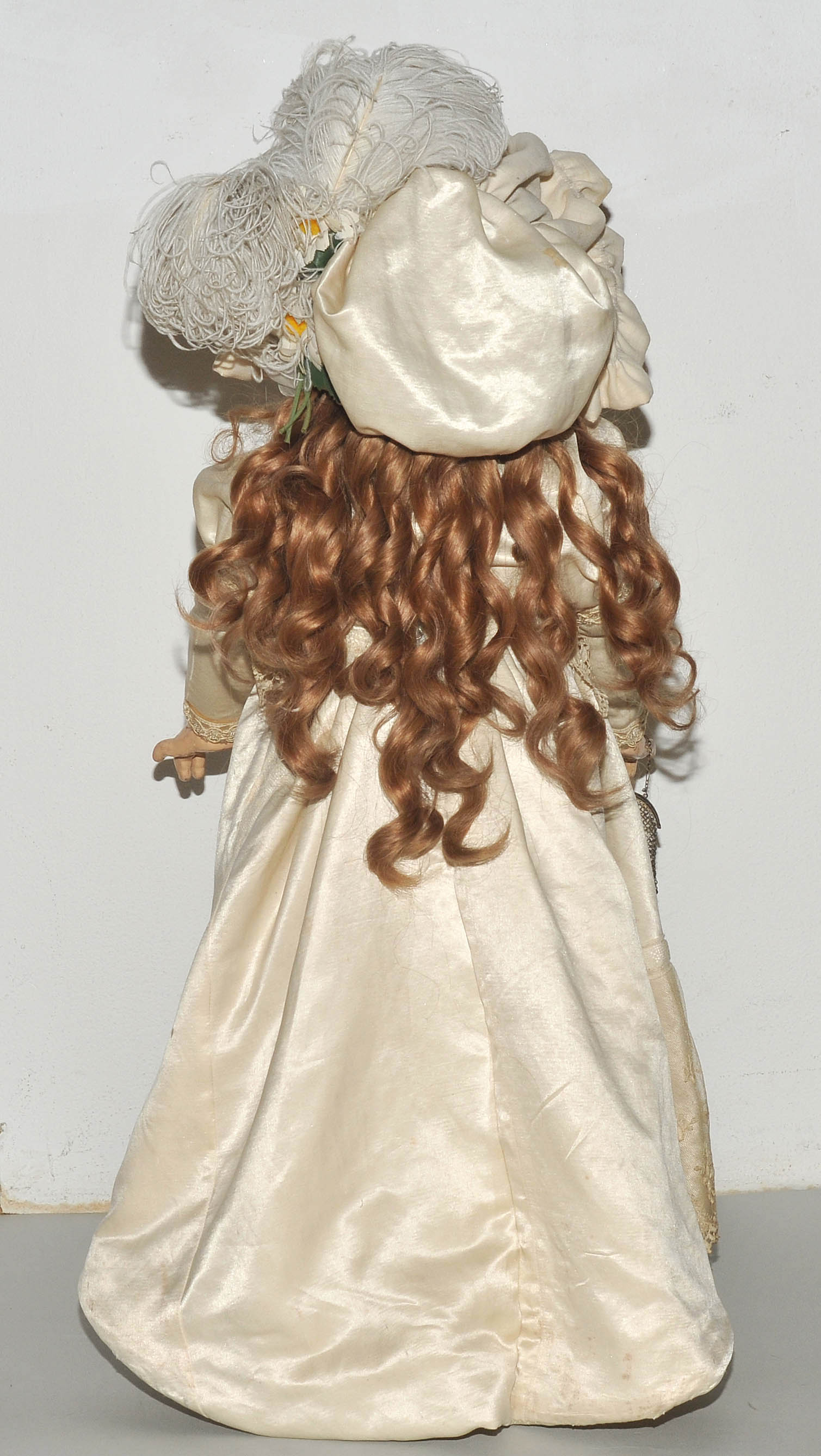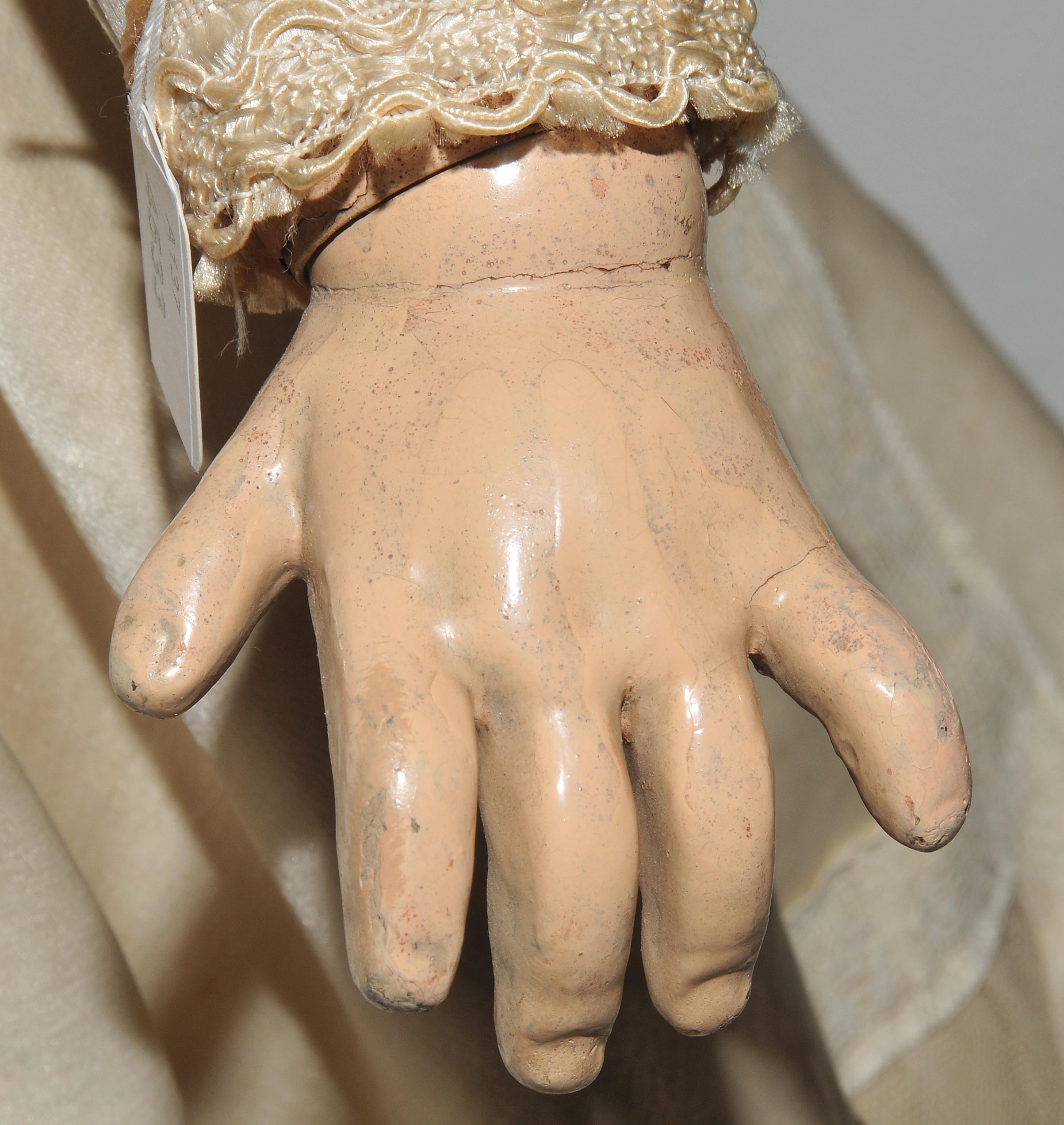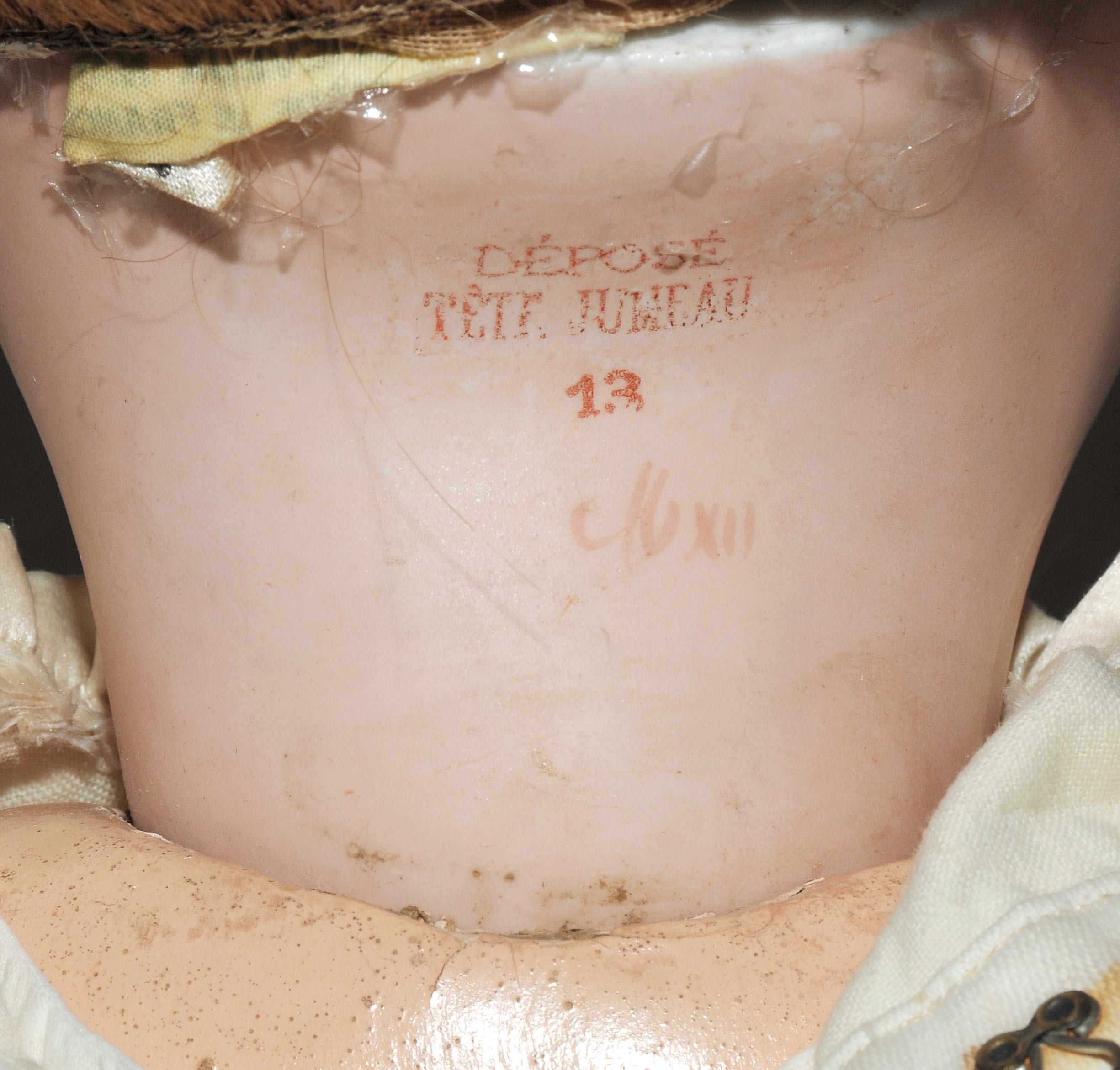 Frankreich, um 1880/90. Kurbelkopf mit blauen Paperweight-Augen und geschlossenem Mund aus Biscuit-Porzellan. Halsmarke: "DÉPOSÉ TÊTE JUMEAU 13" sowie Handzeichen des Malers. Gelenkkörper aus Masse. Grüne Stempelmarke: "BÉBÉ JUMEAU". Blonde Echthaarperücke mit Zapfenlocken ergänzt. Bekleidung im alten Stil. H 72 cm.