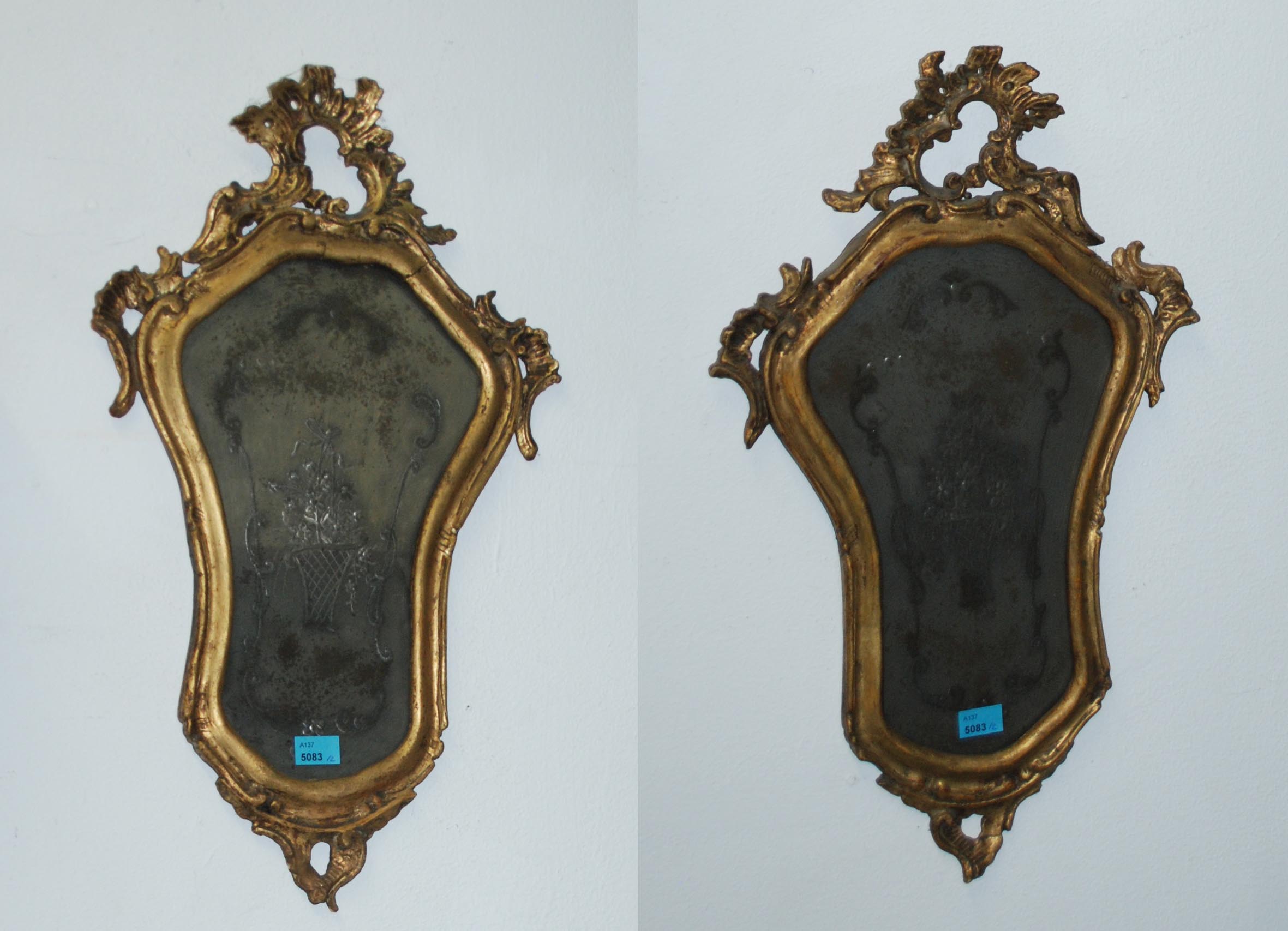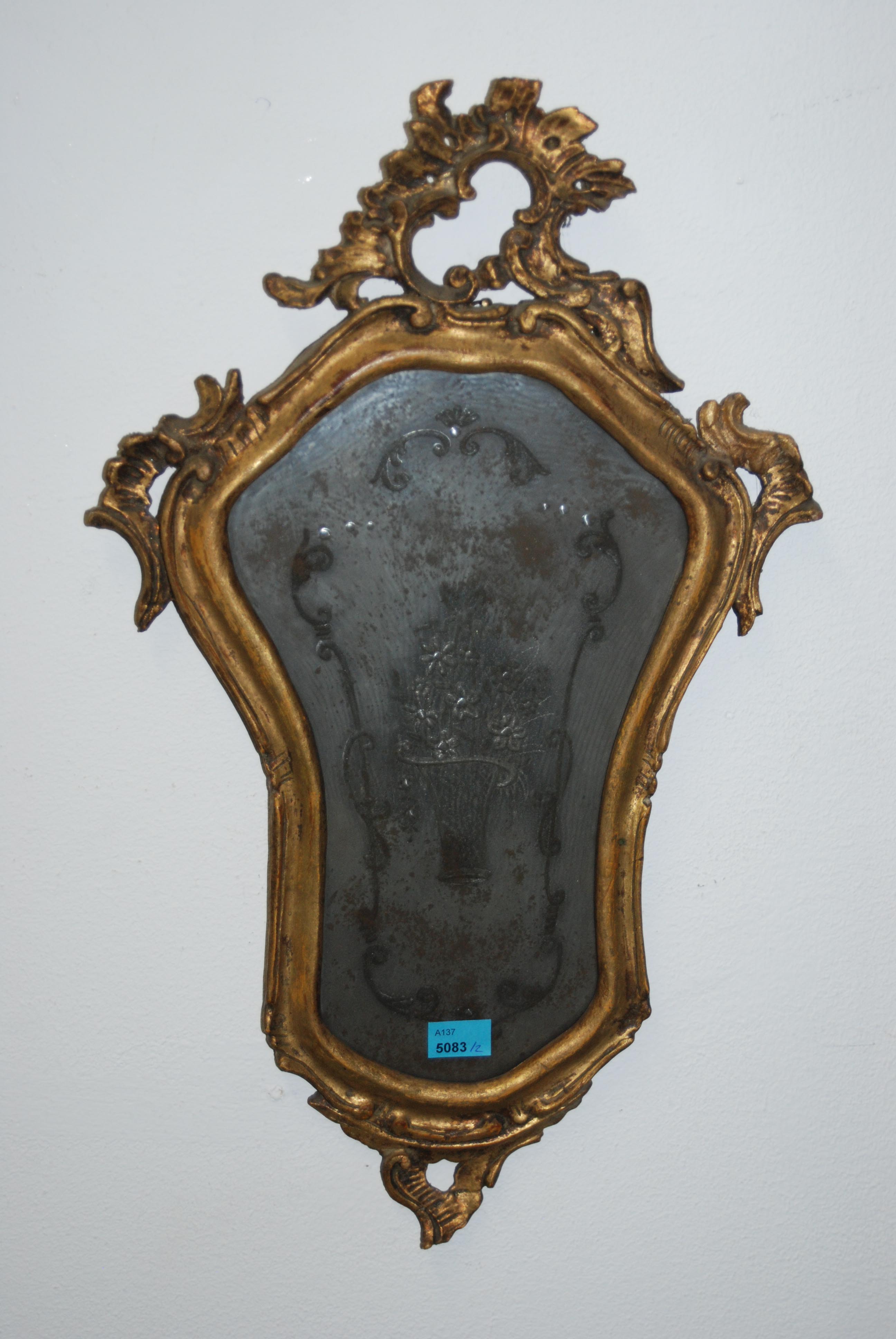 Rokokostil um 1900. Holz, geschnitzt und vergoldet. Bewegter Profilrahmen mit vegetabiler Bekrönung. Glas teilweise blind. Alters- und Gebrauchsspuren. 46x27 cm.