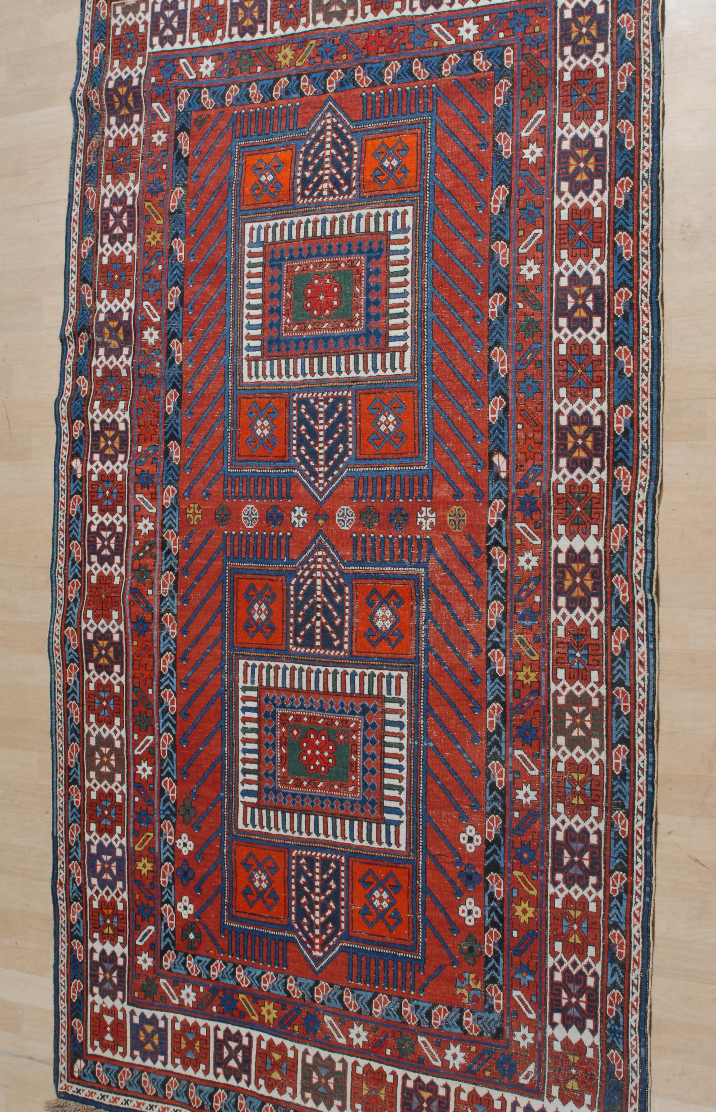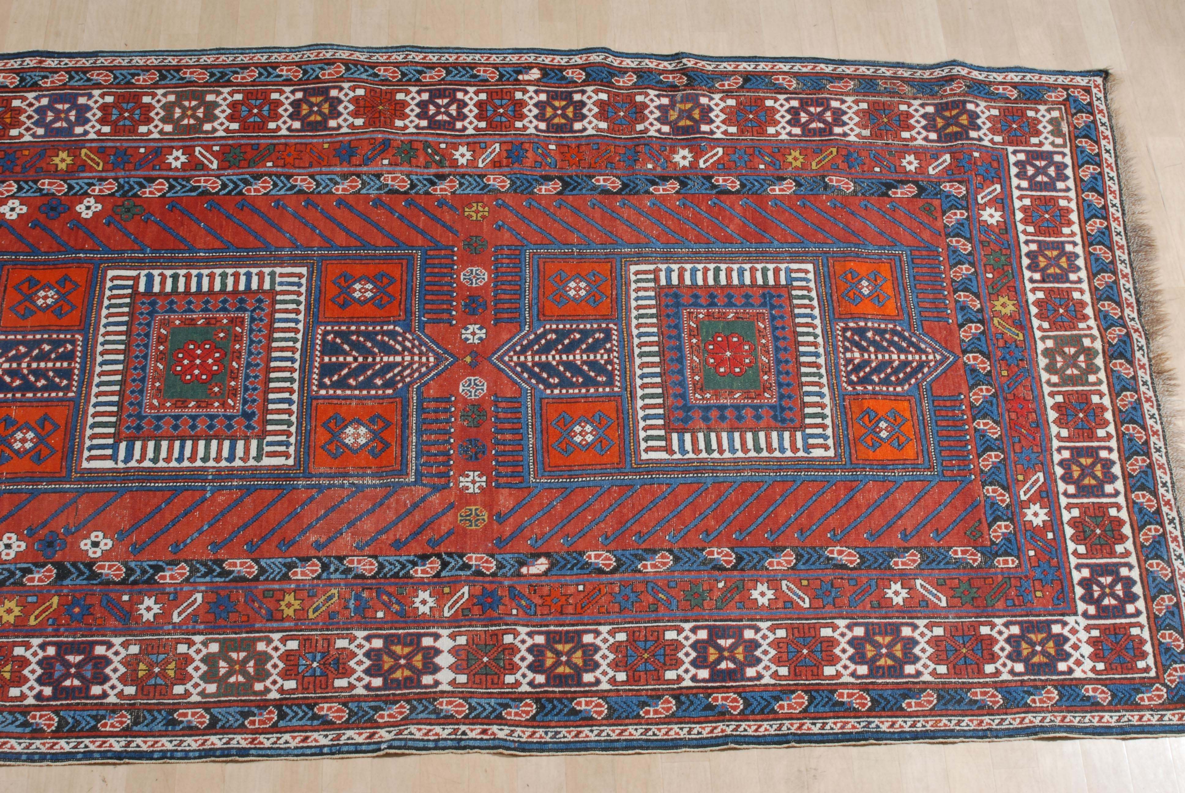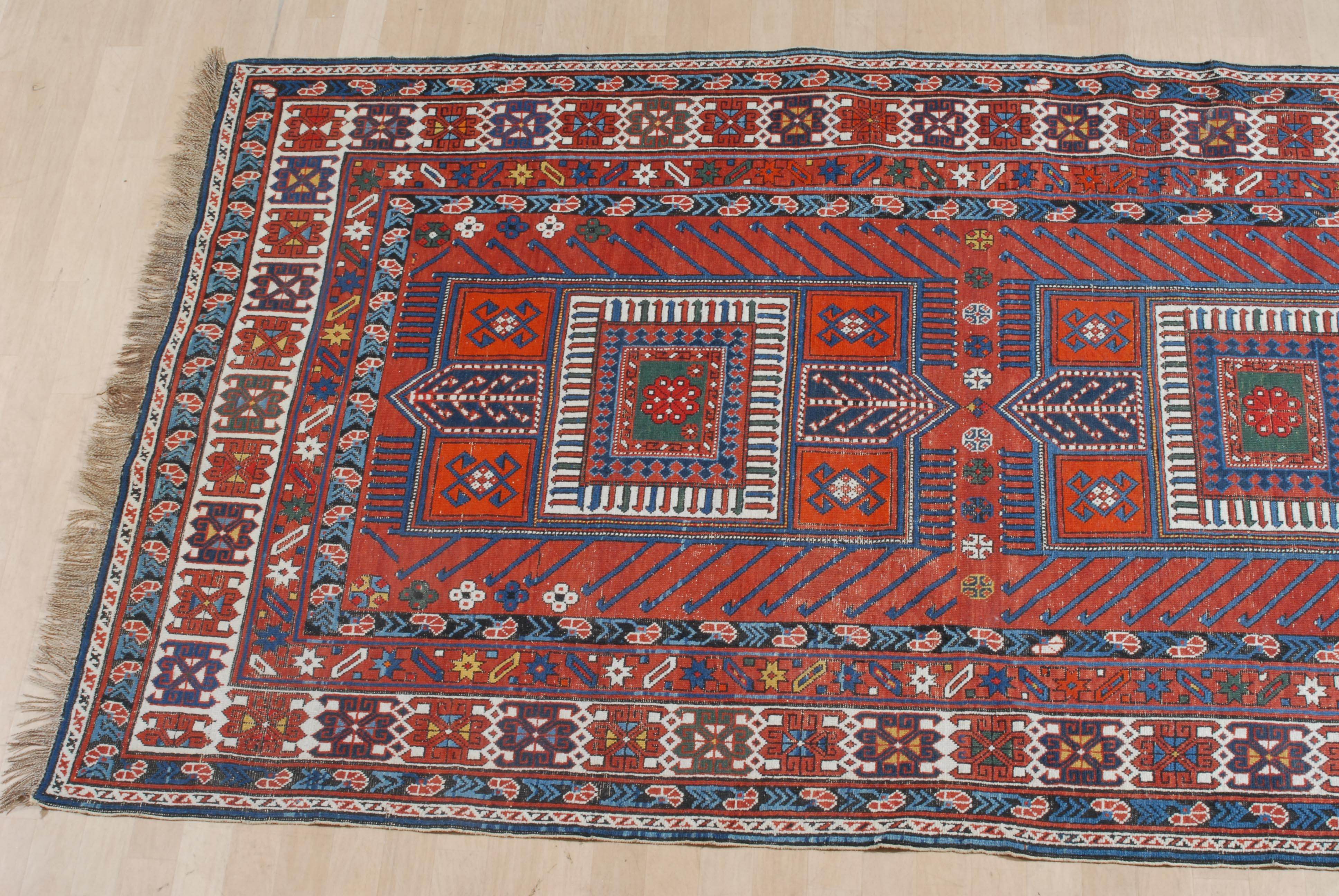 O-Kaukasus, um 1920. Im roten Mittelfeld sind 2 imposante rechteckige Medaillons angelegt, flankiert von Haken und dekorativen Blüten. 2 schwarze Nelkenborten säumen die weisse breite, mit vierblättrigen Palmetten belegte Hauptbordüre. In der Bordüre befindet sich ein Schnitt, der repariert wurde. Gebrauchsspuren. 130x250 cm (ft. 4.3x8.3).