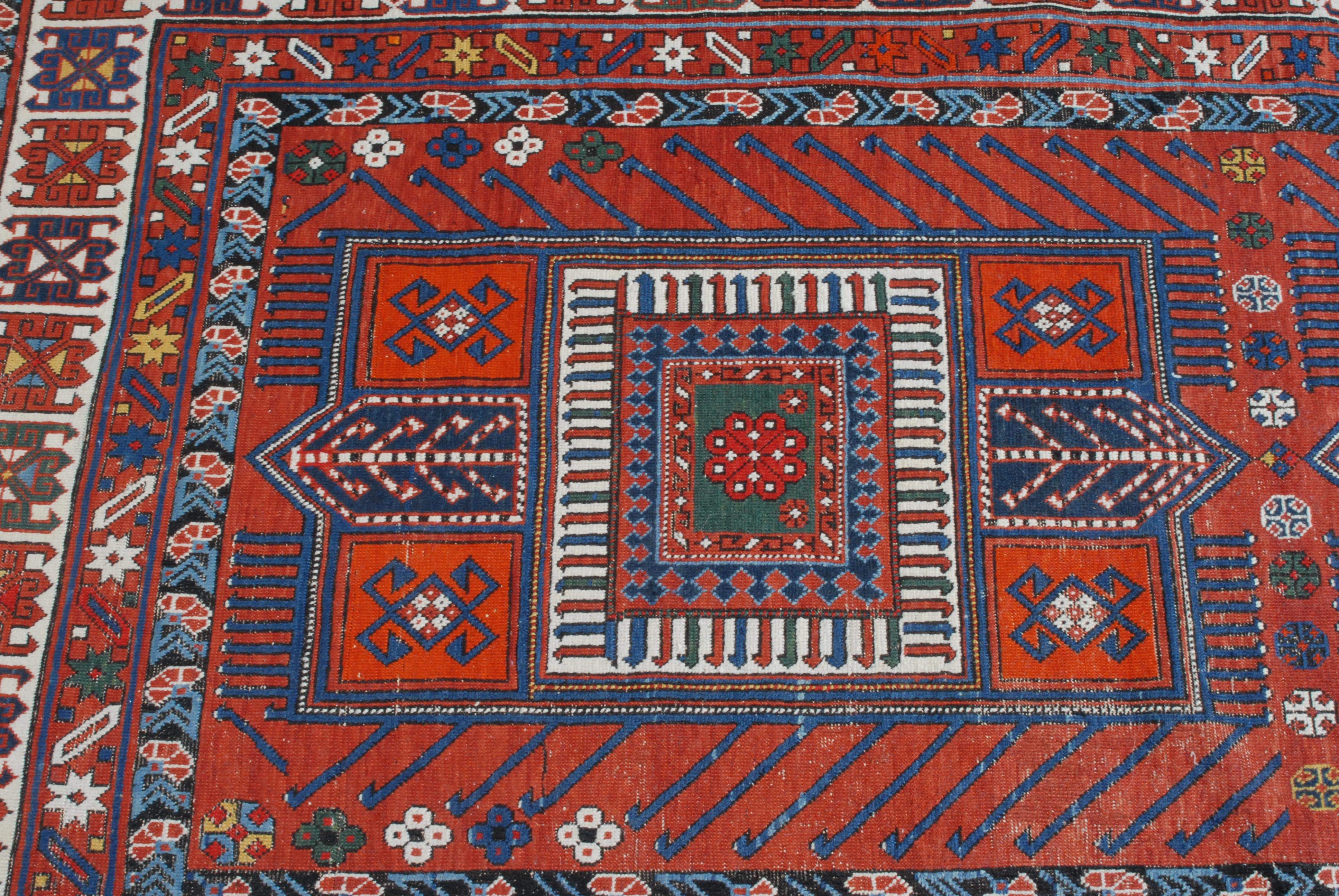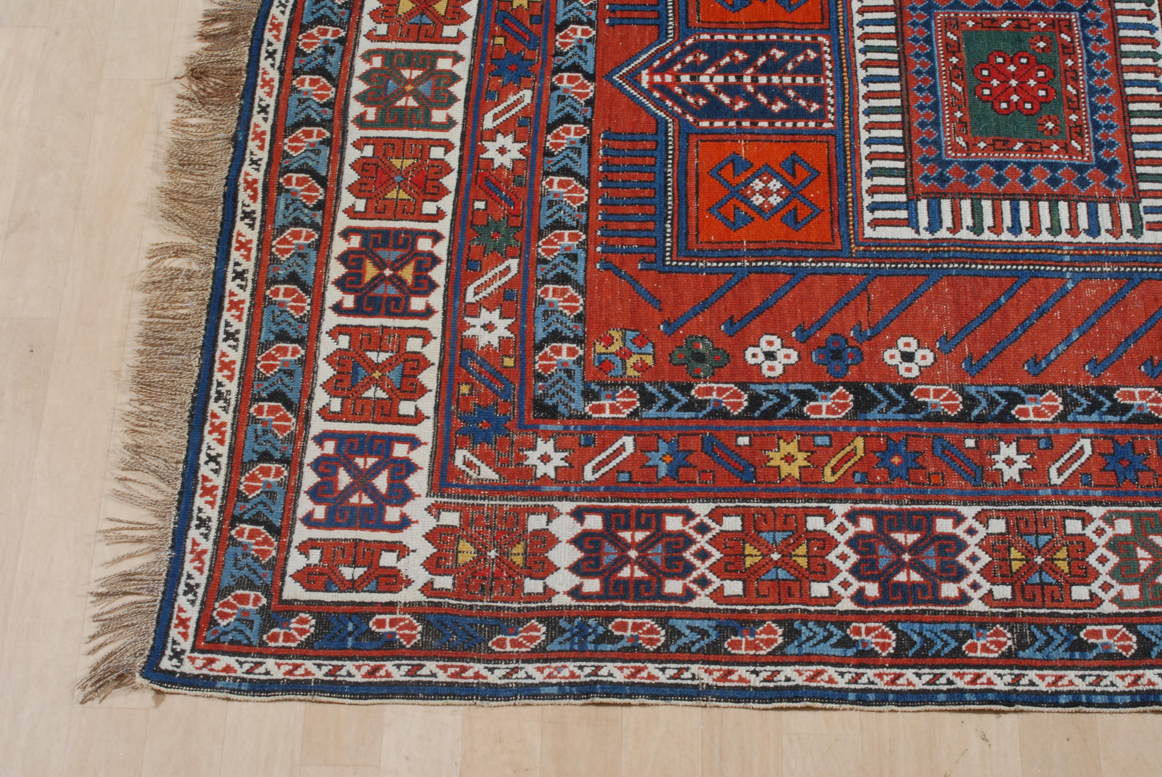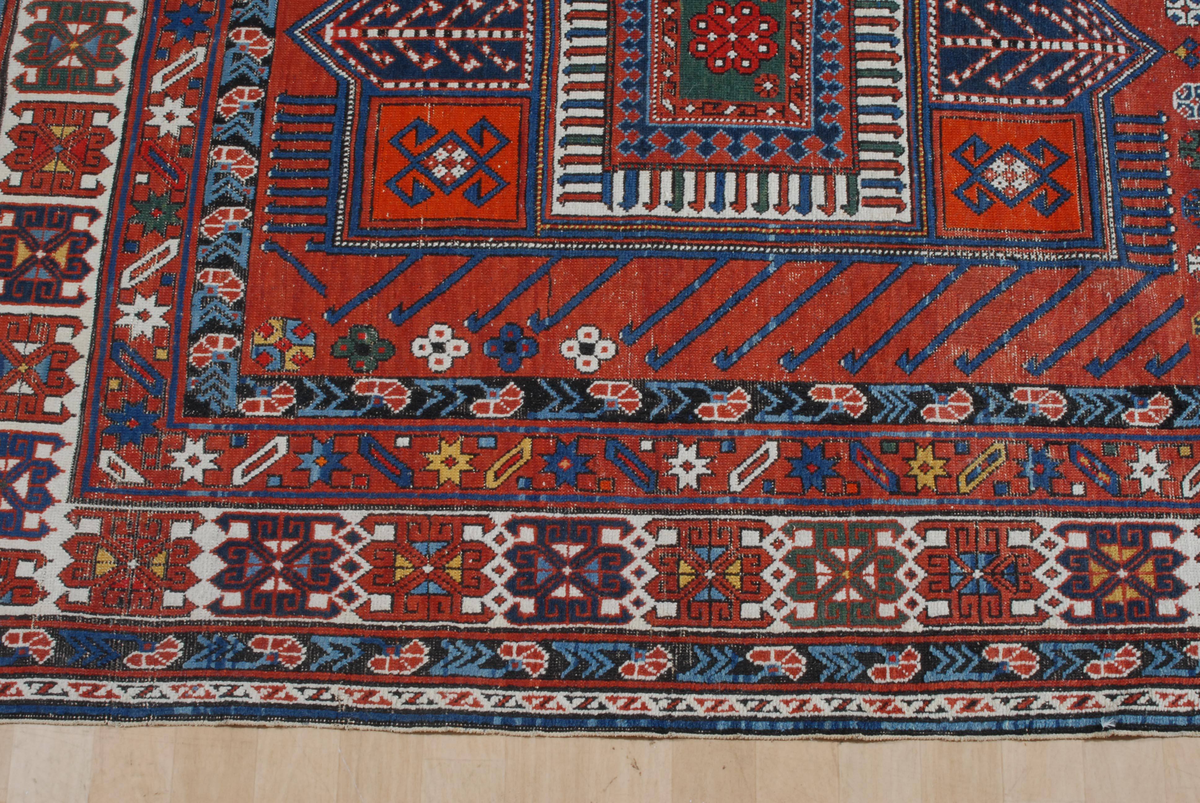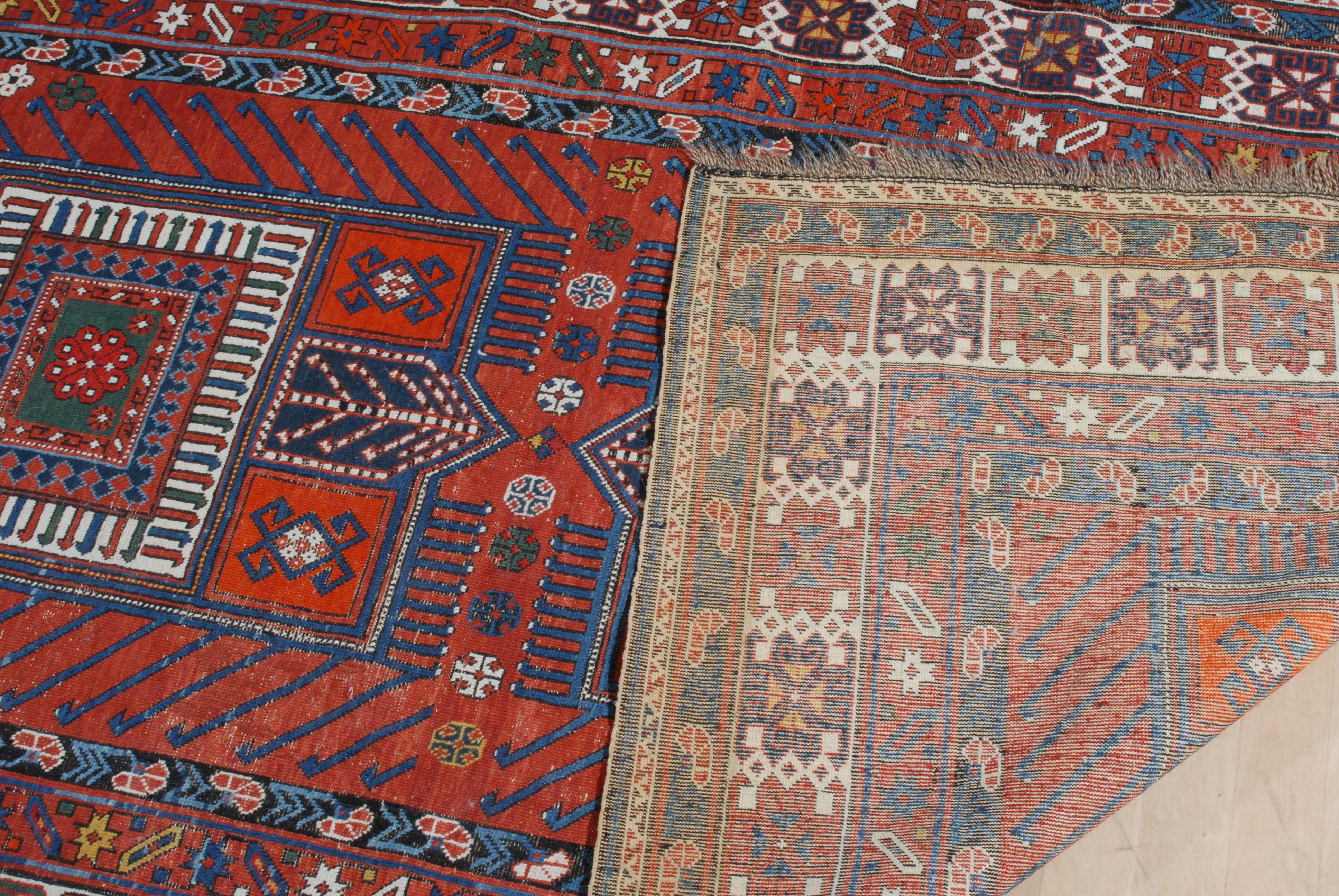 O-Kaukasus, um 1920. Im roten Mittelfeld sind 2 imposante rechteckige Medaillons angelegt, flankiert von Haken und dekorativen Blüten. 2 schwarze Nelkenborten säumen die weisse breite, mit vierblättrigen Palmetten belegte Hauptbordüre. In der Bordüre befindet sich ein Schnitt, der repariert wurde. Gebrauchsspuren. 130x250 cm (ft. 4.3x8.3).