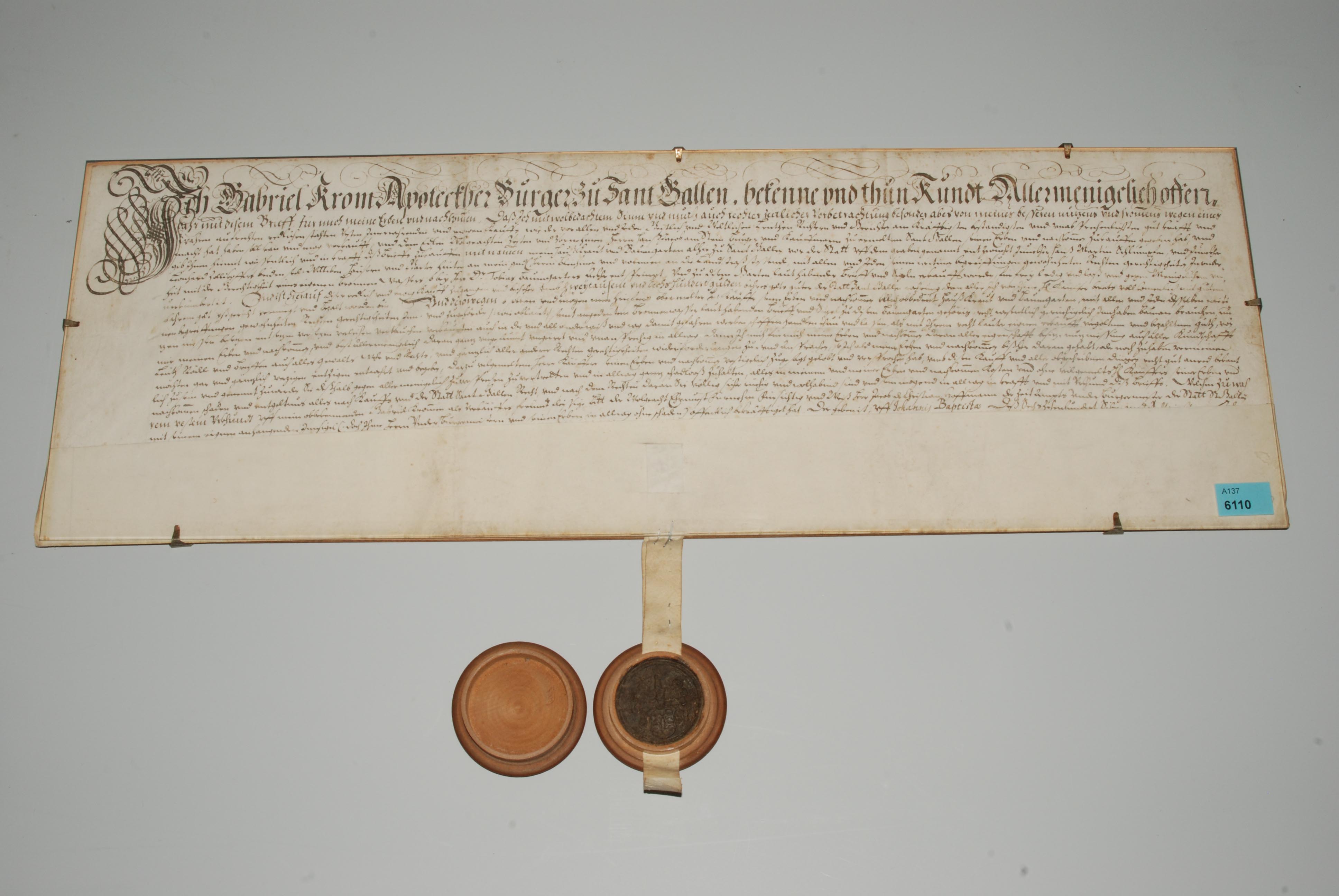 Kaufbrief, zwischen dem Apotheker Gabriel Krom und dem Kaufmann Hans Jakob am Stein. Ein Haus mit Kraut- und Baumgarten und ein Brunnenwasserrecht auf dem Graben vor der Stadt St. Gallen betreffend. Handschrift auf Pergament, dat., 24. Juni 1687. Qu'folio. Mit Wachssiegel in Holzkapsel J.Ch. Hoffmann. Unter Glas.