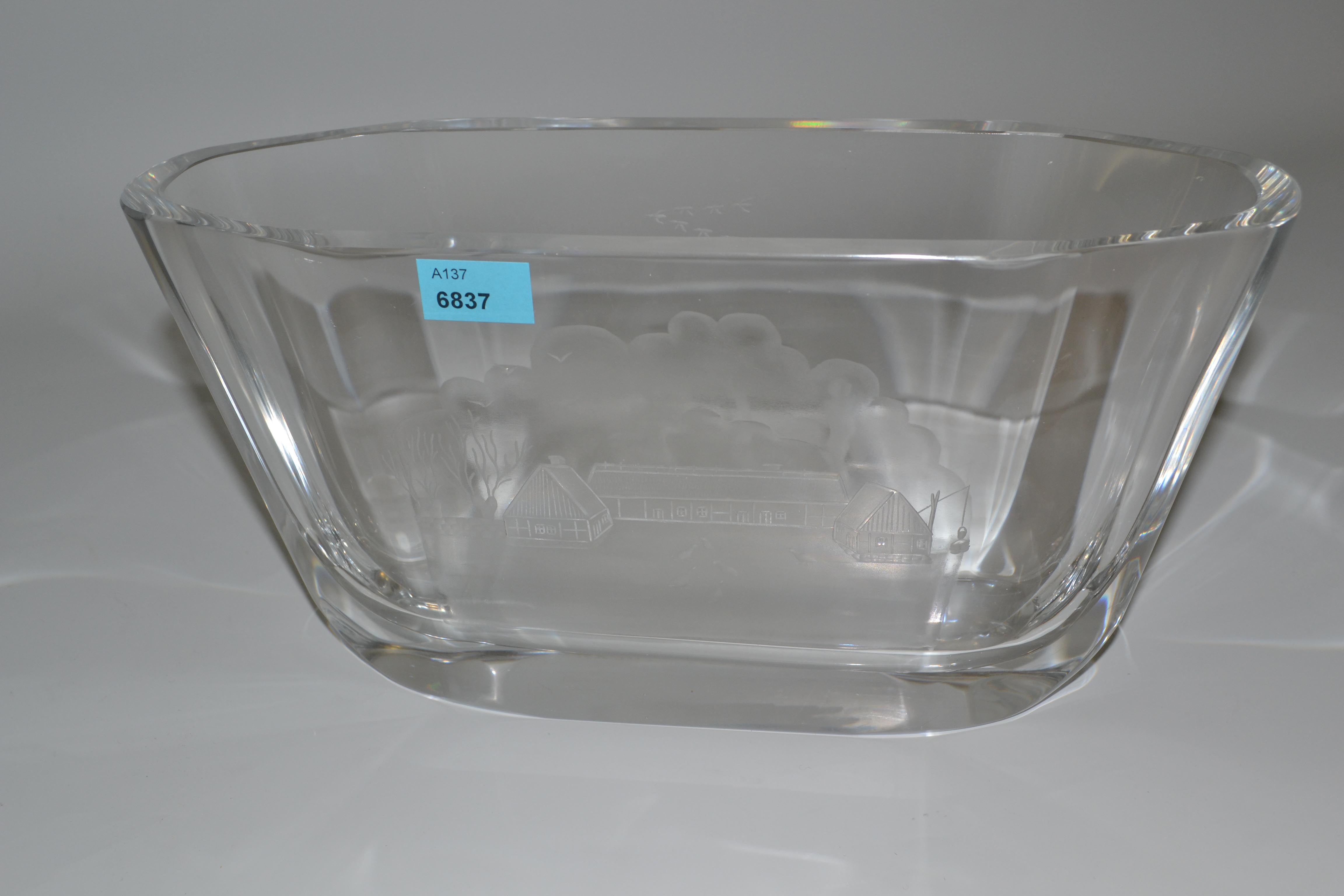 Farbloses Kristallglas, Bauernhof mit Federvieh bzw. Figur mit Gänsen in Mattschnitt. Bezeichnet: ORREFORS HALD 2525 B.L.A.R. H 13,5 cm.