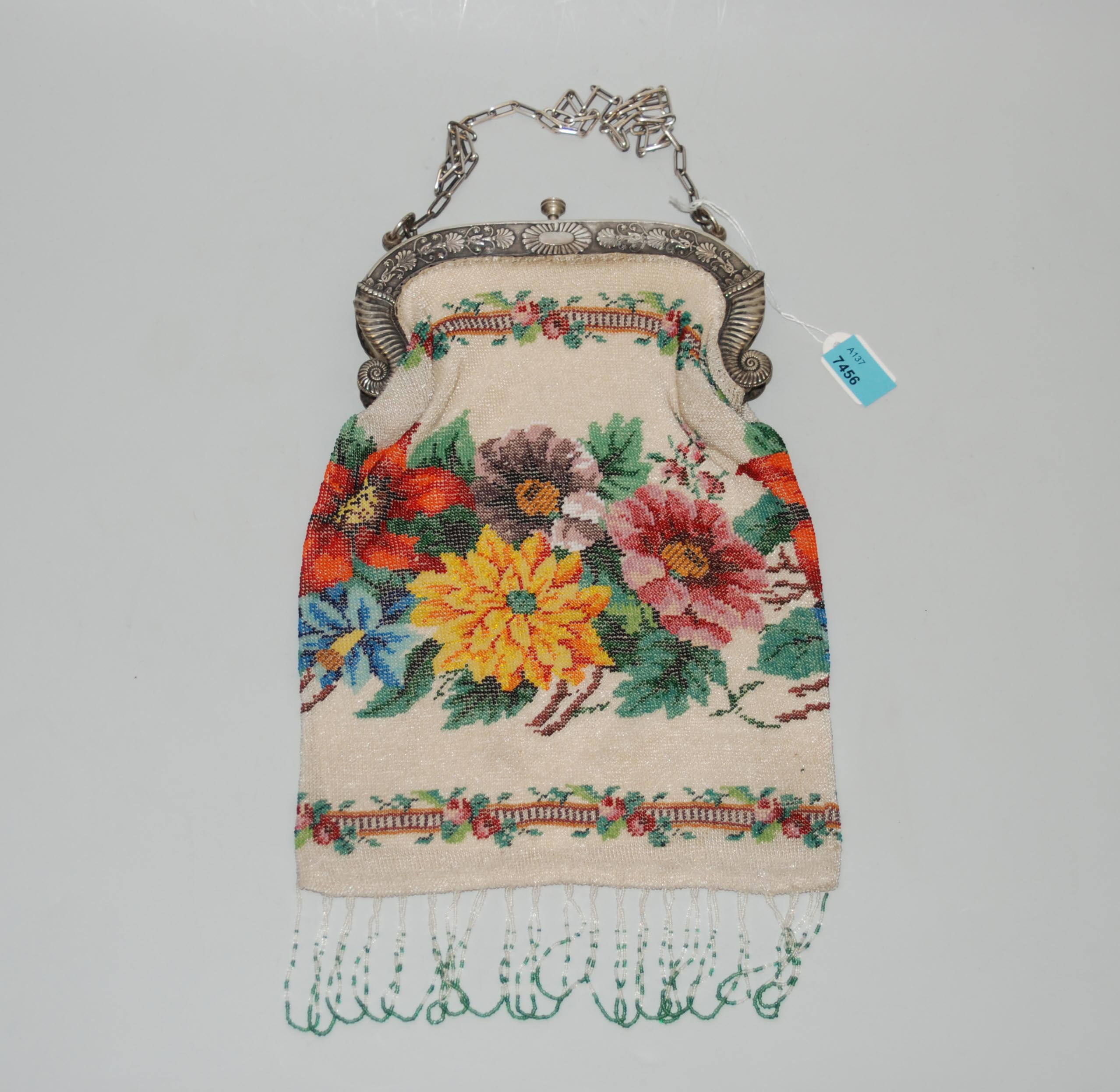Heilbronn, um 1900. Mit Glasperlen bestickte Tasche mit reliefiertem Silberbügel. Meistermarke "Bruckmann & Söhne". H 25 cm.